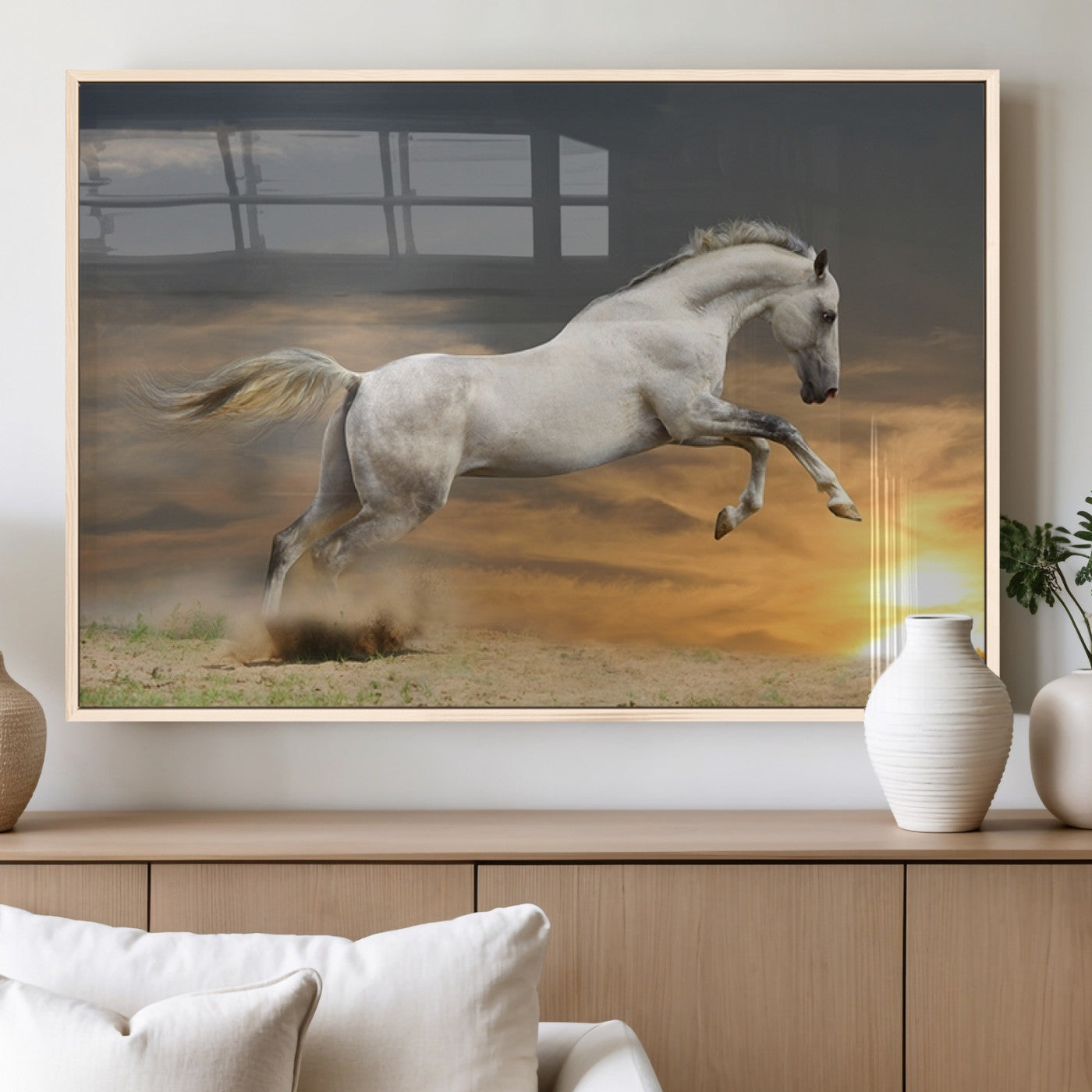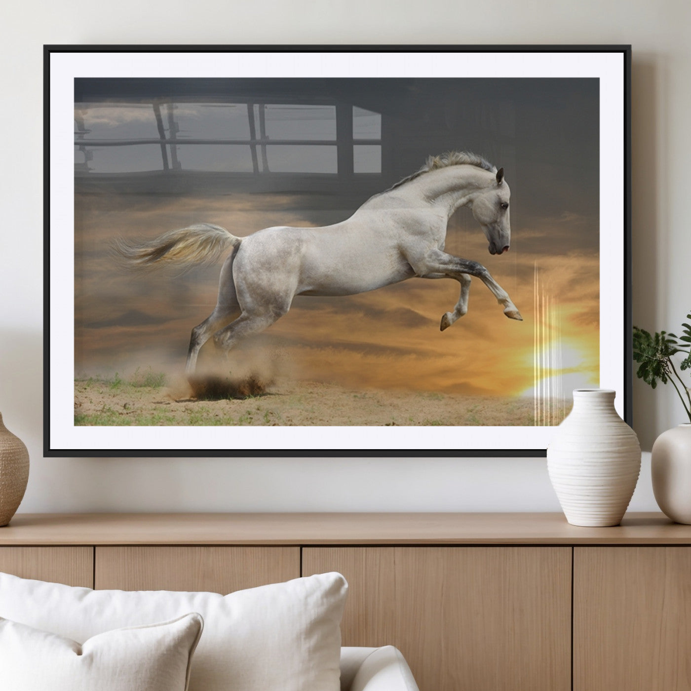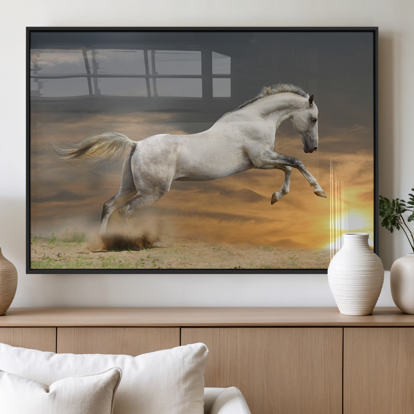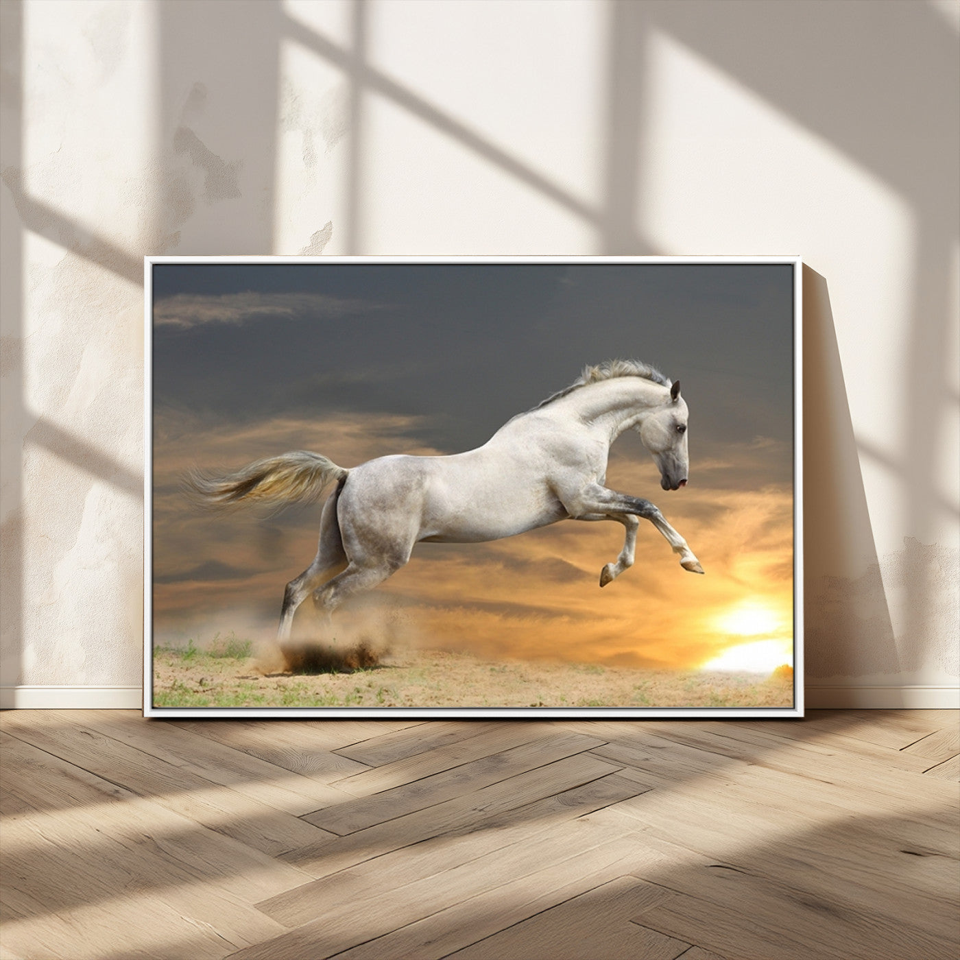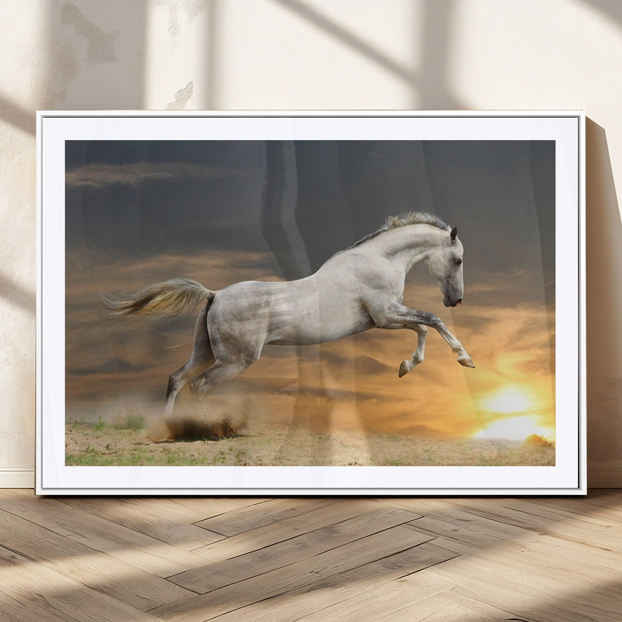 Large Wall Art Canvas Print – White Jumping Horse Sunset Scene Animal Artwork for Home, Office, Living Room Decor