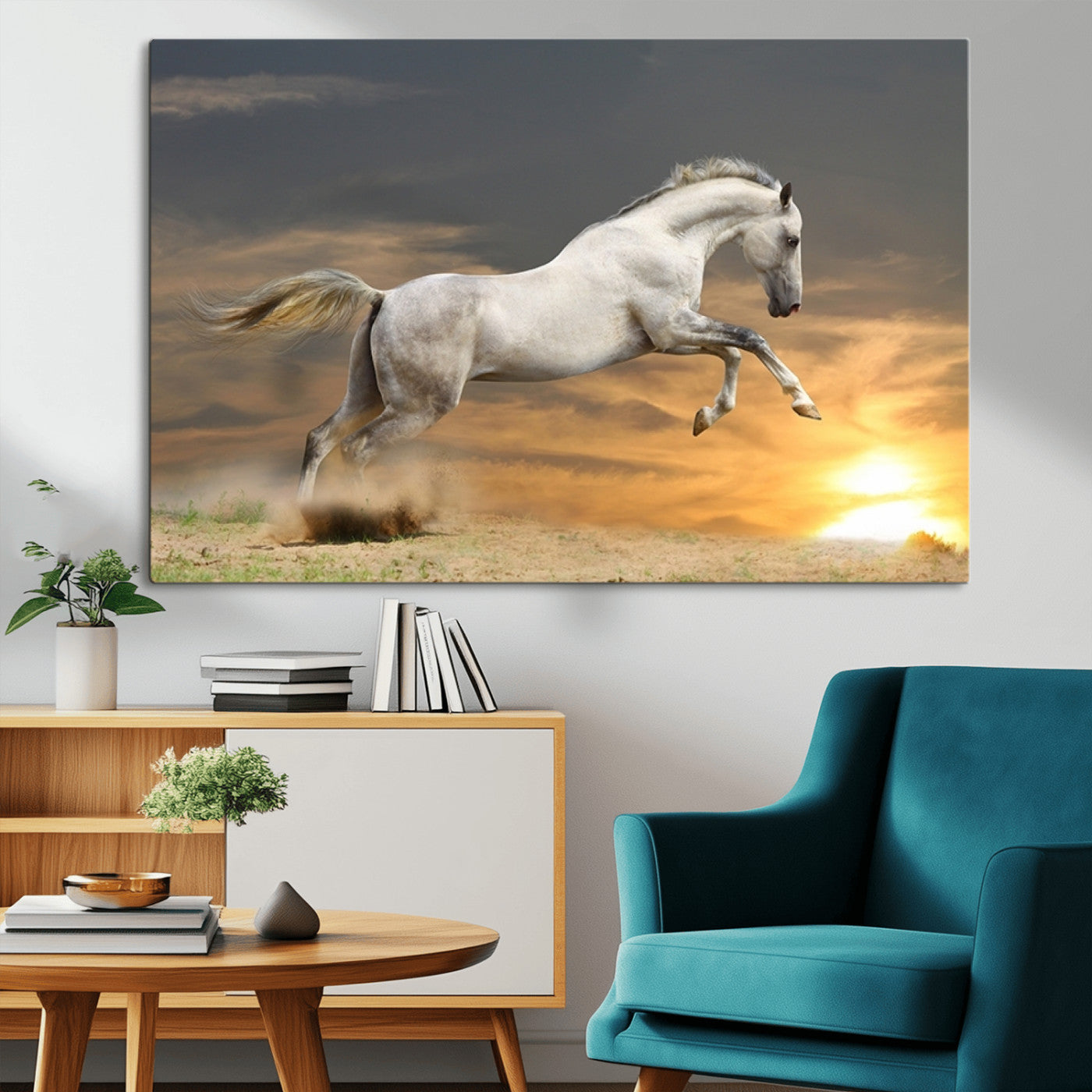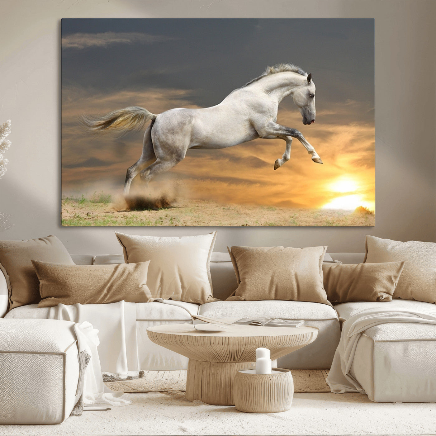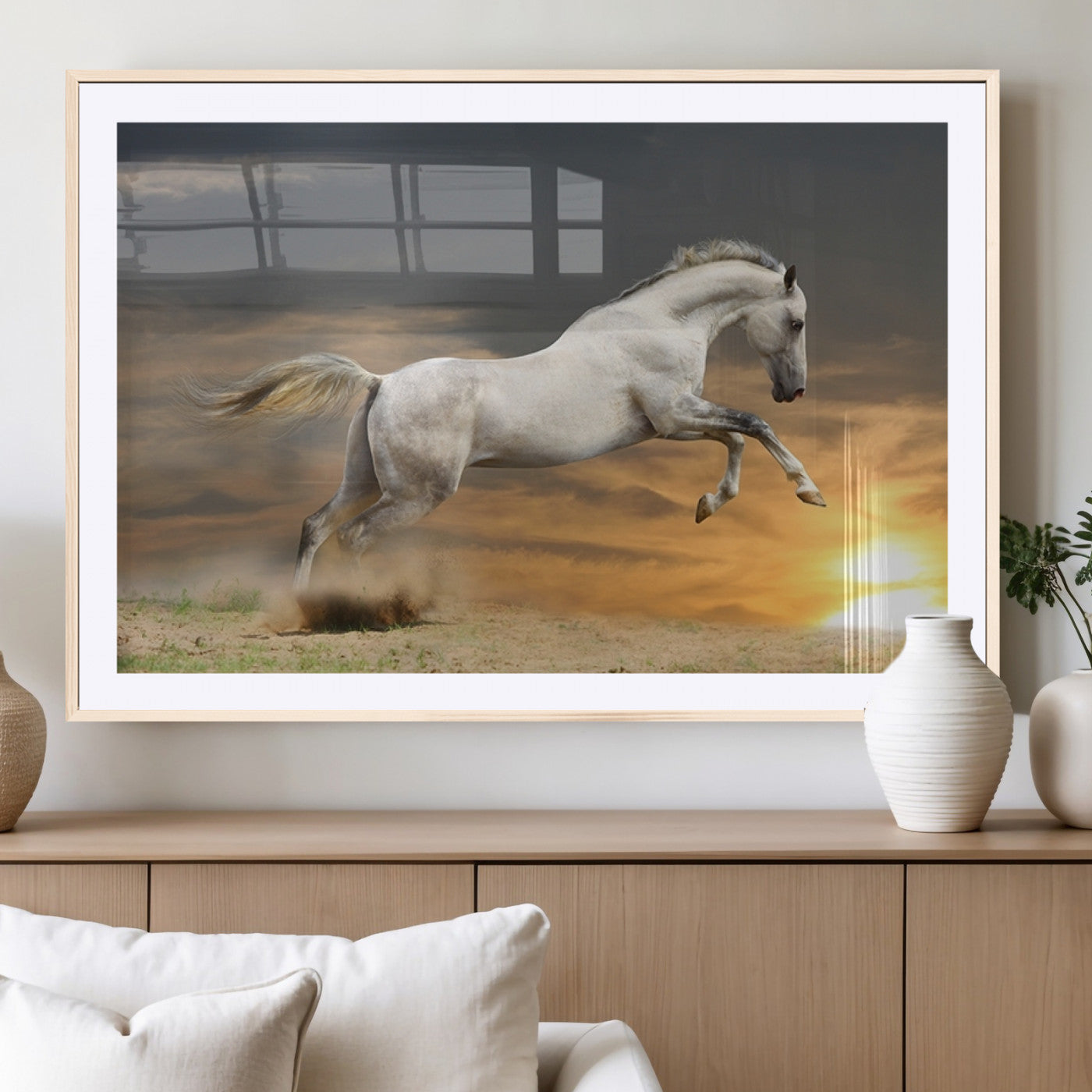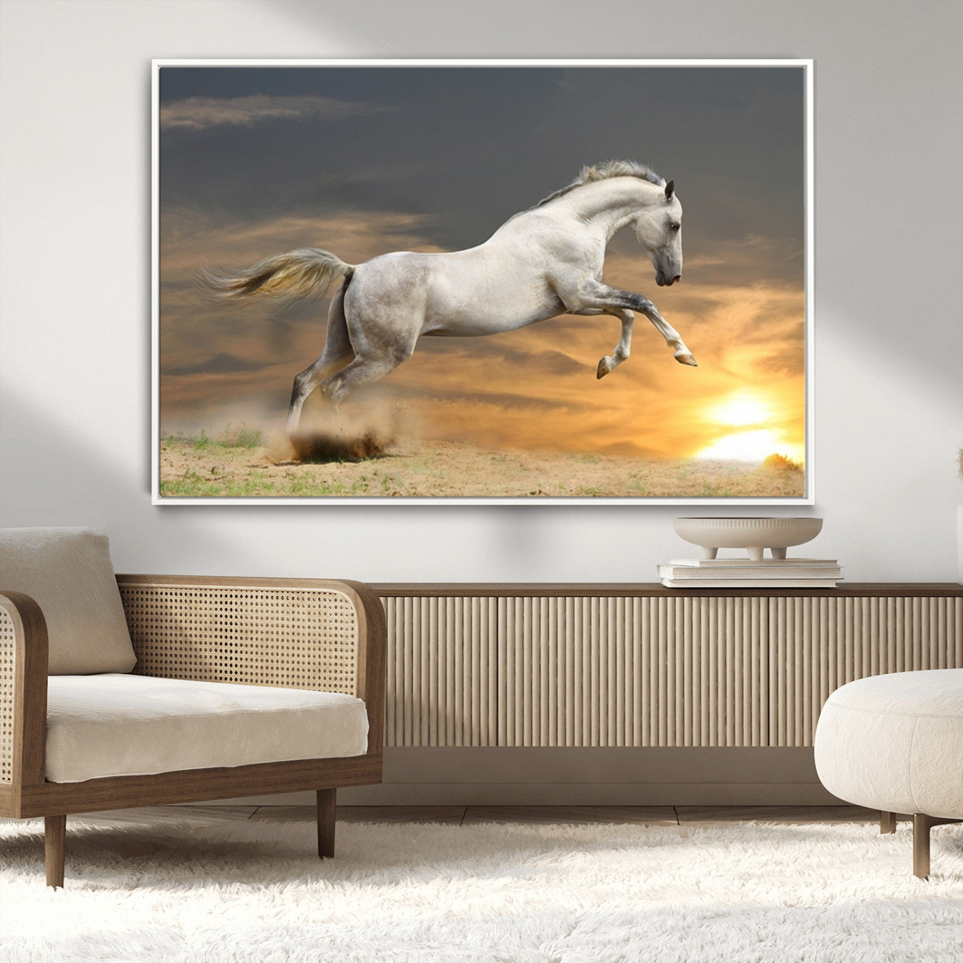 Large Wall Art Canvas Print – White Jumping Horse Sunset Scene Animal Artwork for Home, Office, Living Room Decor