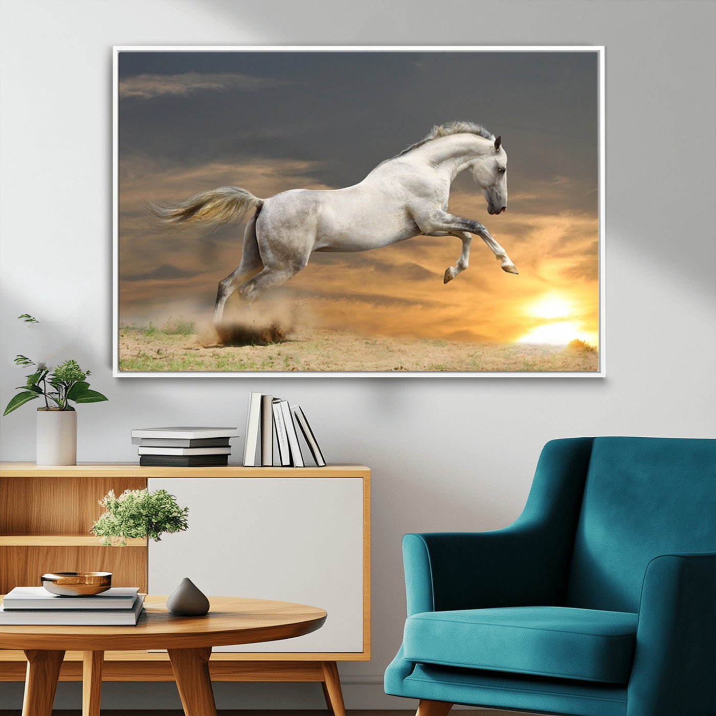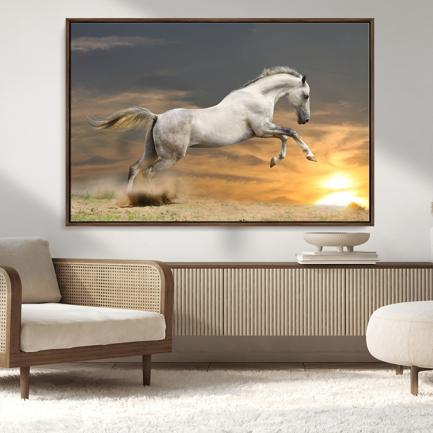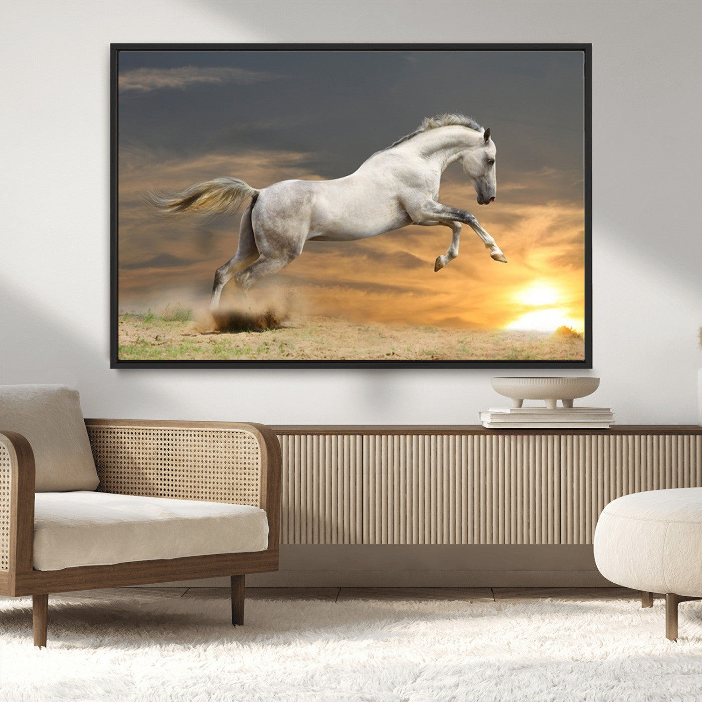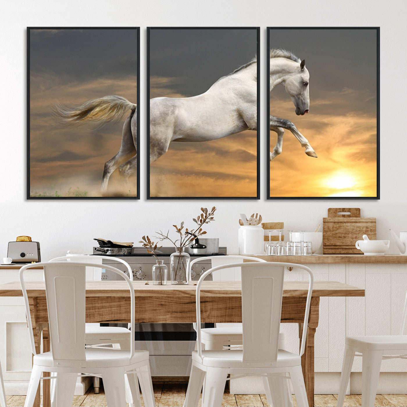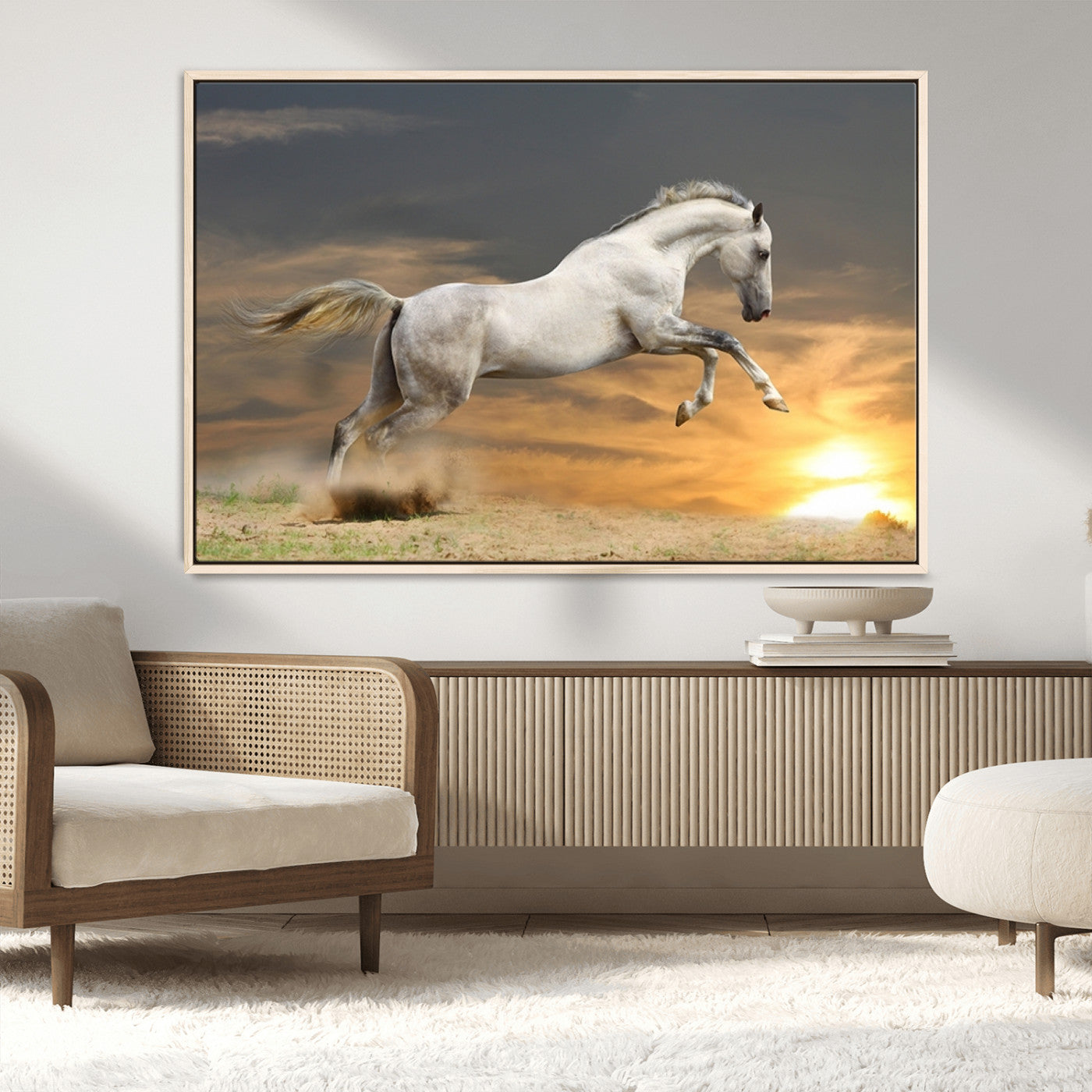 Large Wall Art Canvas Print – White Jumping Horse Sunset Scene Animal Artwork for Home, Office, Living Room Decor
