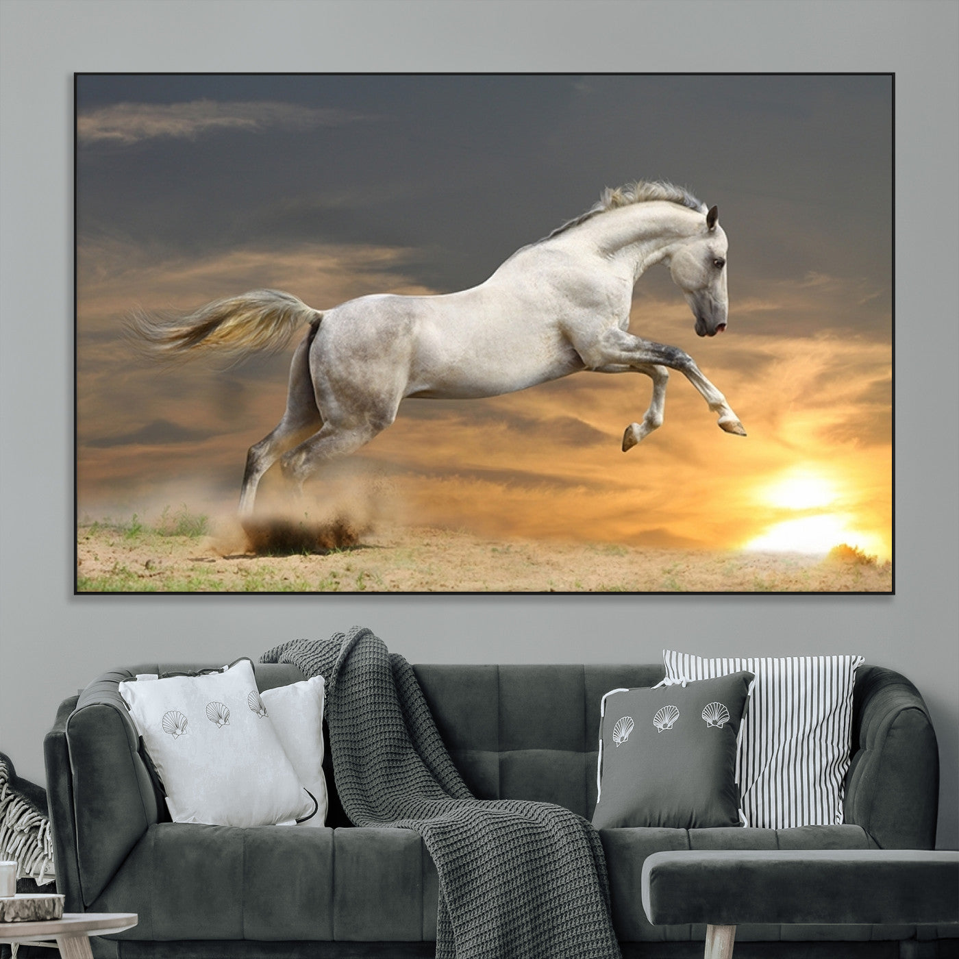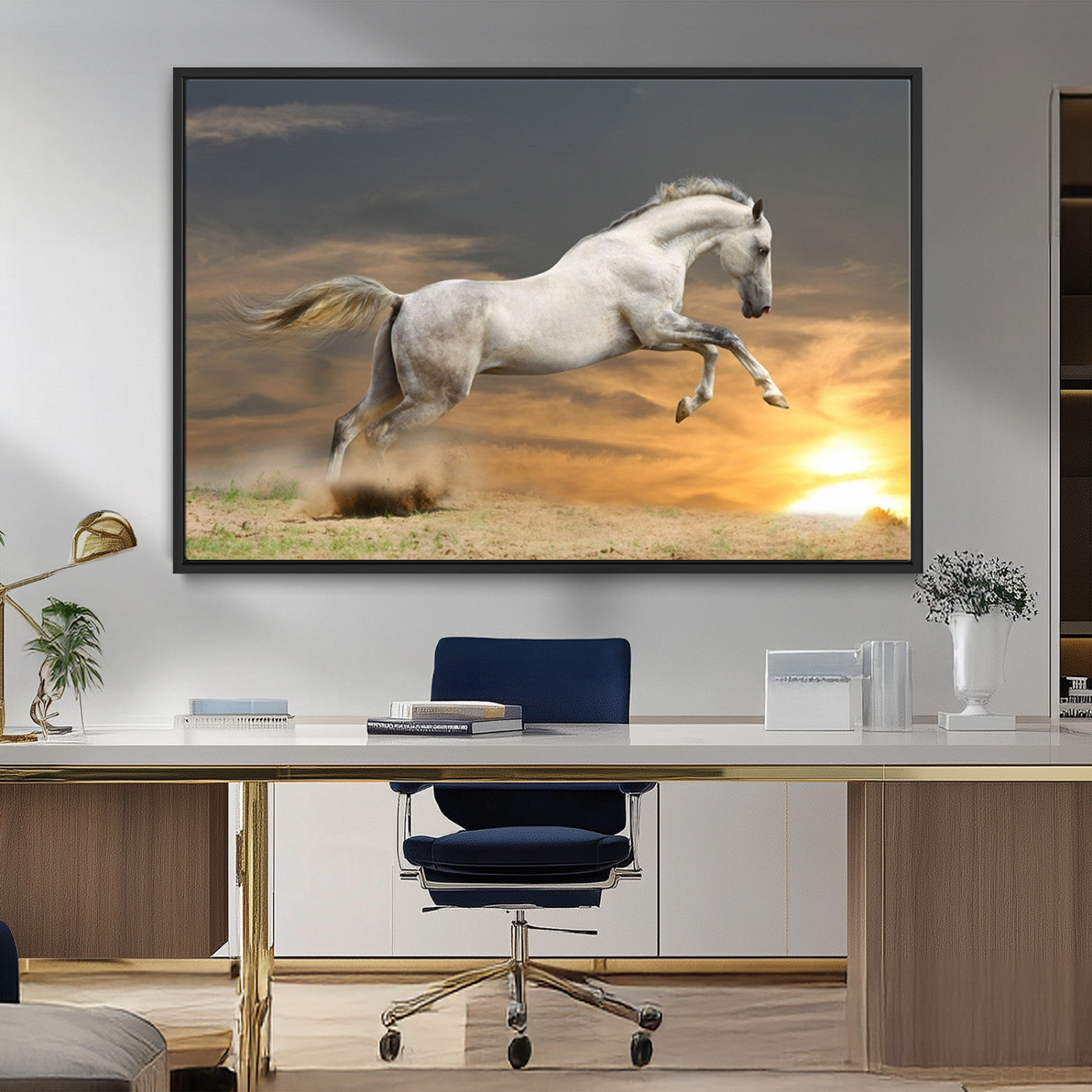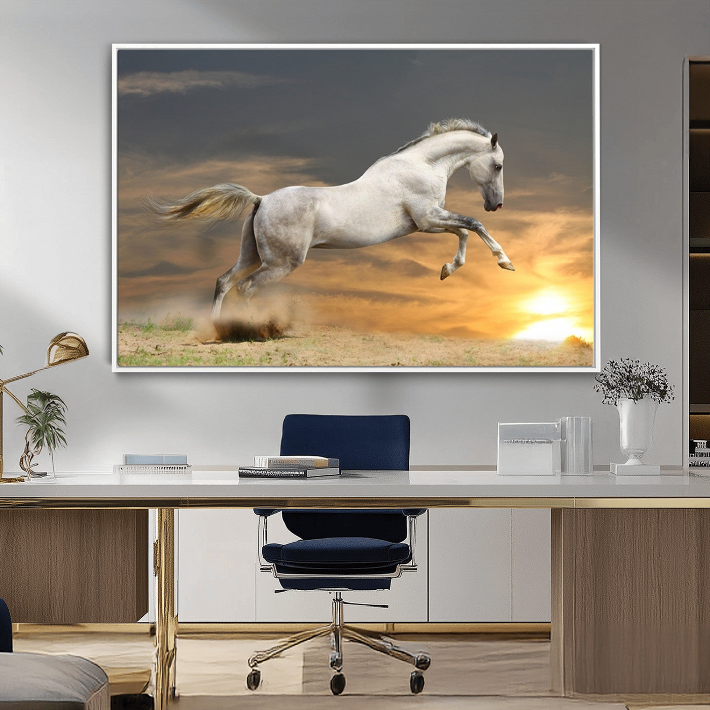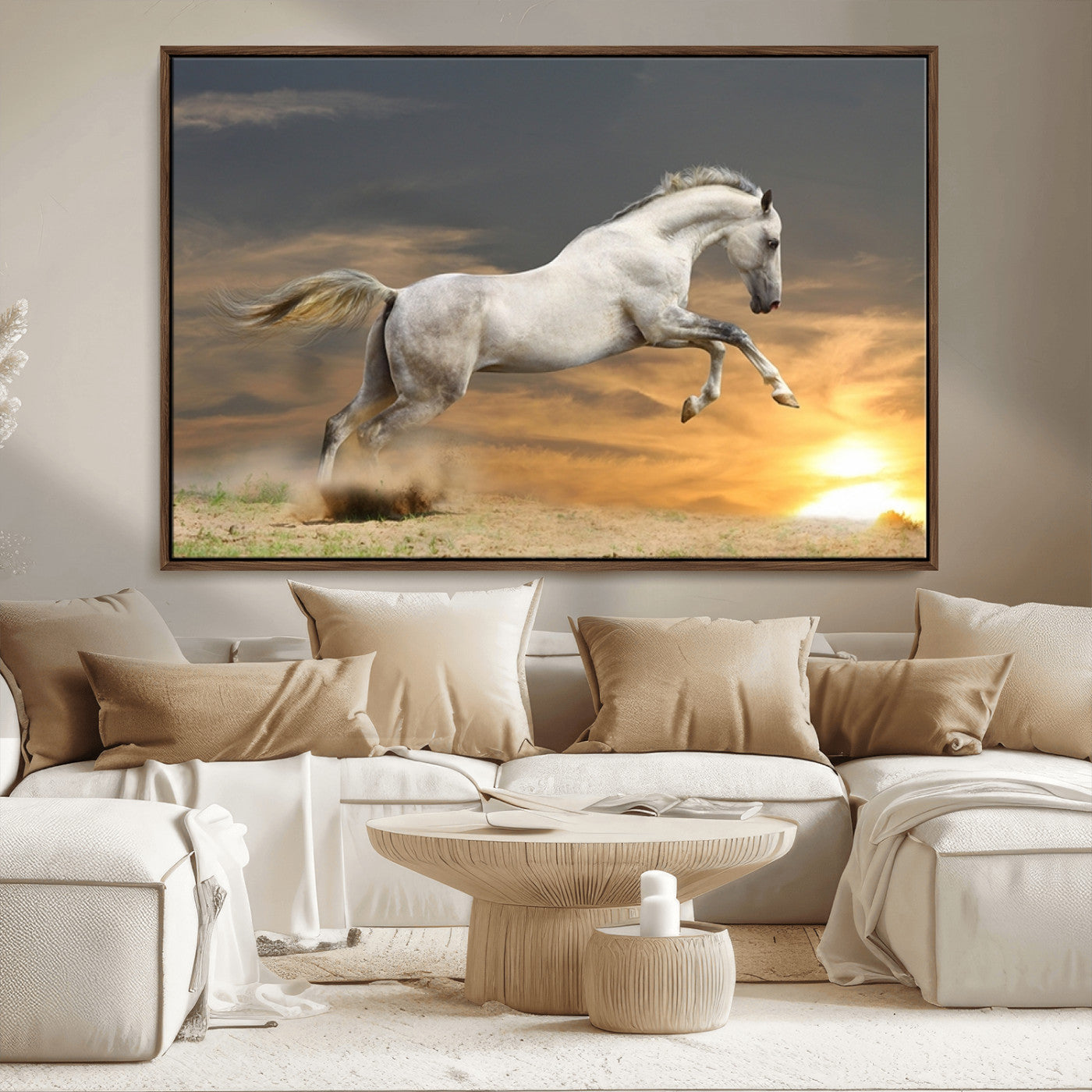 Large Wall Art Canvas Print – White Jumping Horse Sunset Scene Animal Artwork for Home, Office, Living Room Decor