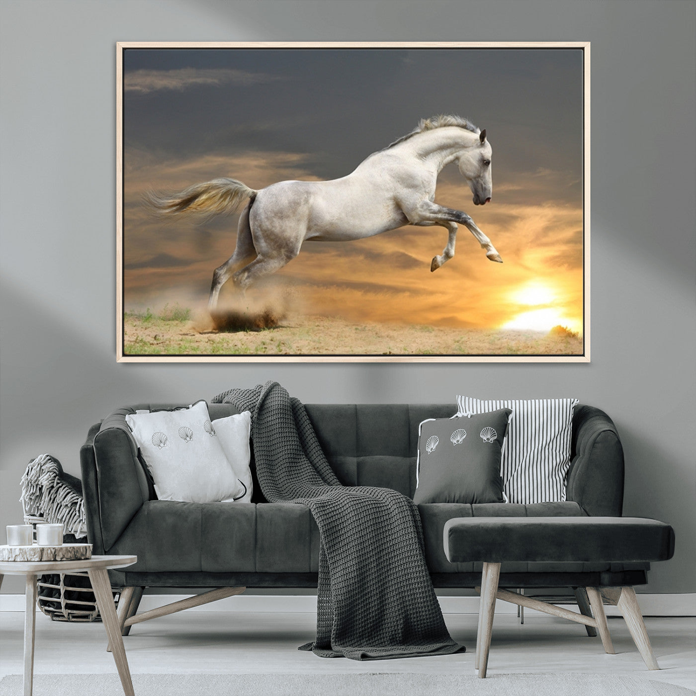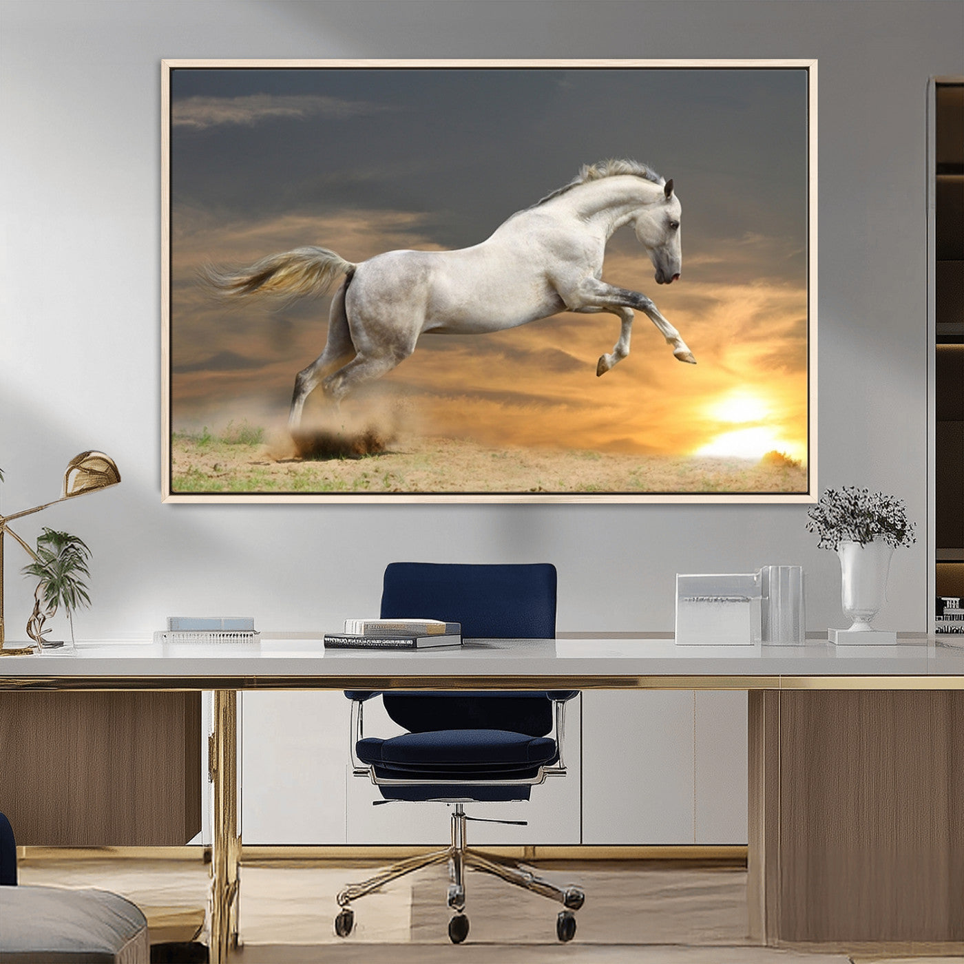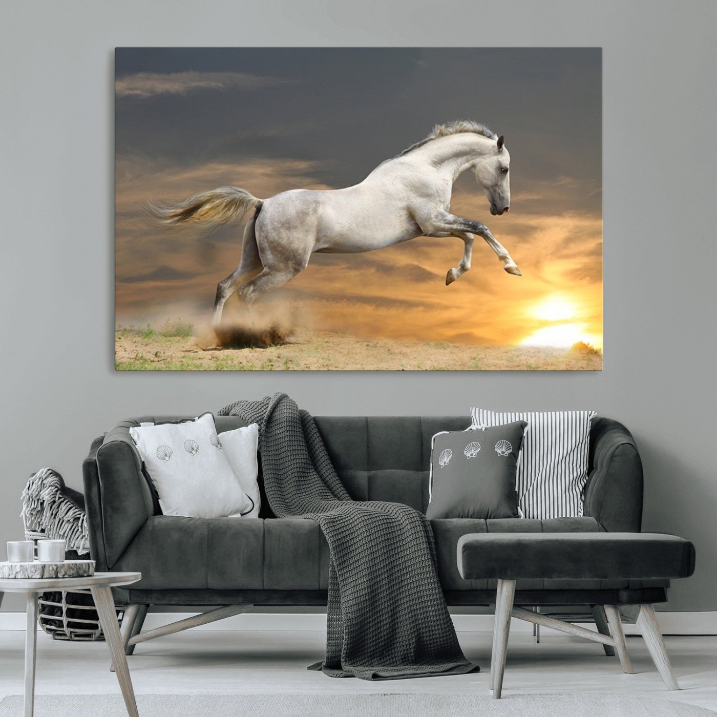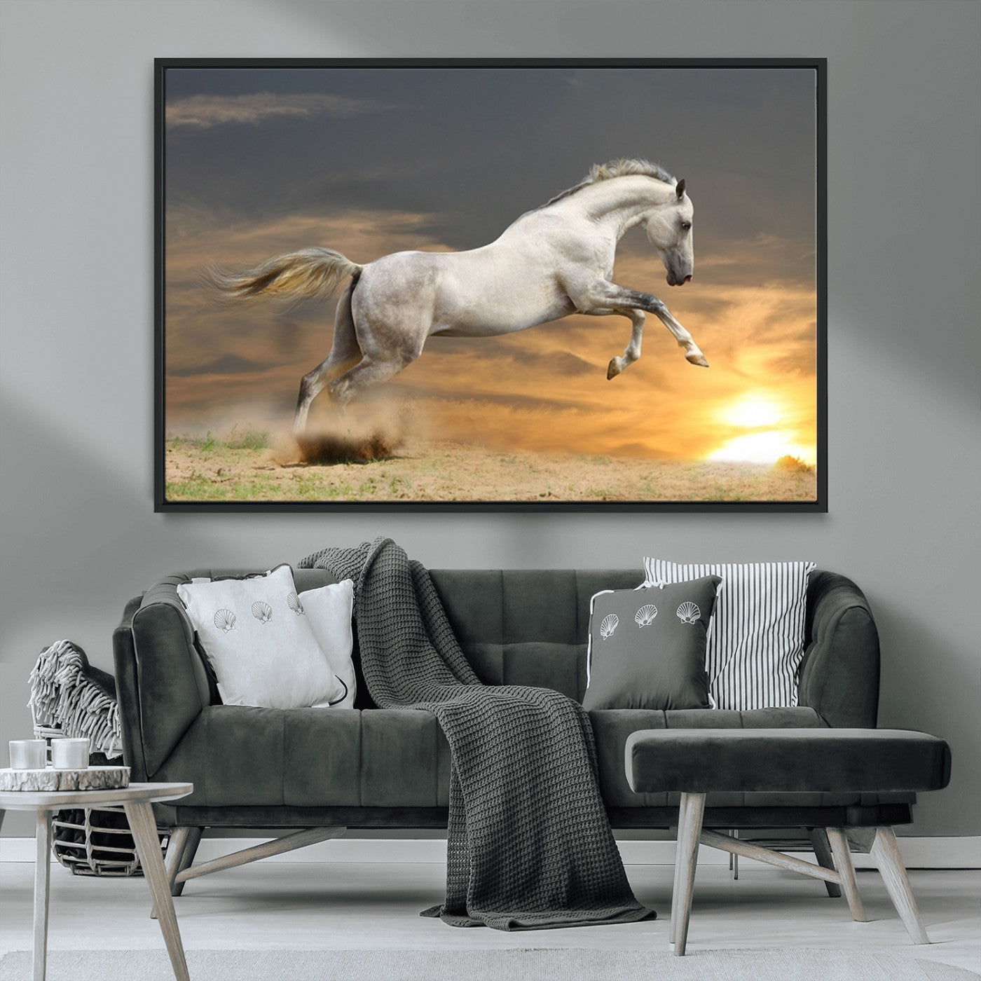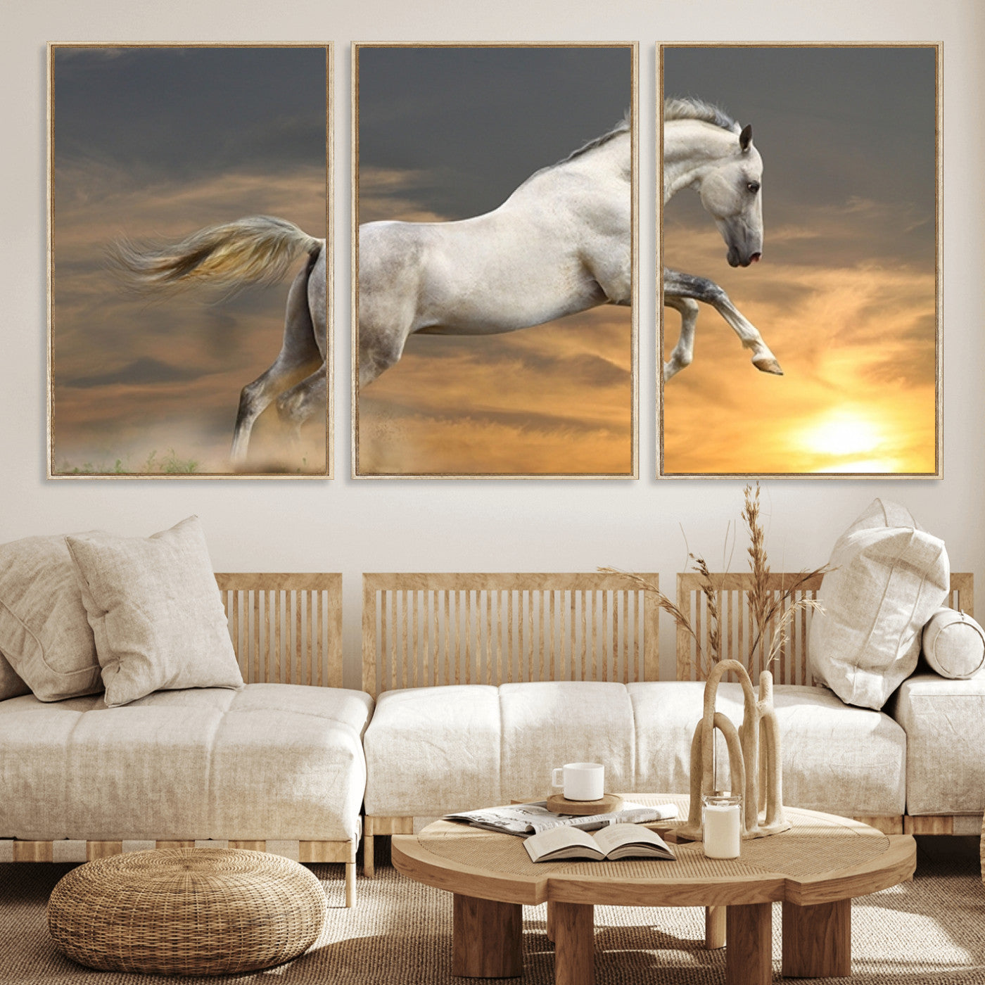 Large Wall Art Canvas Print – White Jumping Horse Sunset Scene Animal Artwork for Home, Office, Living Room Decor