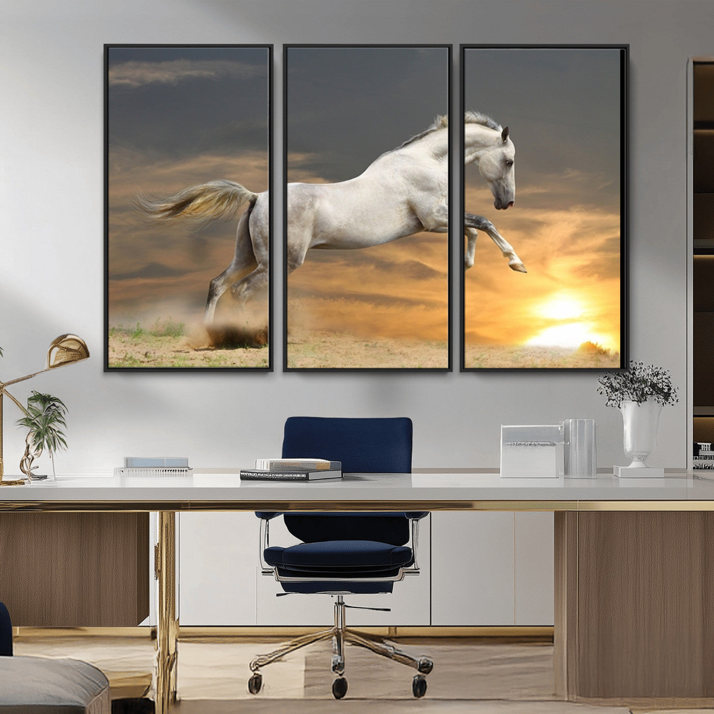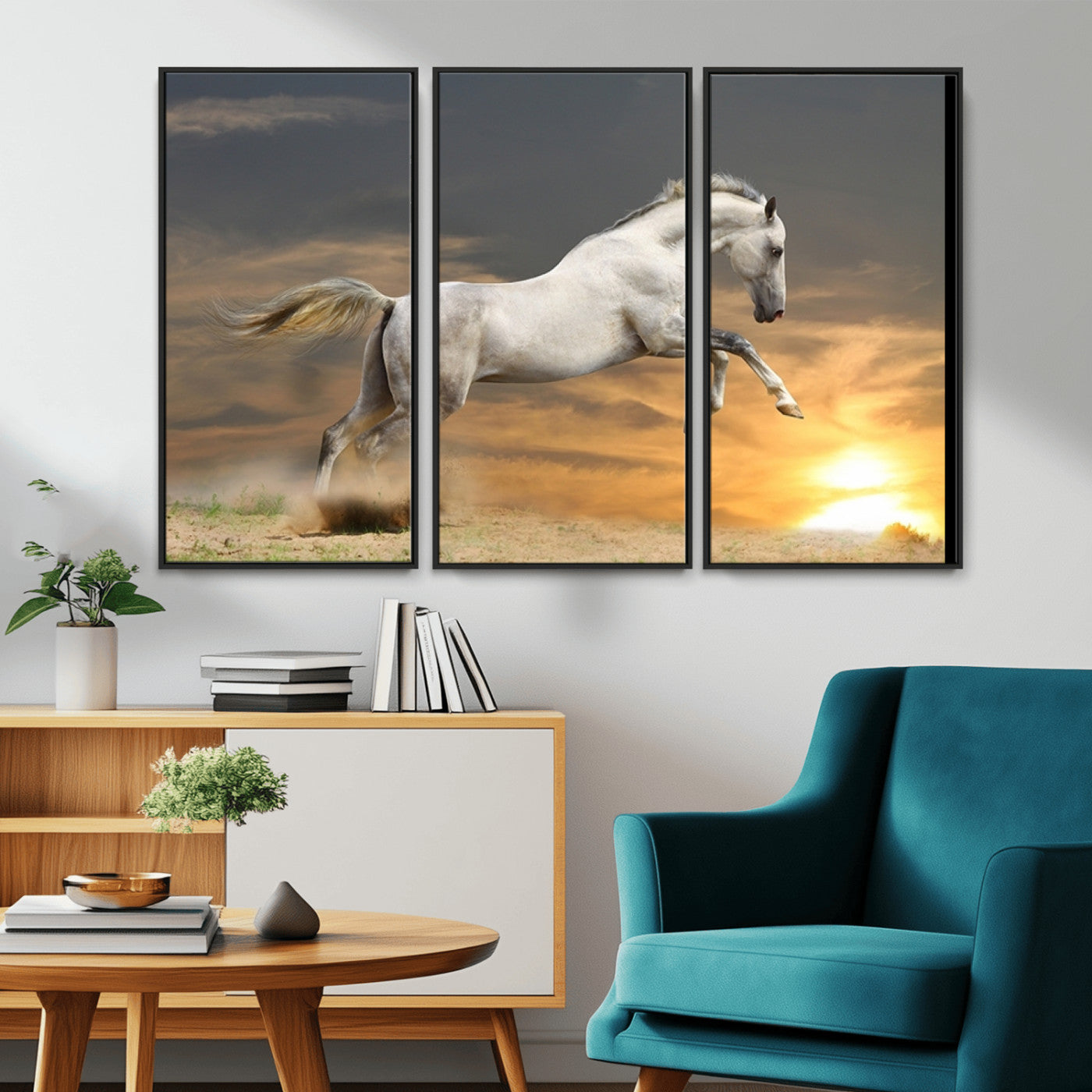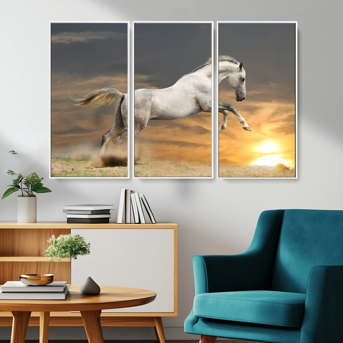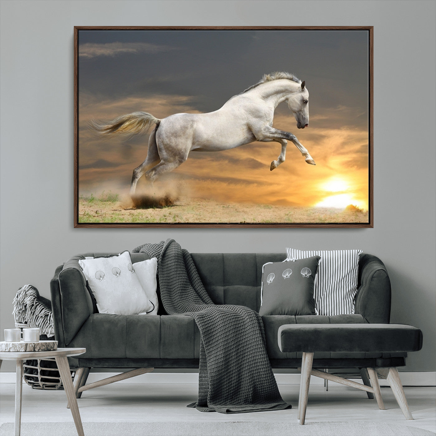 Large Wall Art Canvas Print – White Jumping Horse Sunset Scene Animal Artwork for Home, Office, Living Room Decor