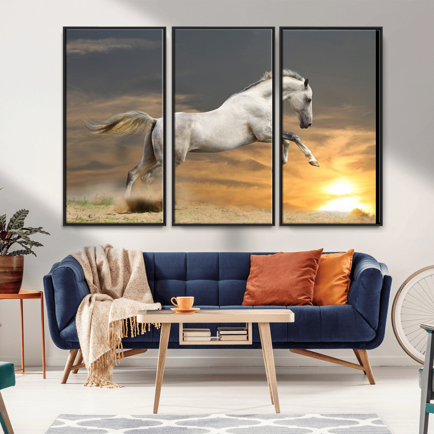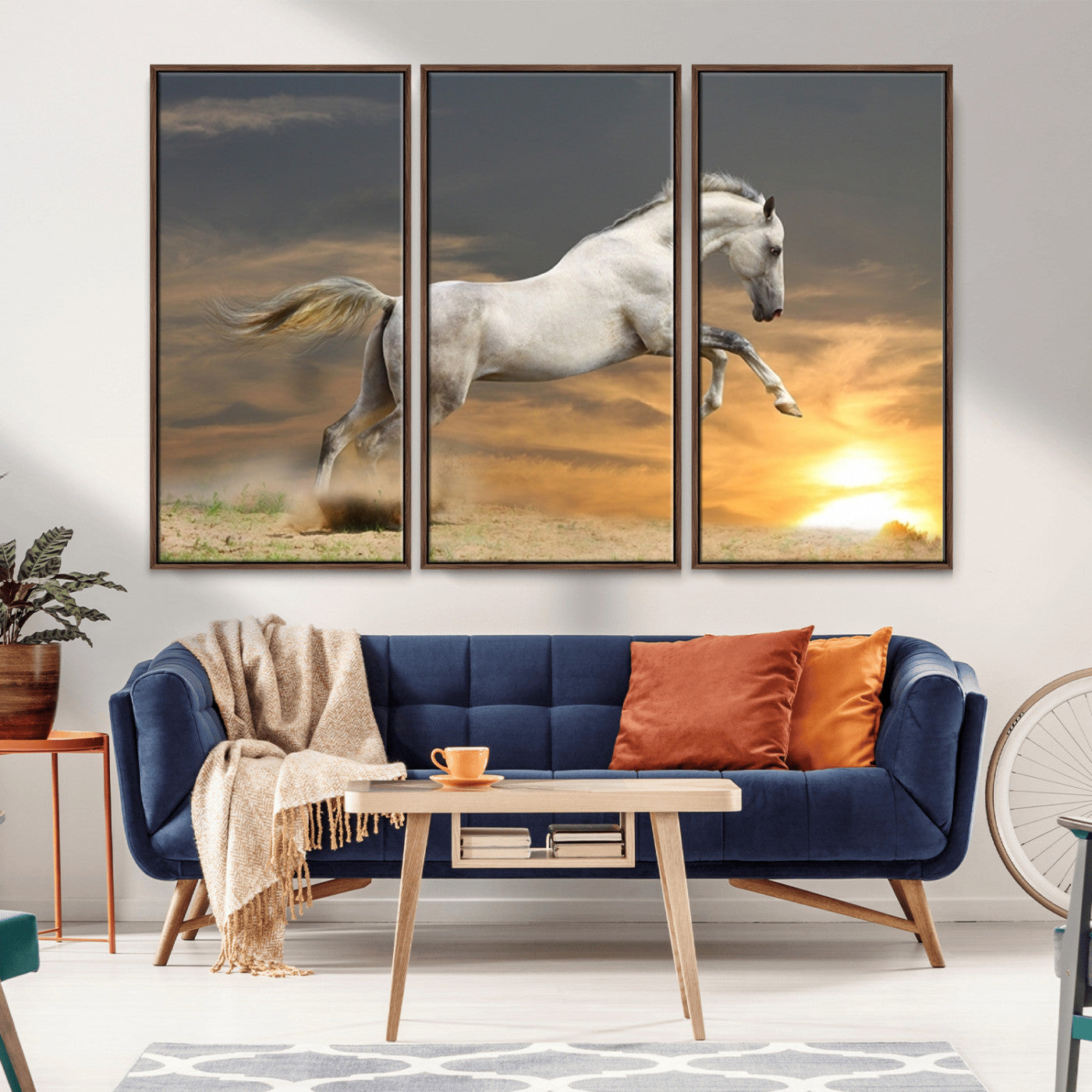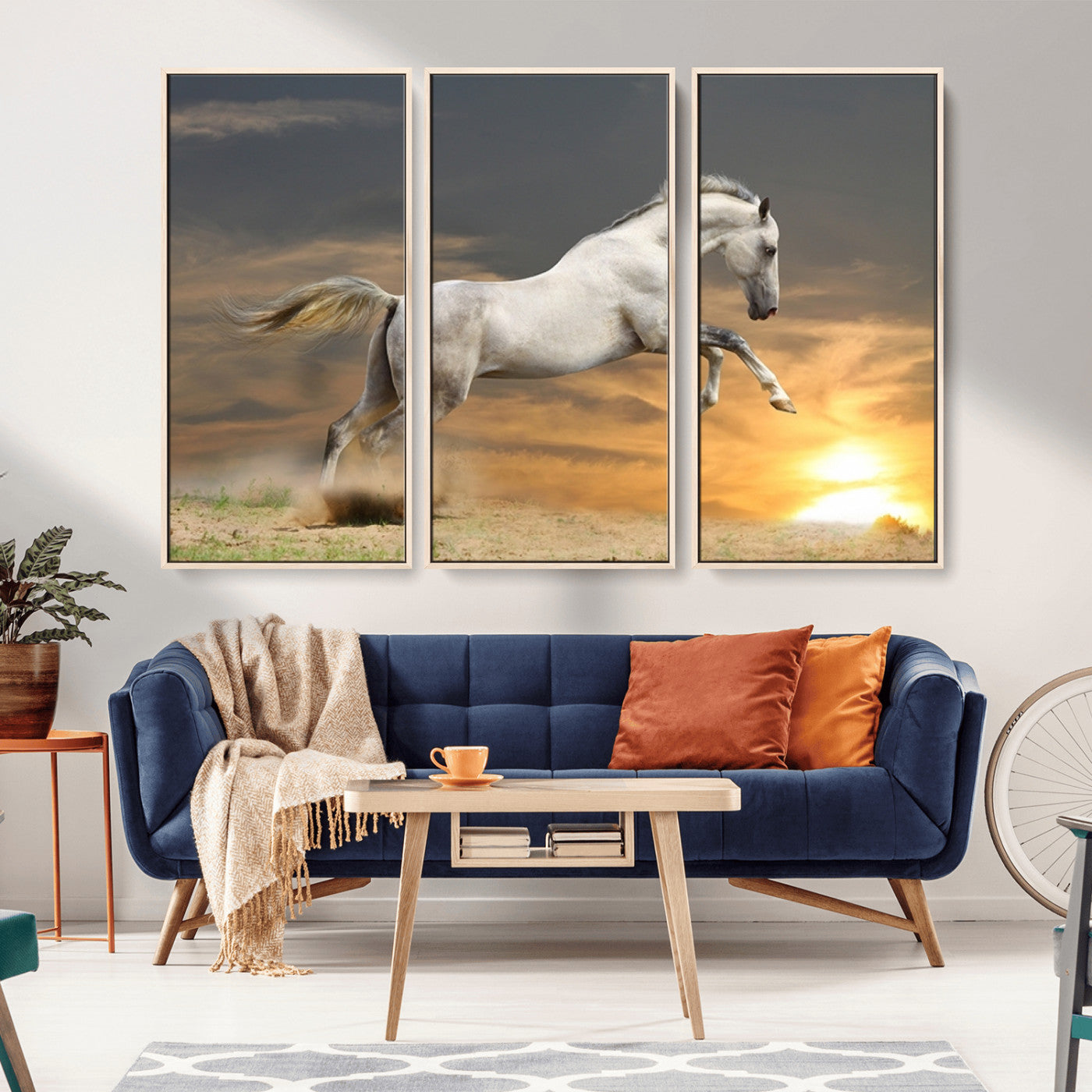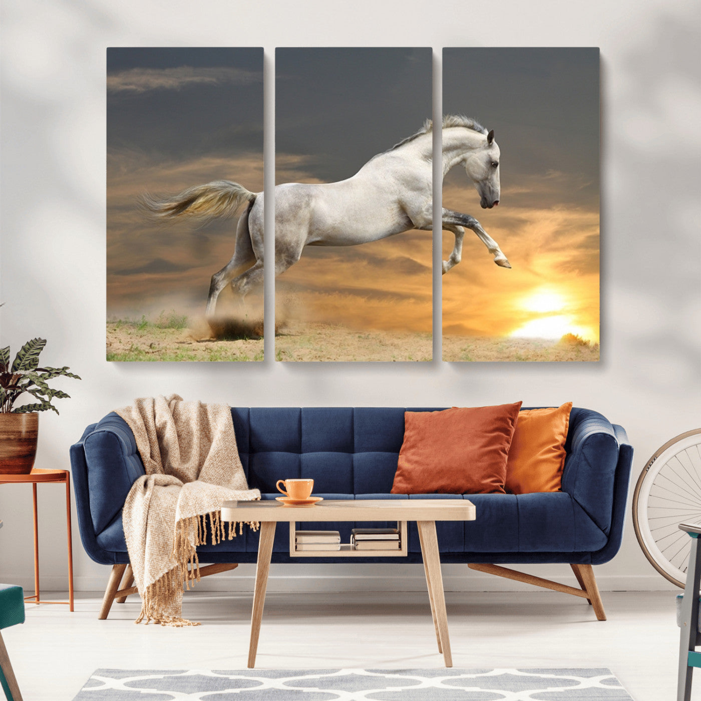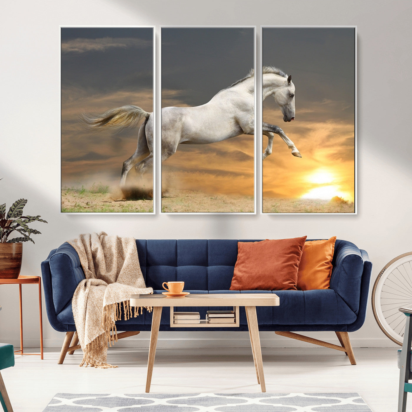 Large Wall Art Canvas Print – White Jumping Horse Sunset Scene Animal Artwork for Home, Office, Living Room Decor