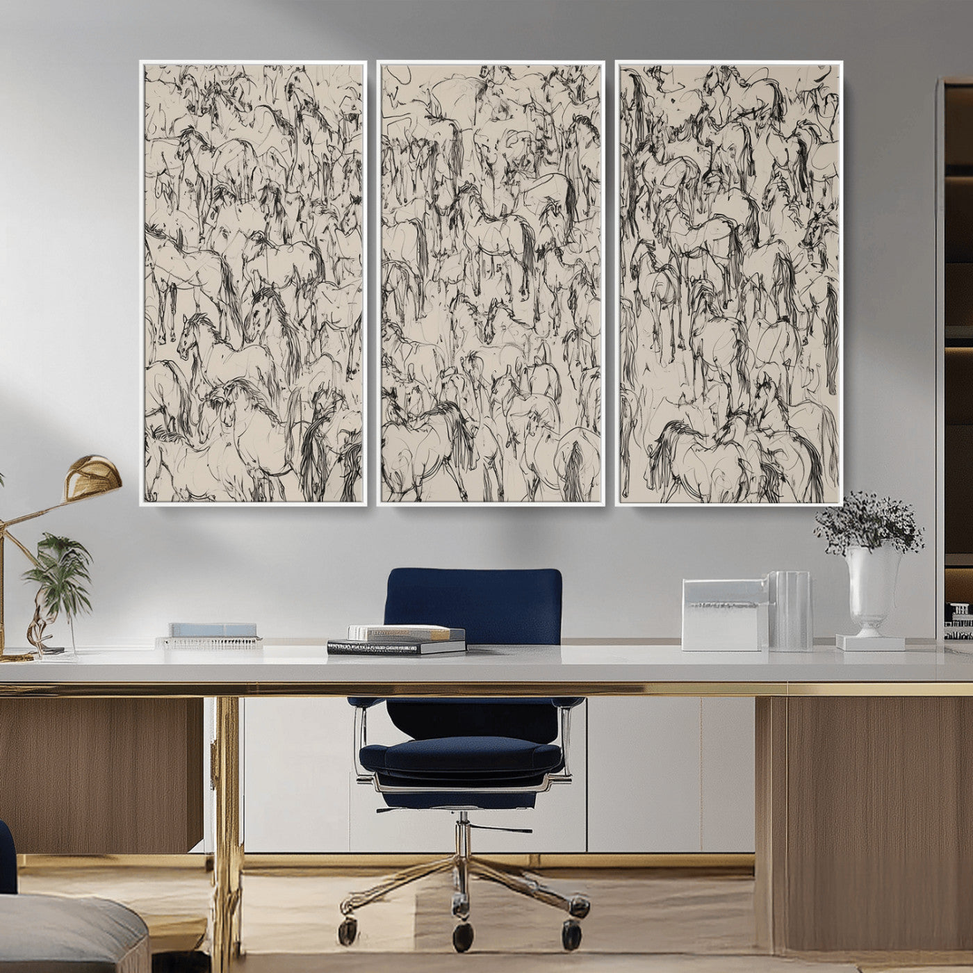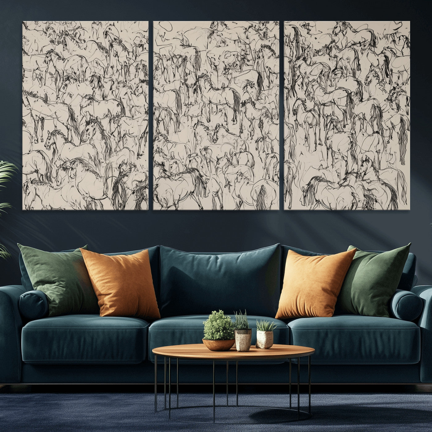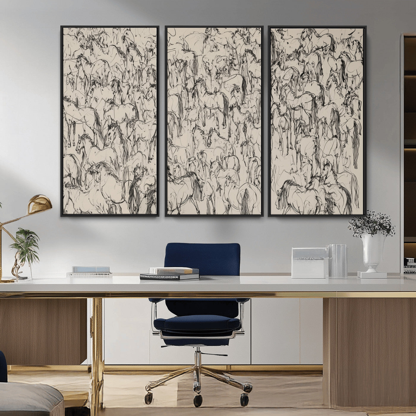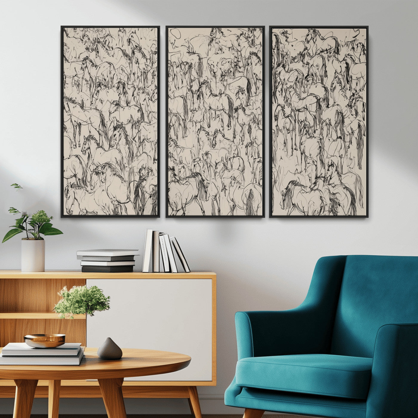Wild Horse Stampede Wall Art Canvas Print – Monochrome Running Horses Dynamic Motion Elegant Artwork for Home, Office