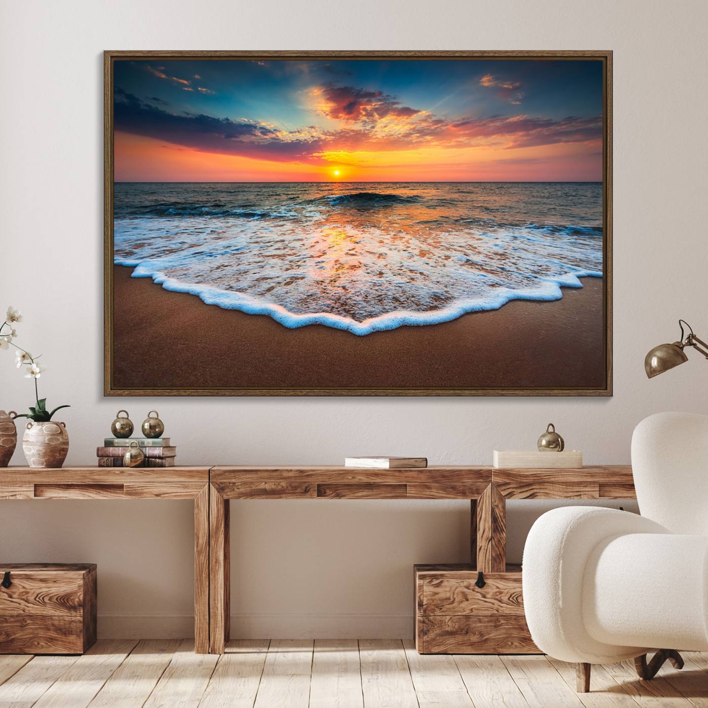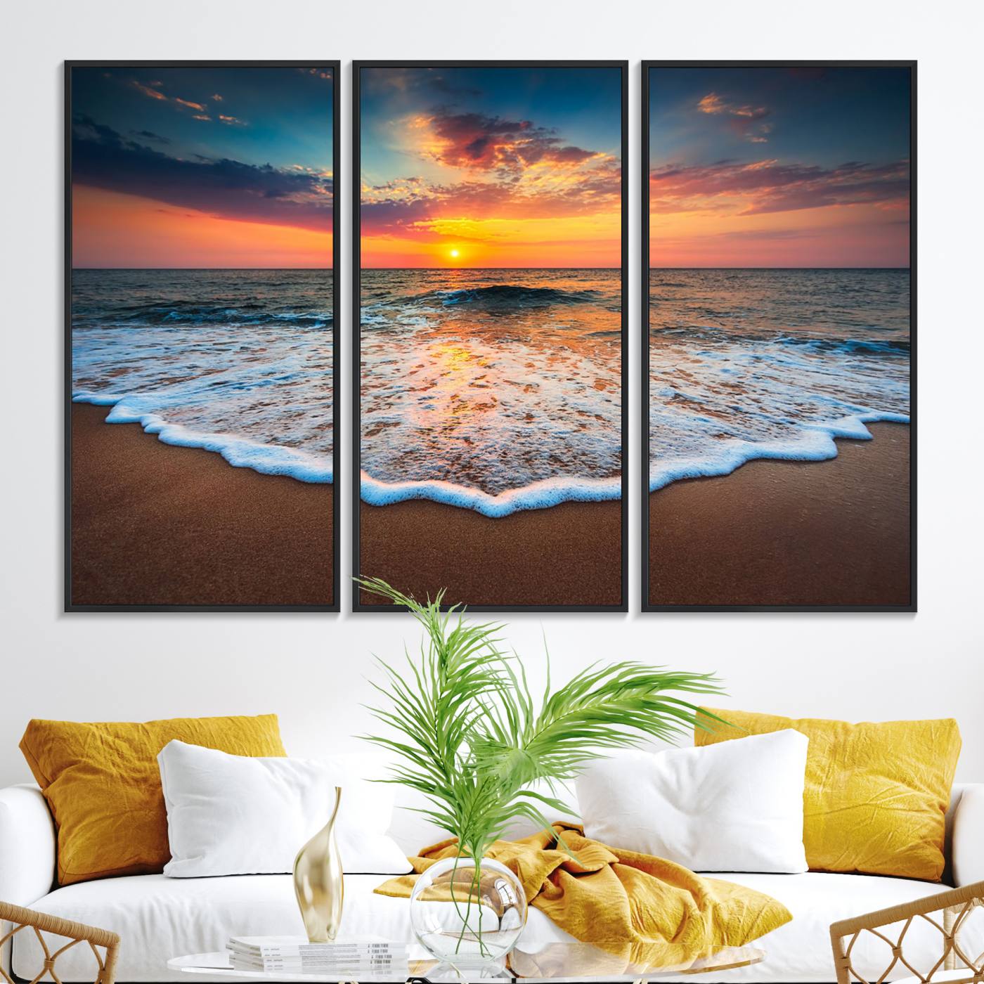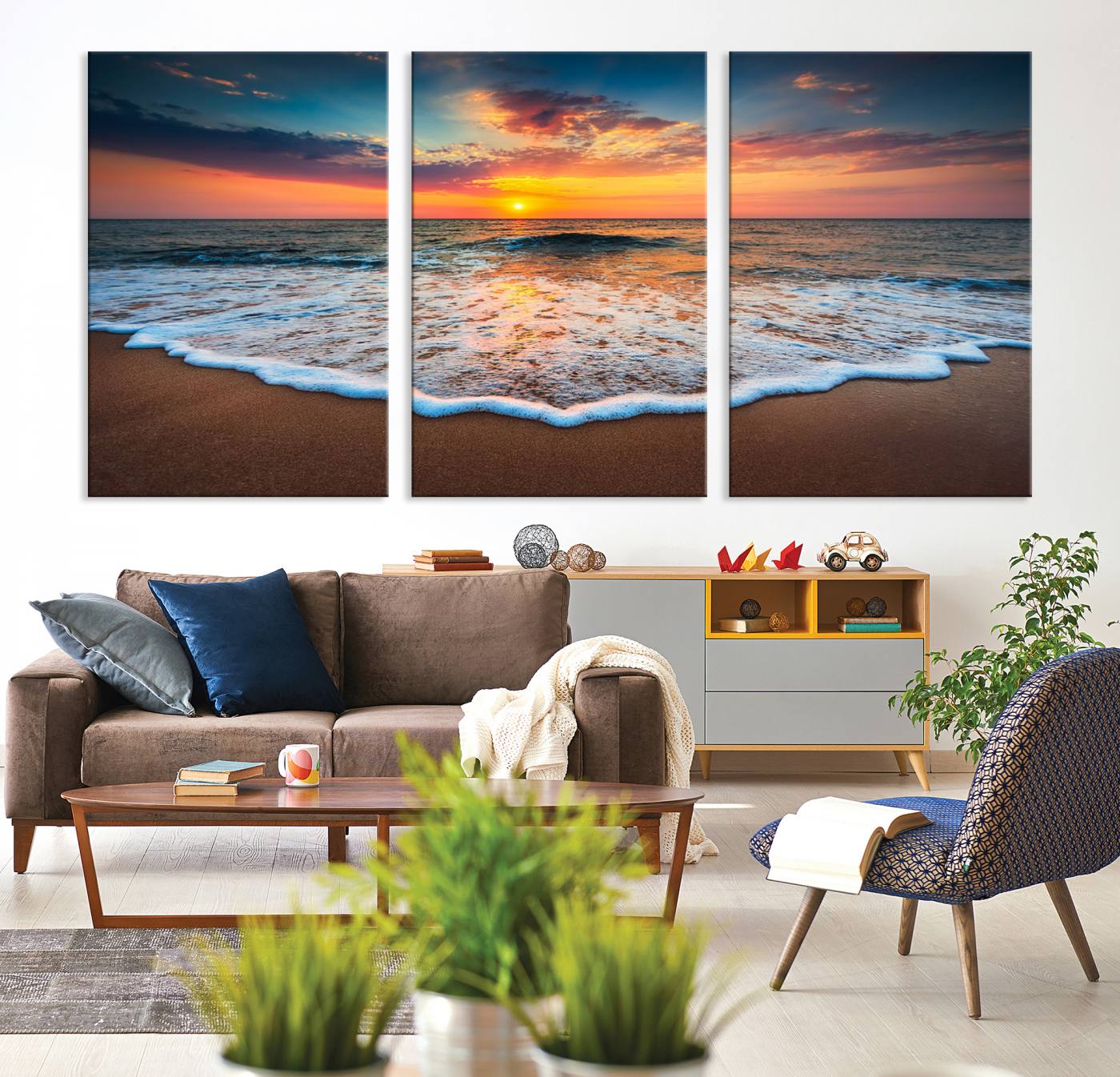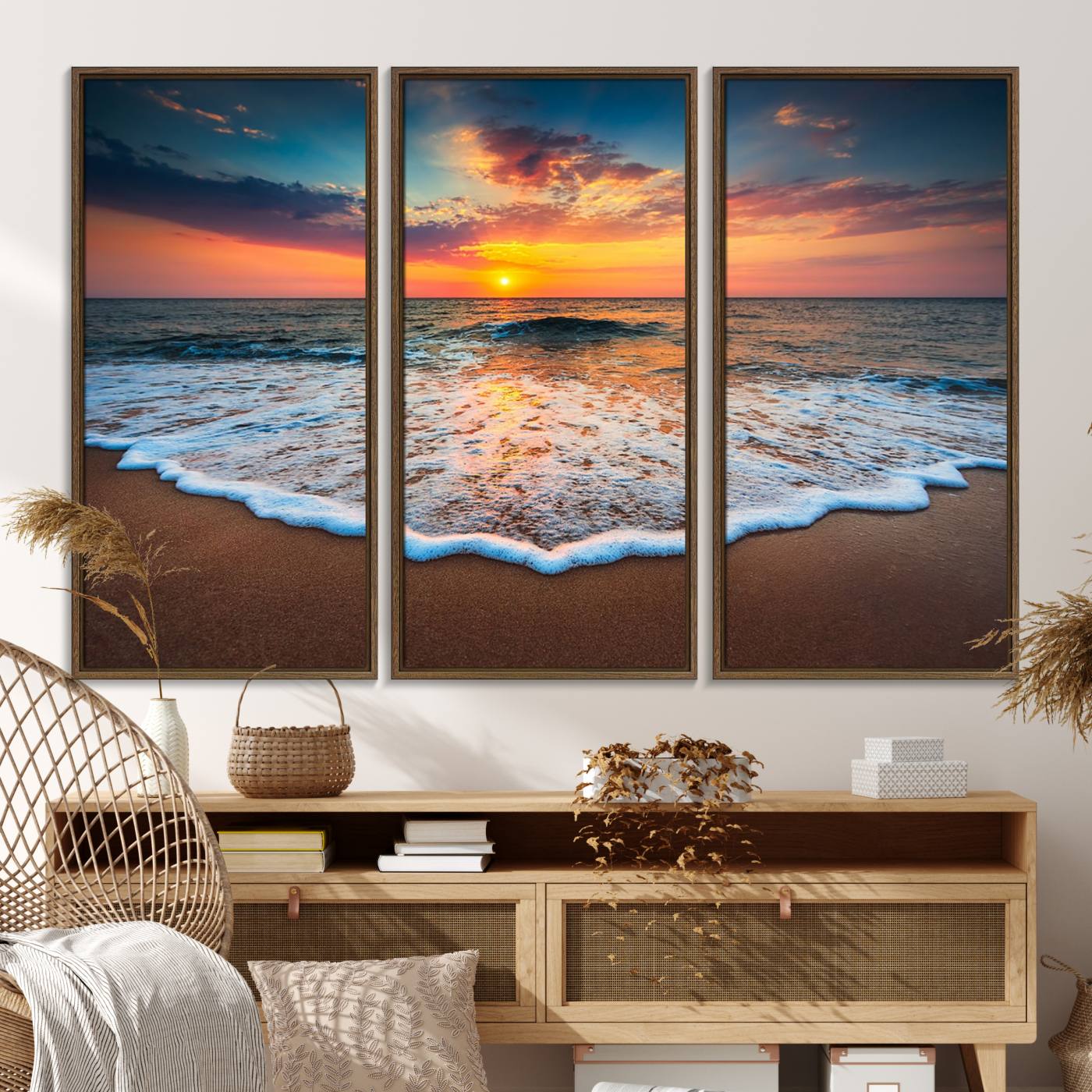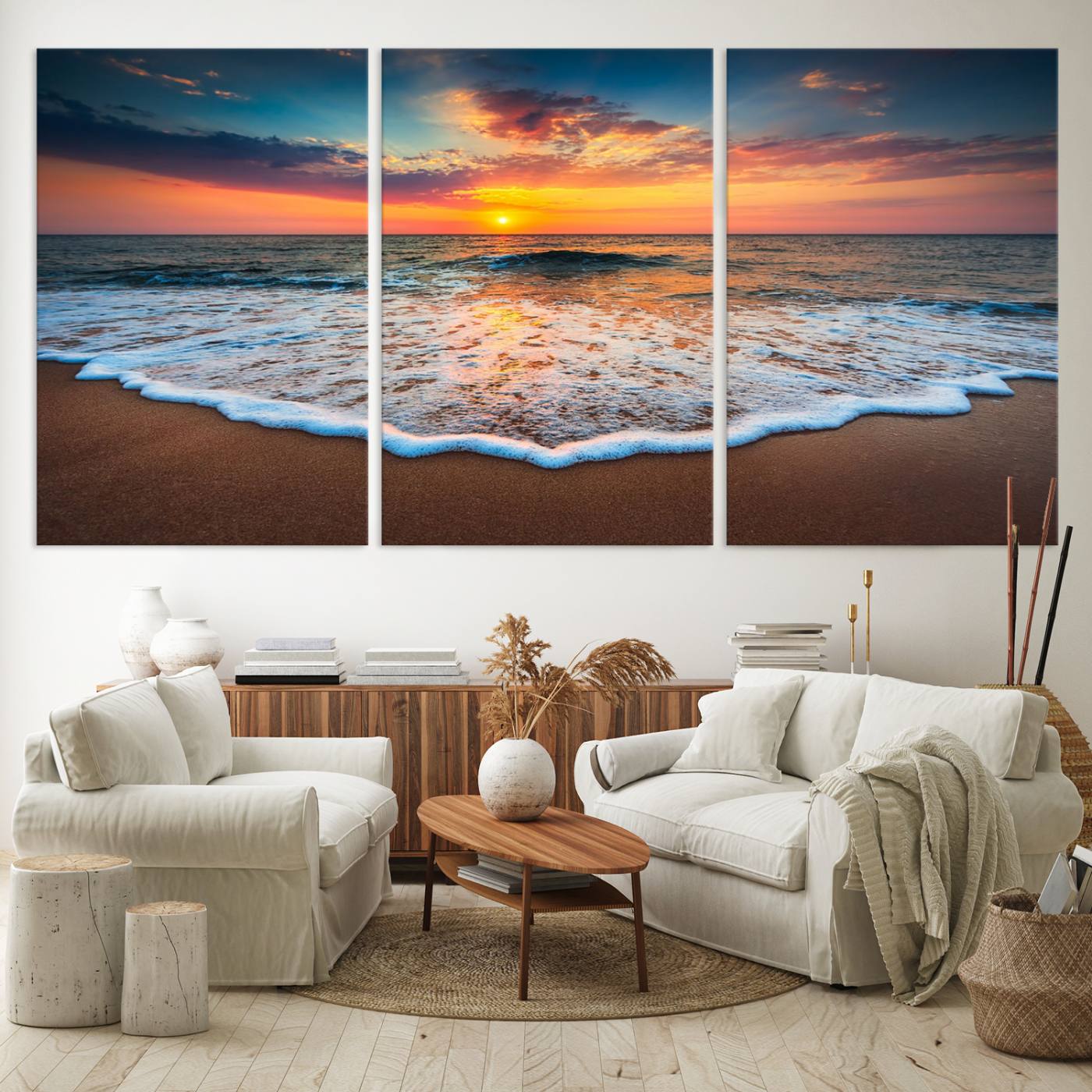 Puesta de sol con olas tranquilas en la playa Arte de pared extra grande Impresión en lienzo Paisaje natural Fotografía Arte Océano Arte de playa tropical Enmarcado listo para colgar Arte de pared de múltiples paneles Decoración del hogar
