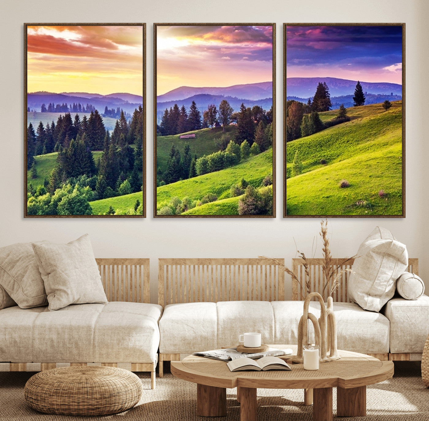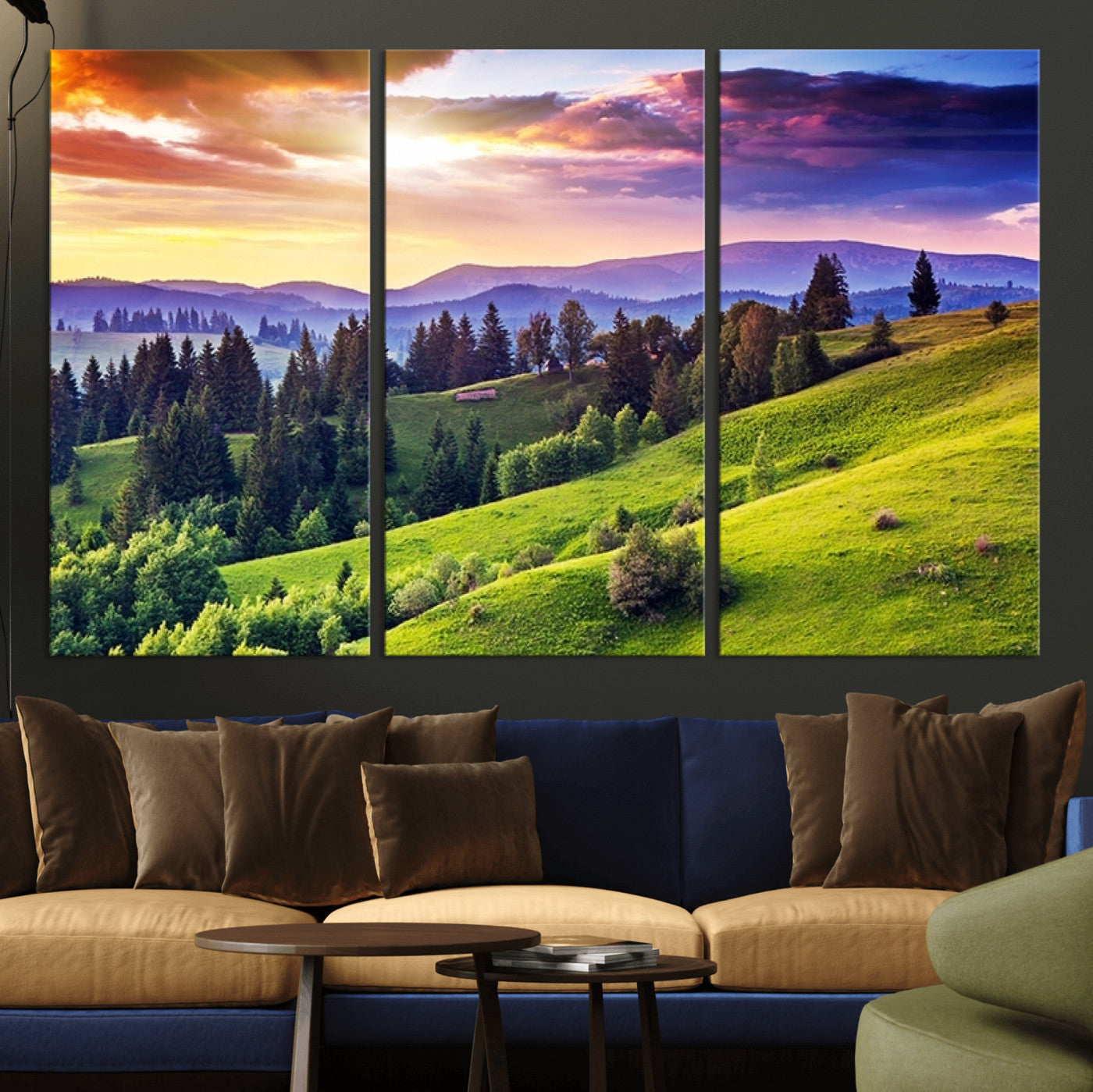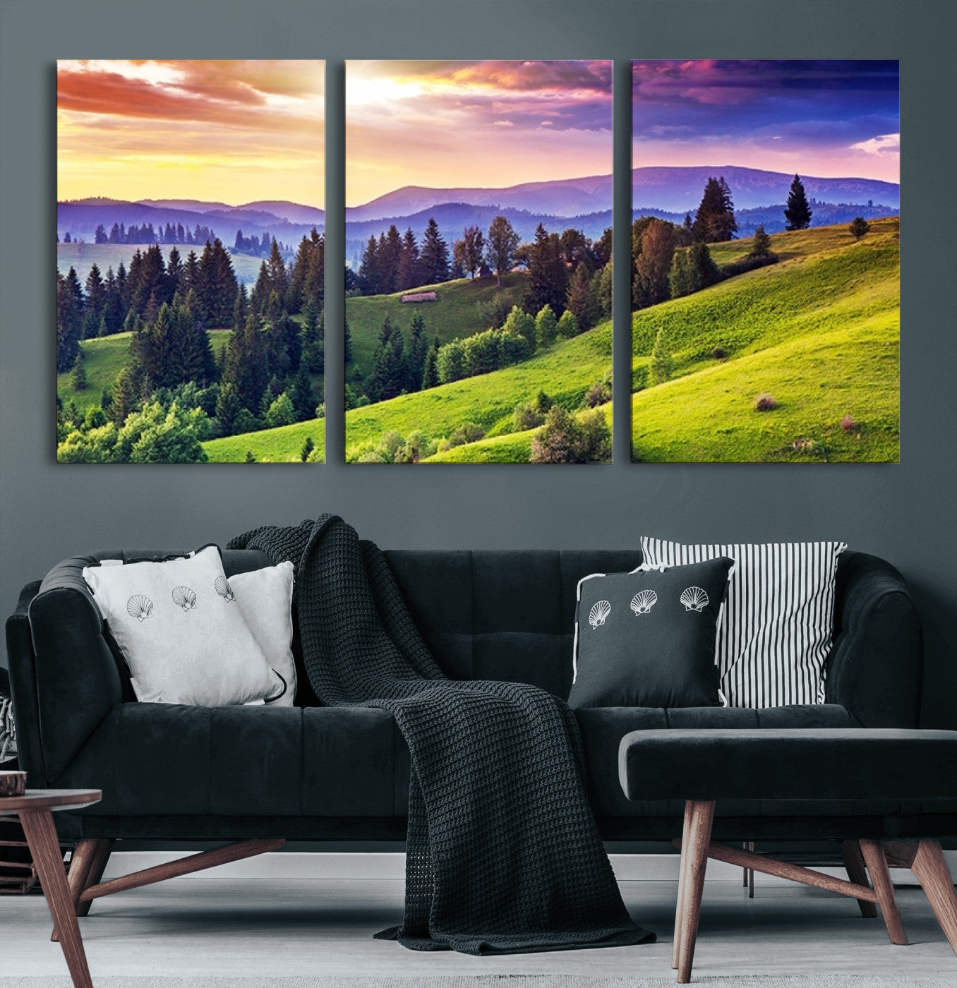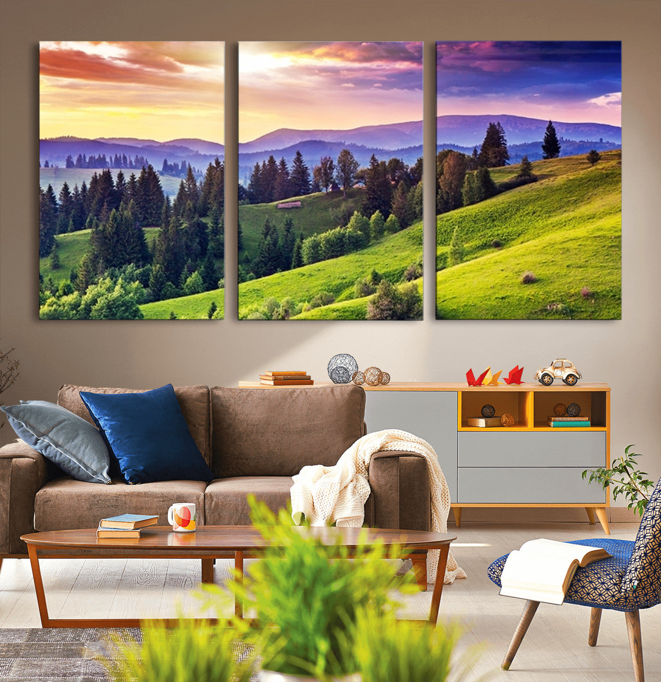 Impresión de lienzo de paisaje de arte de pared grande - Bosque disperso en la montaña al atardecer