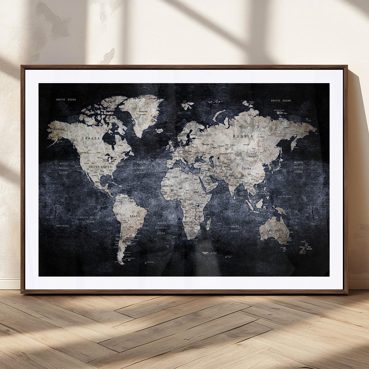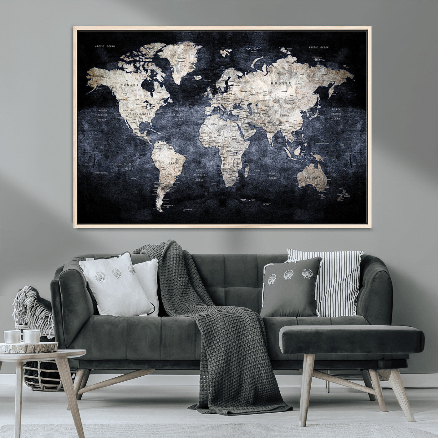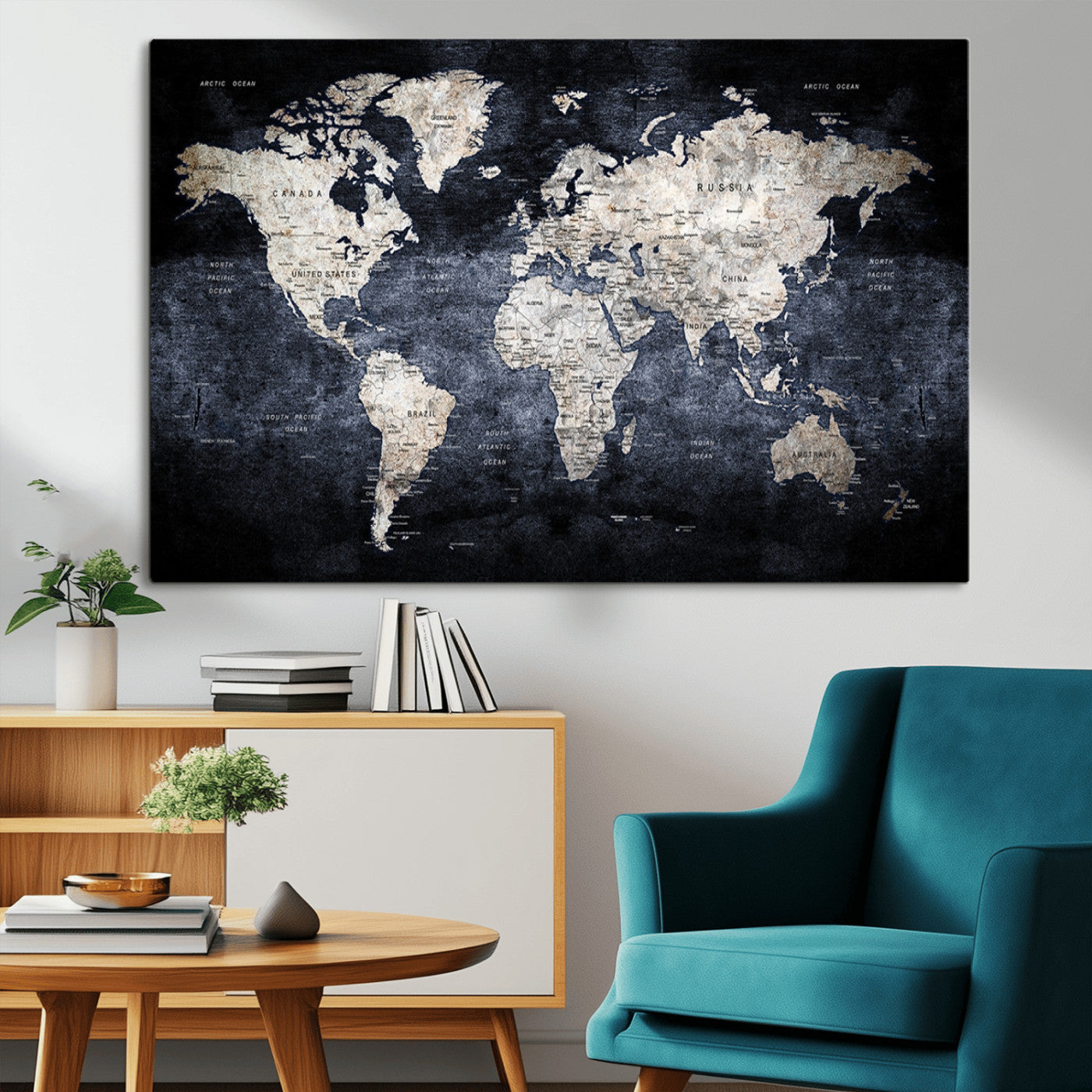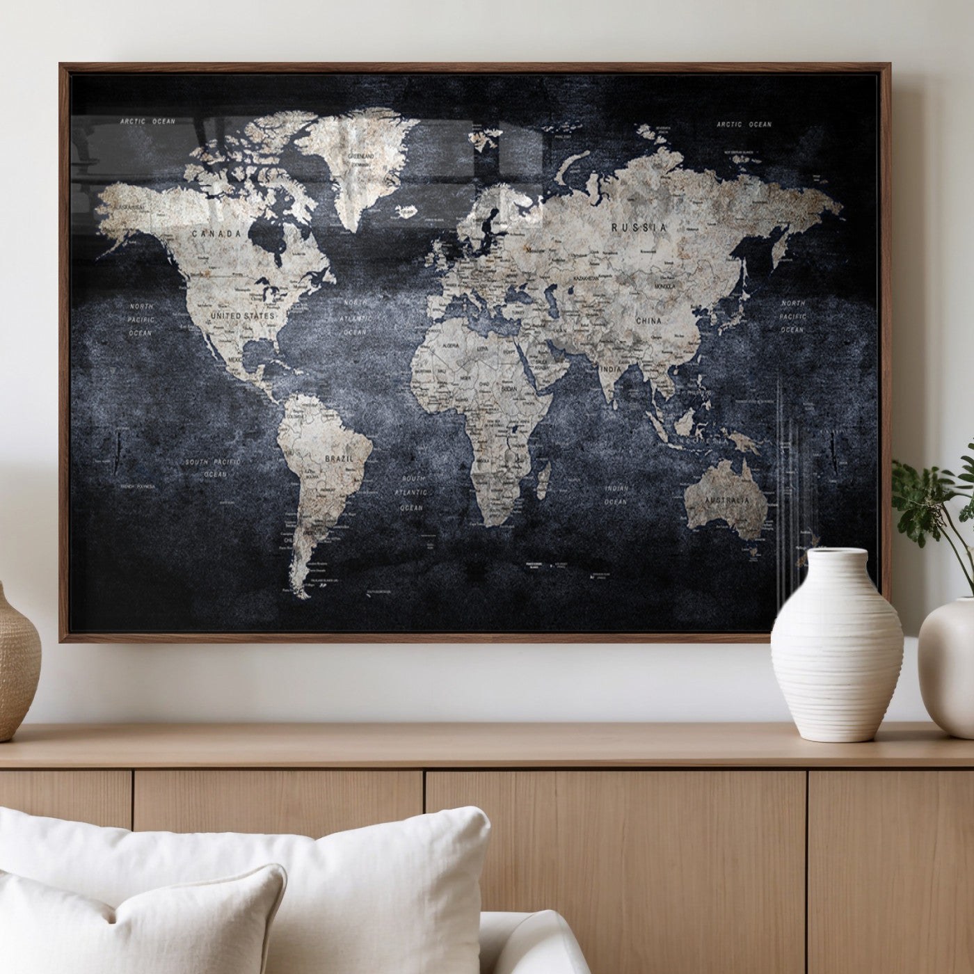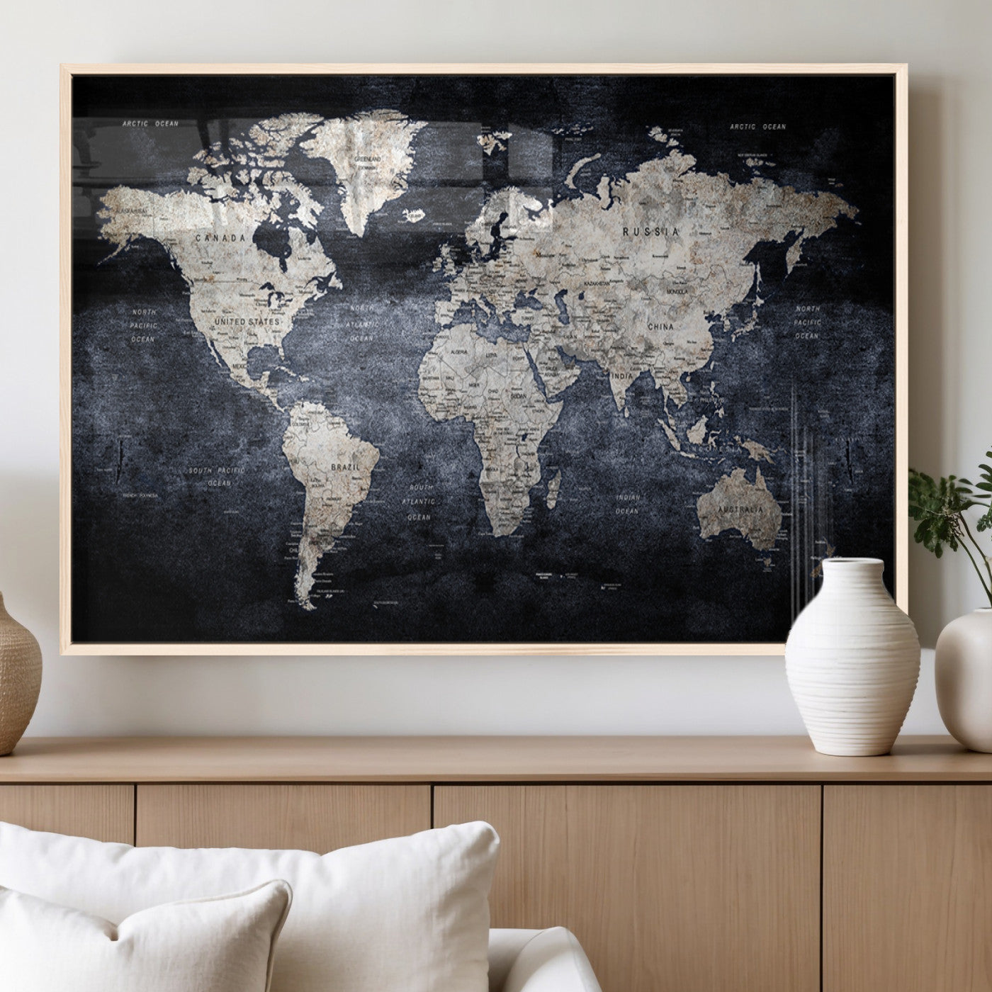 Modern Dark World Map Canvas Print – Framed Push Pin Wall Art, Elegant Travel Map Decoration for Home Office or Living Room Decor