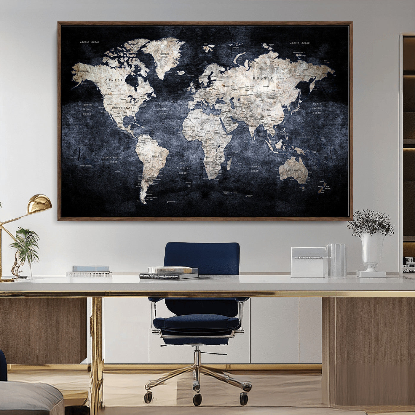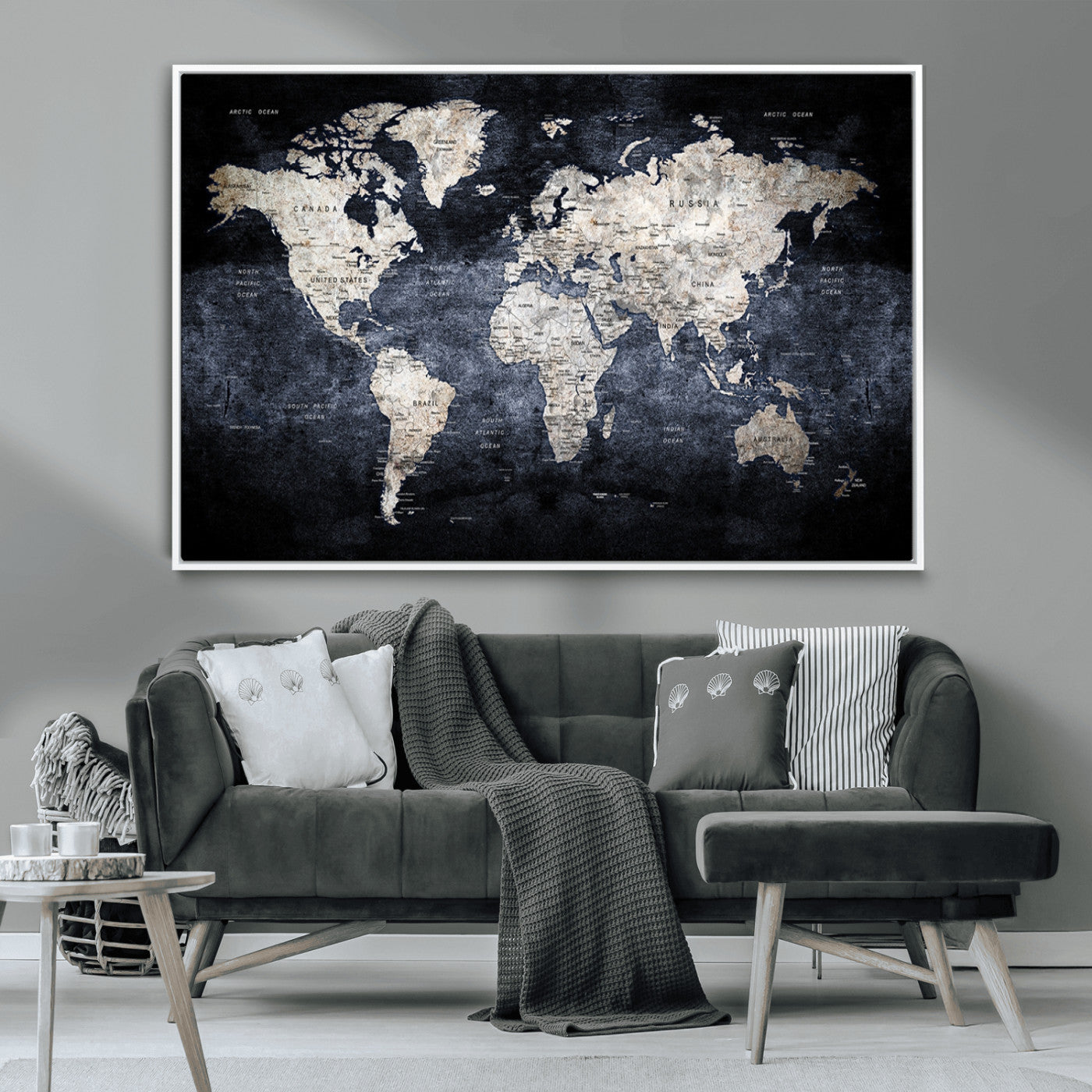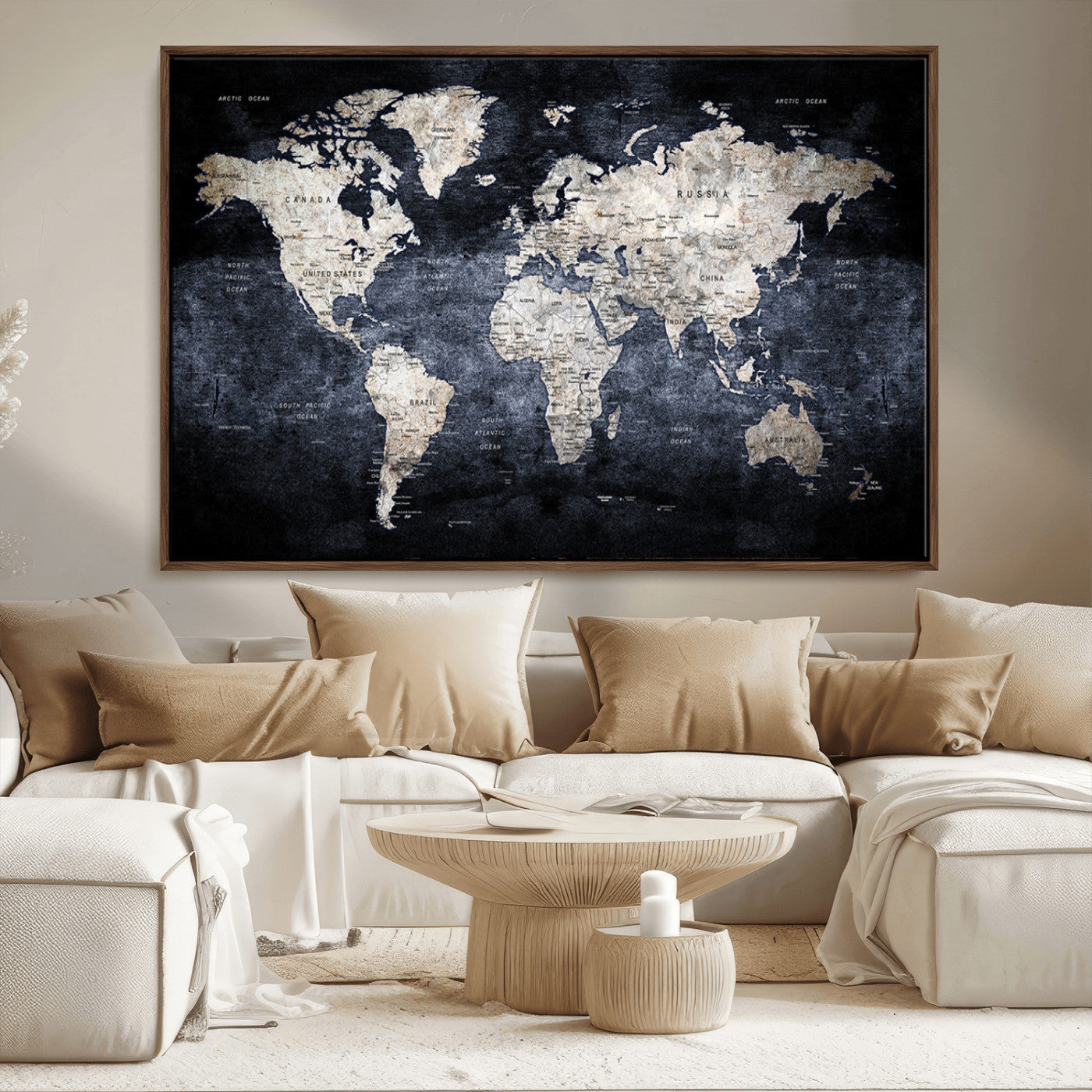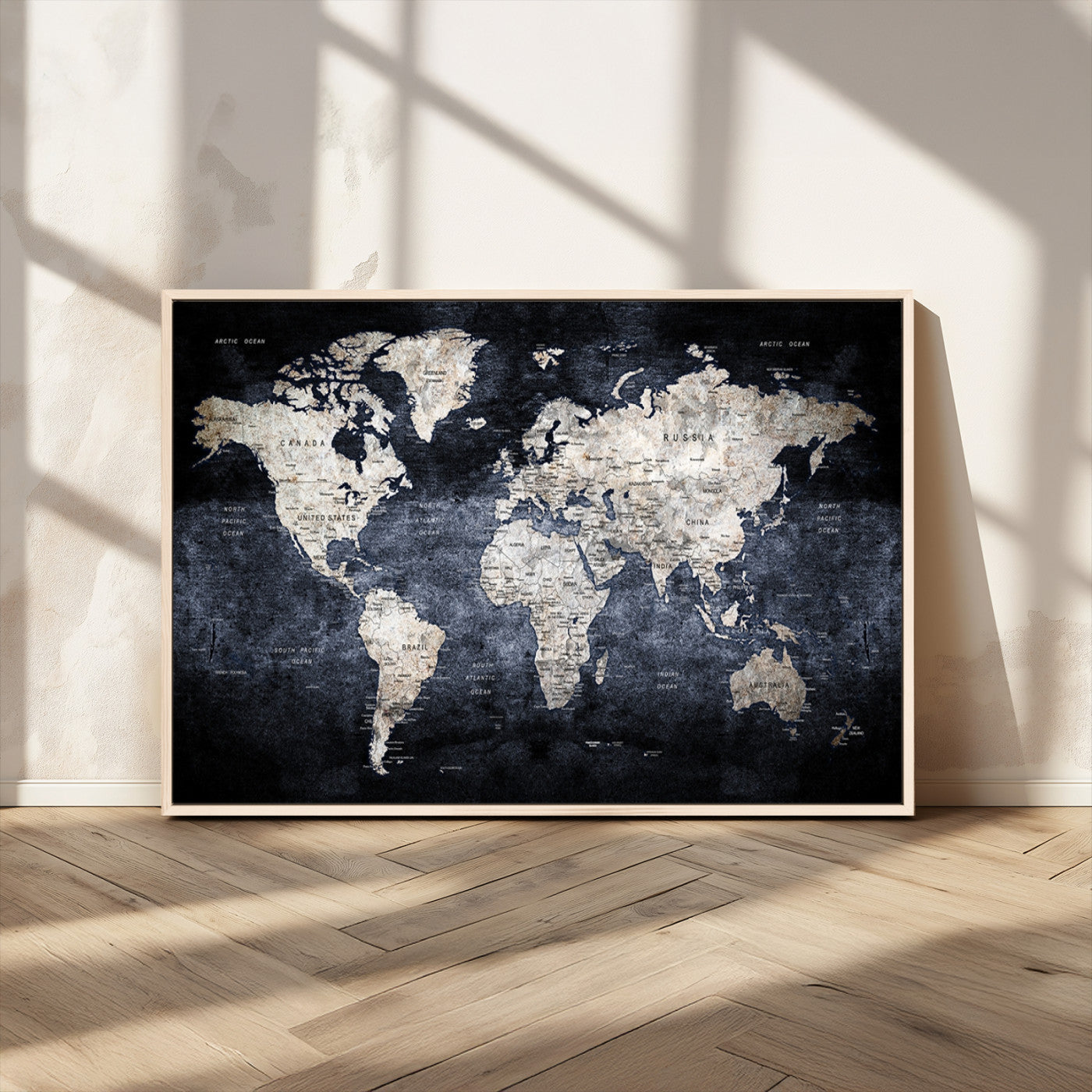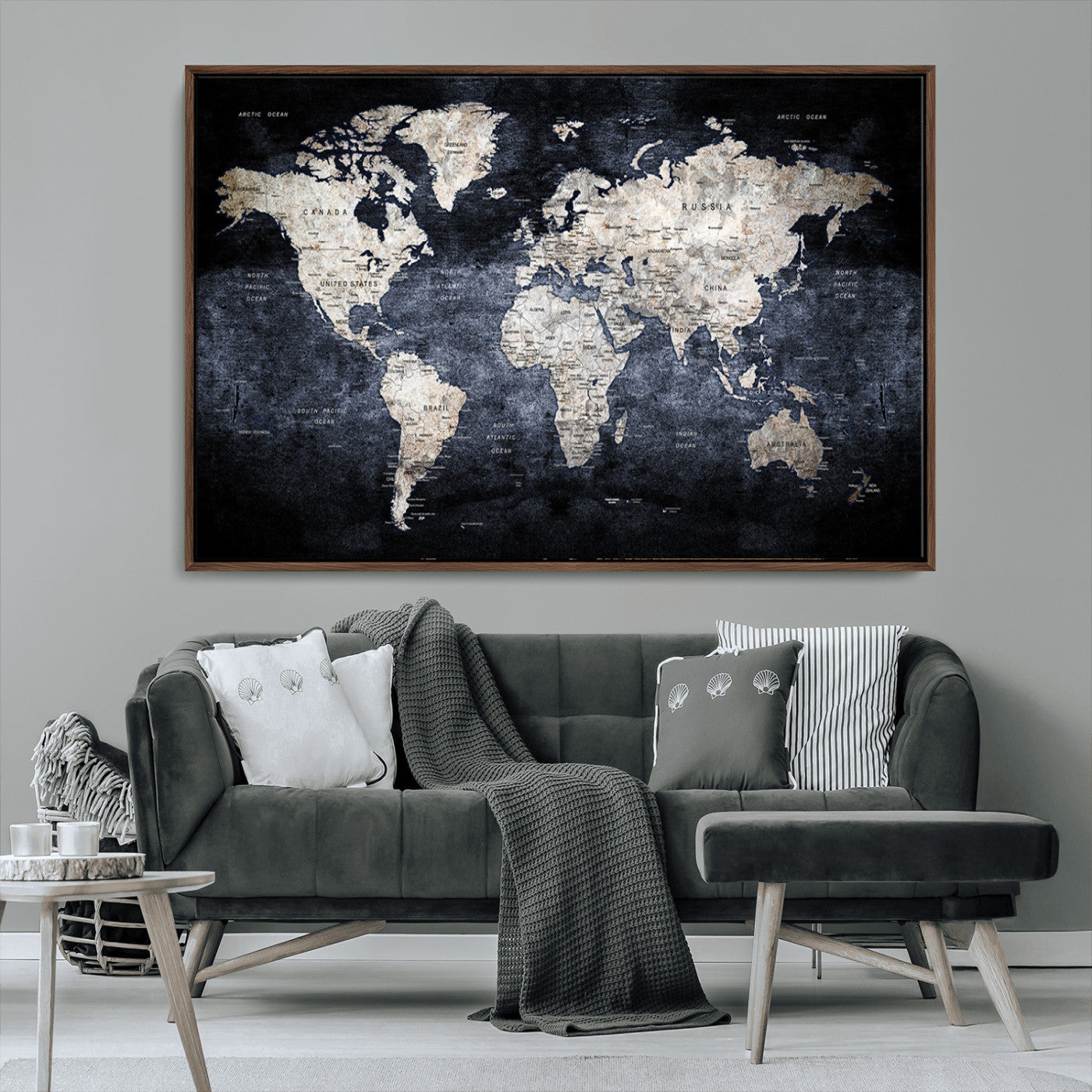 Modern Dark World Map Canvas Print – Framed Push Pin Wall Art, Elegant Travel Map Decoration for Home Office or Living Room Decor