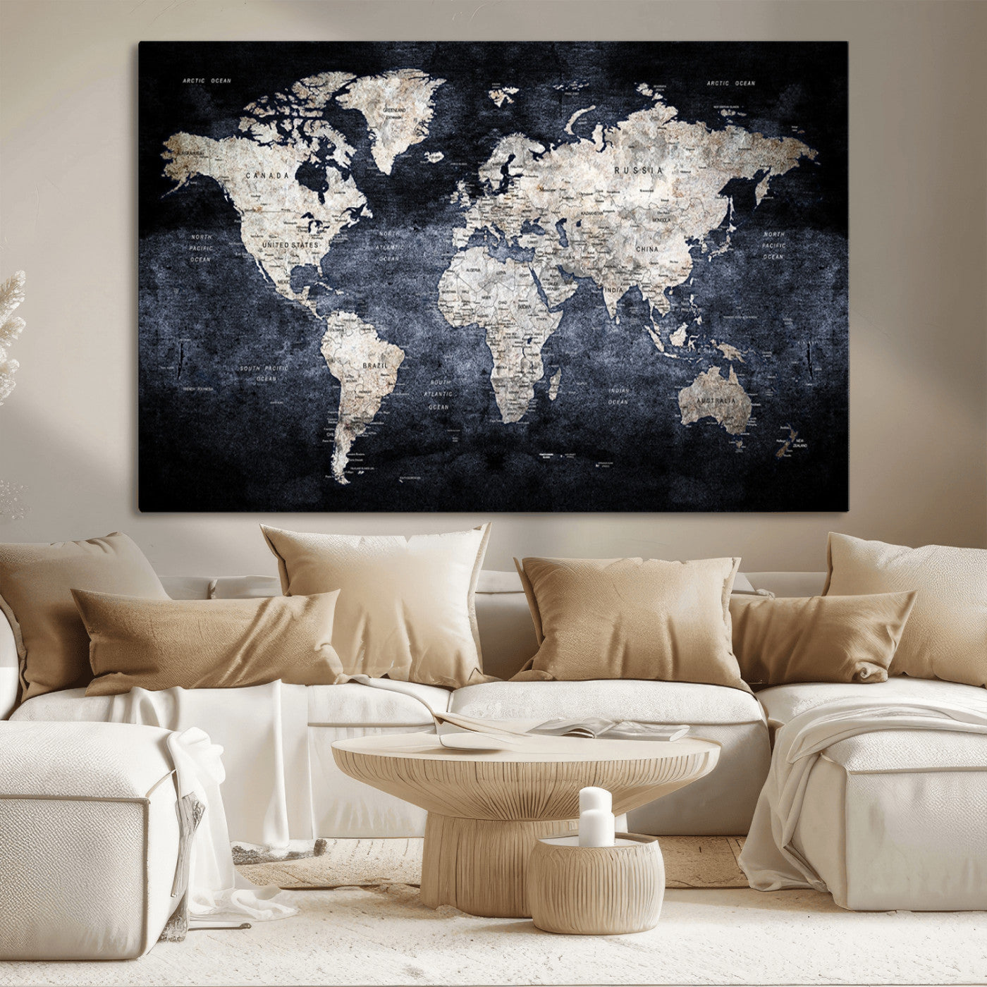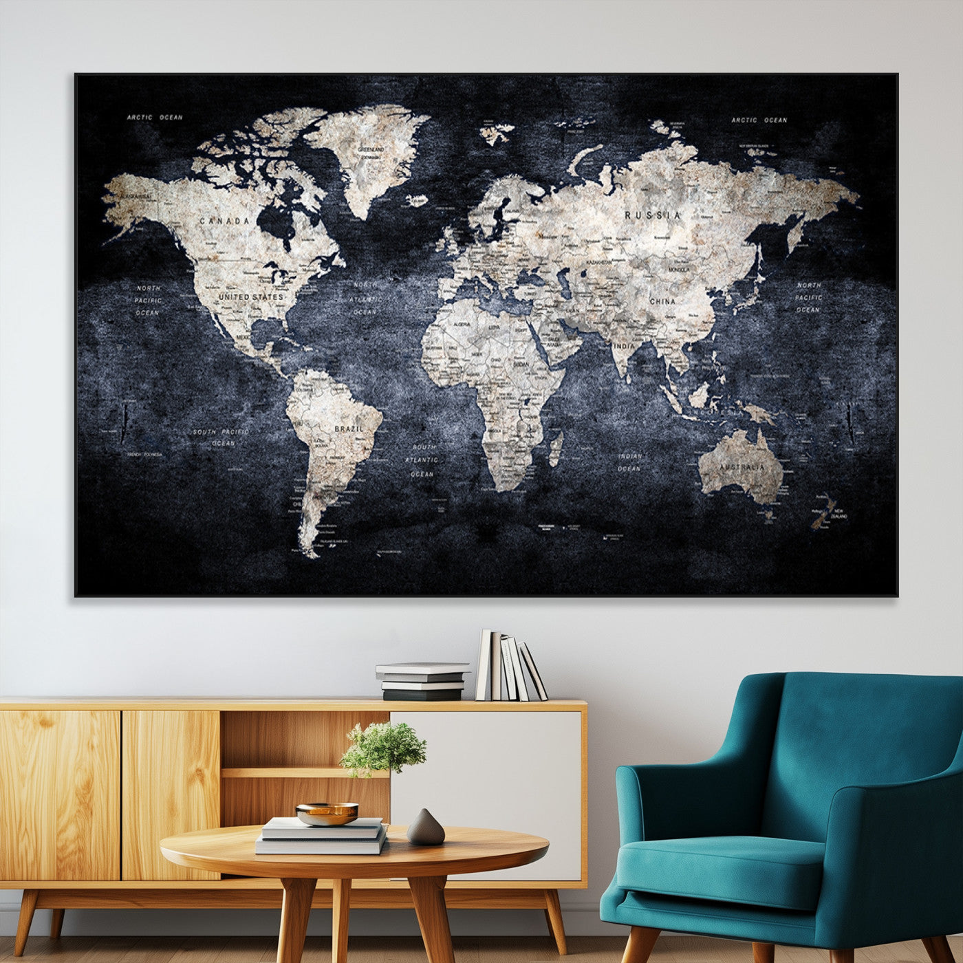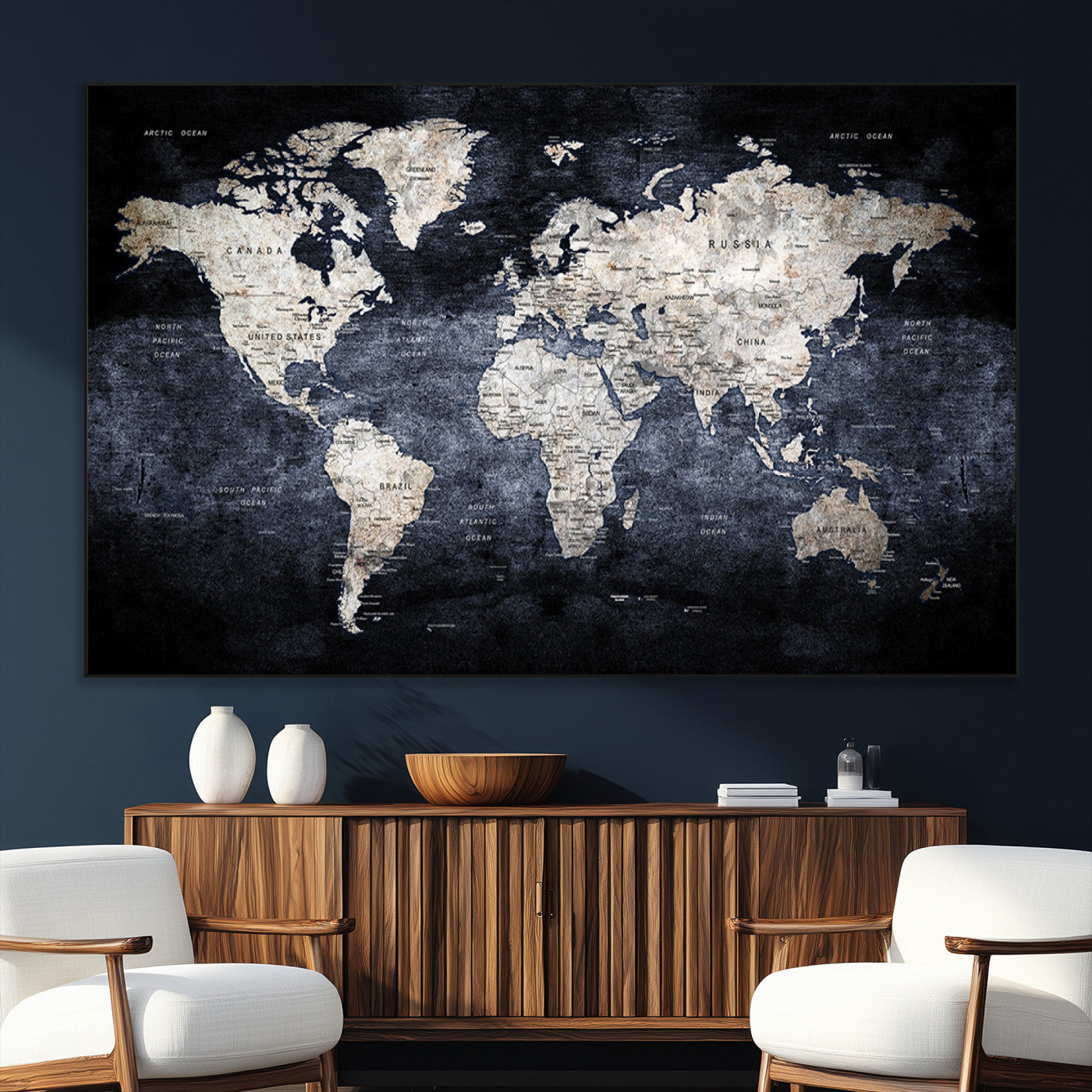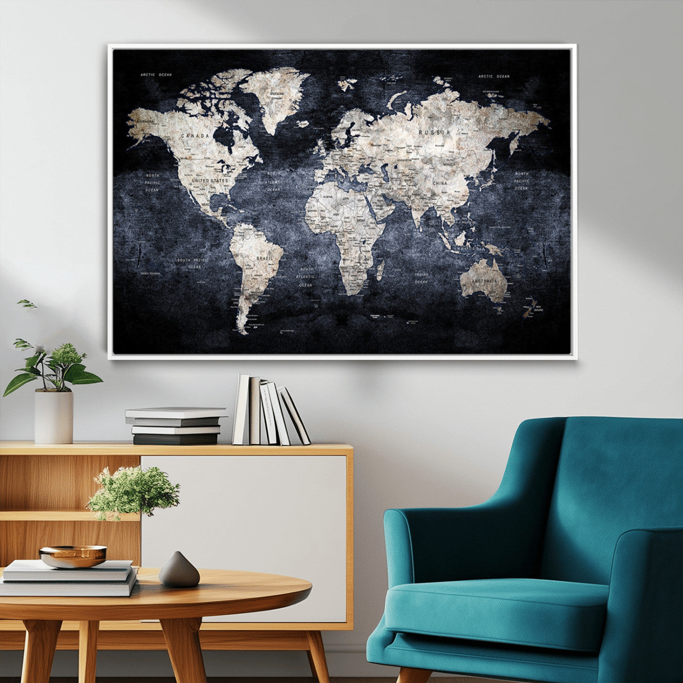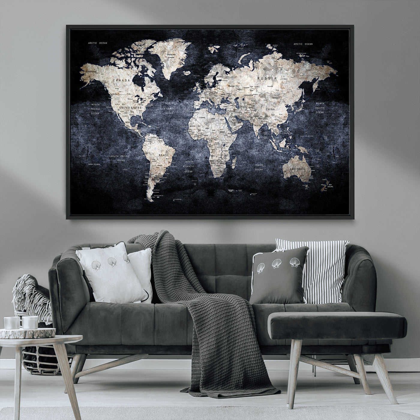 Modern Dark World Map Canvas Print – Framed Push Pin Wall Art, Elegant Travel Map Decoration for Home Office or Living Room Decor