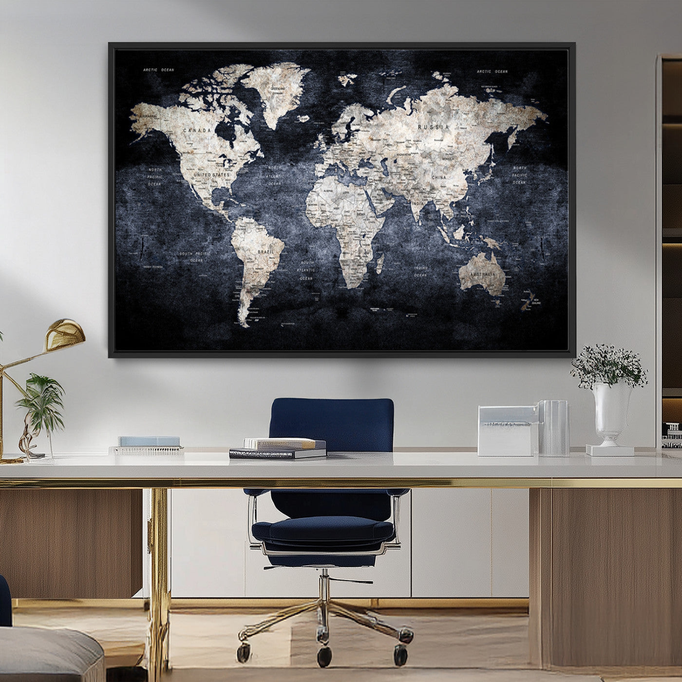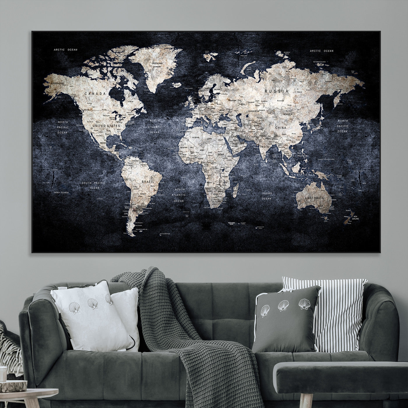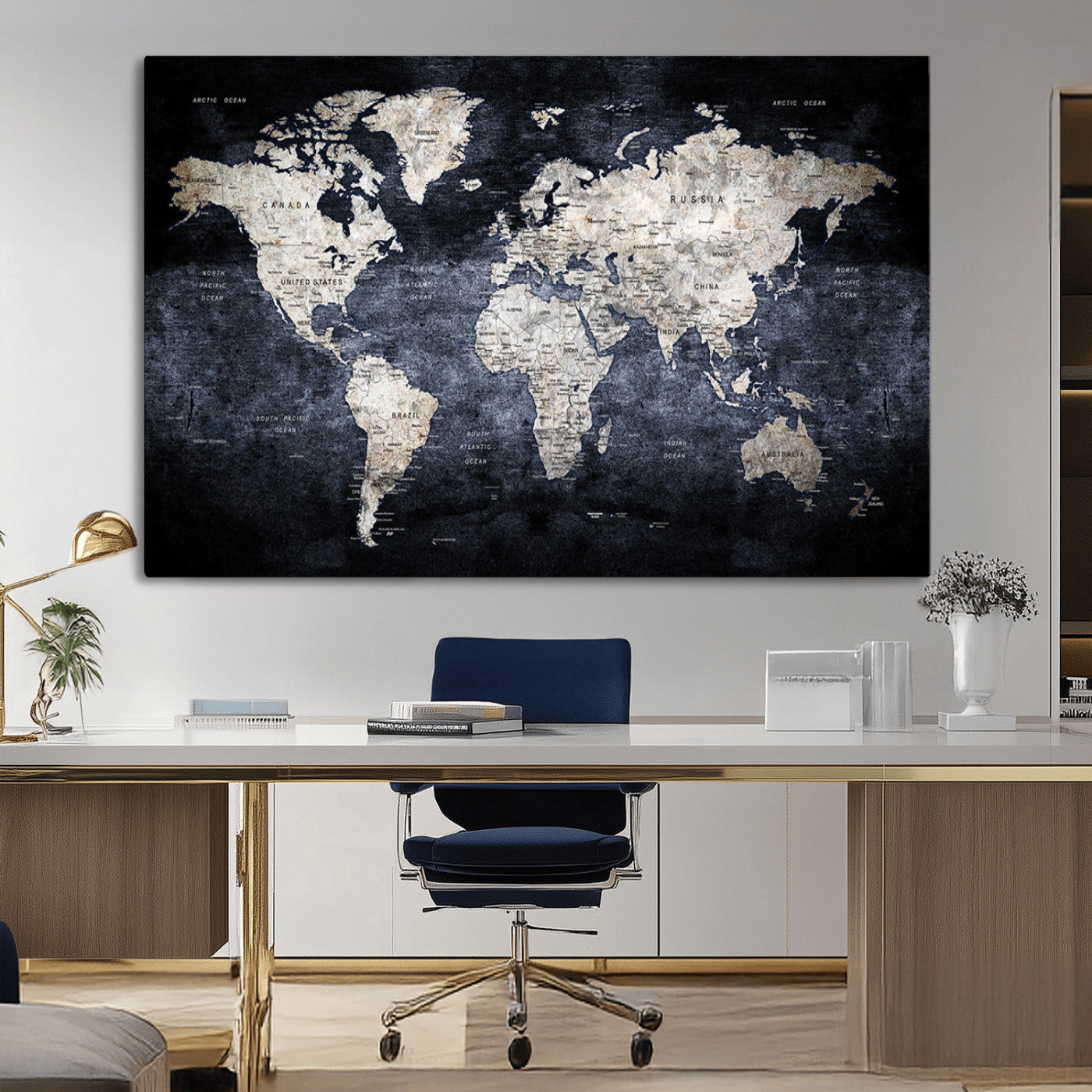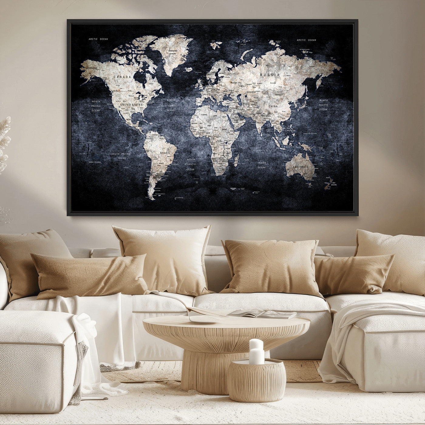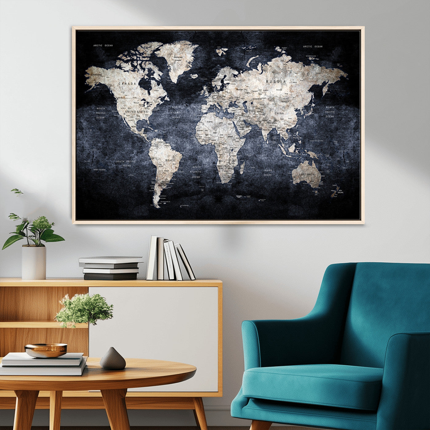 Modern Dark World Map Canvas Print – Framed Push Pin Wall Art, Elegant Travel Map Decoration for Home Office or Living Room Decor