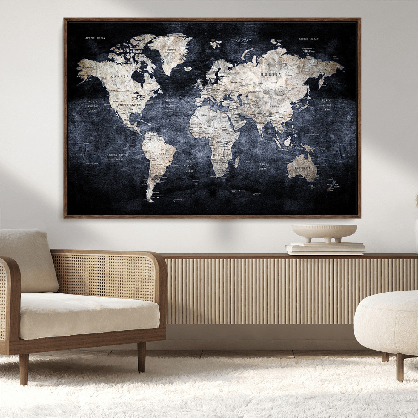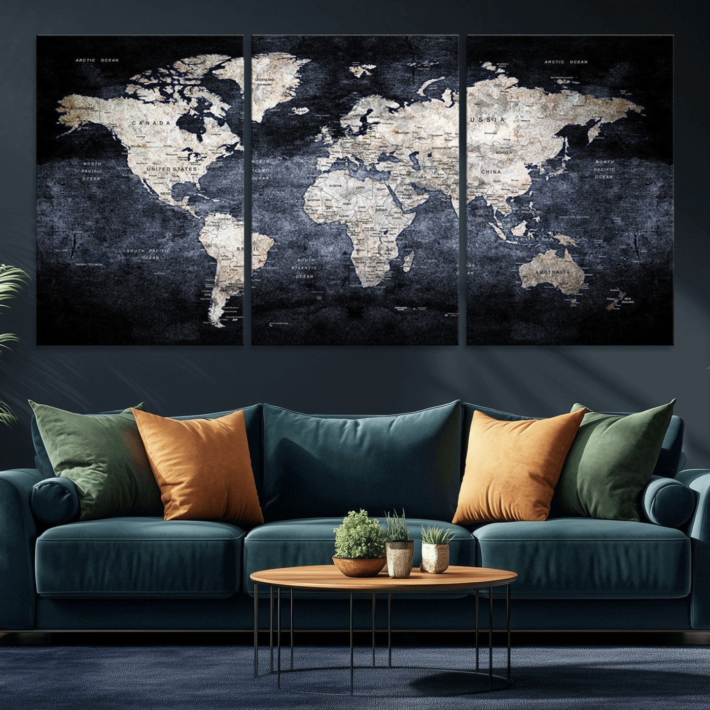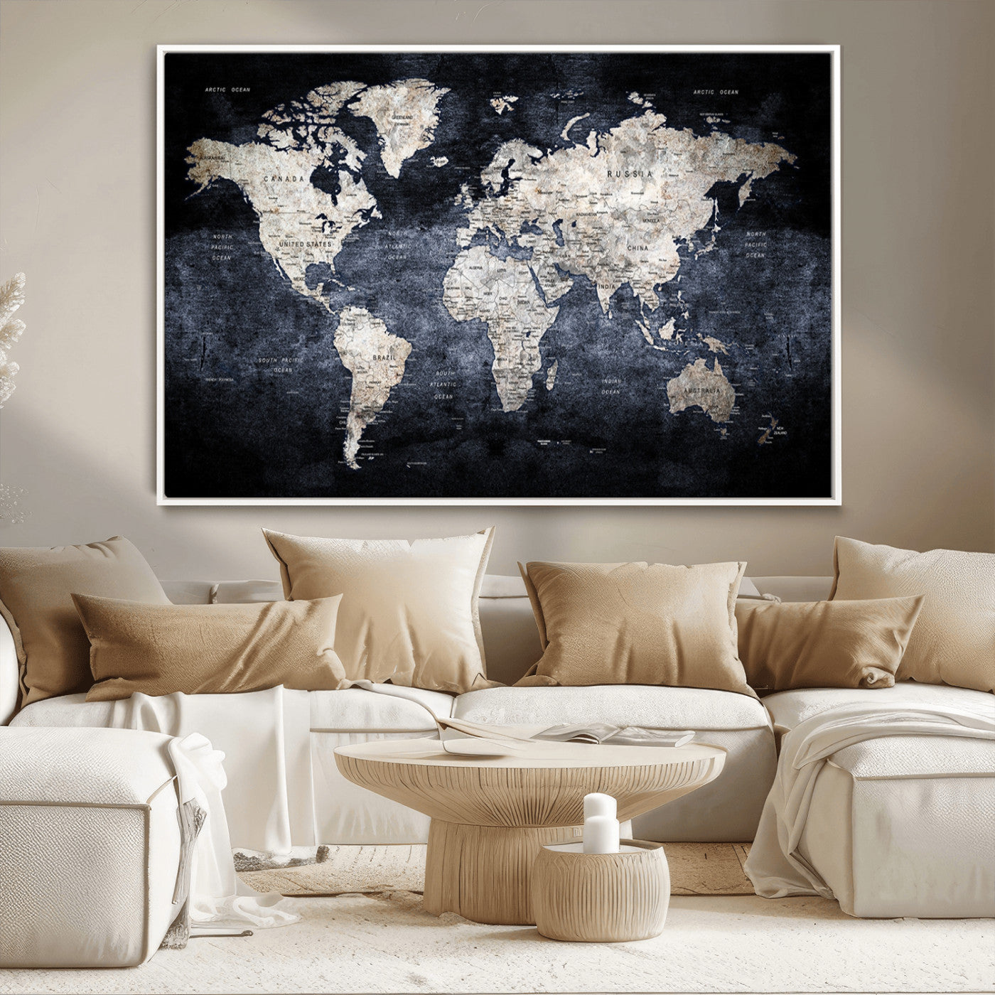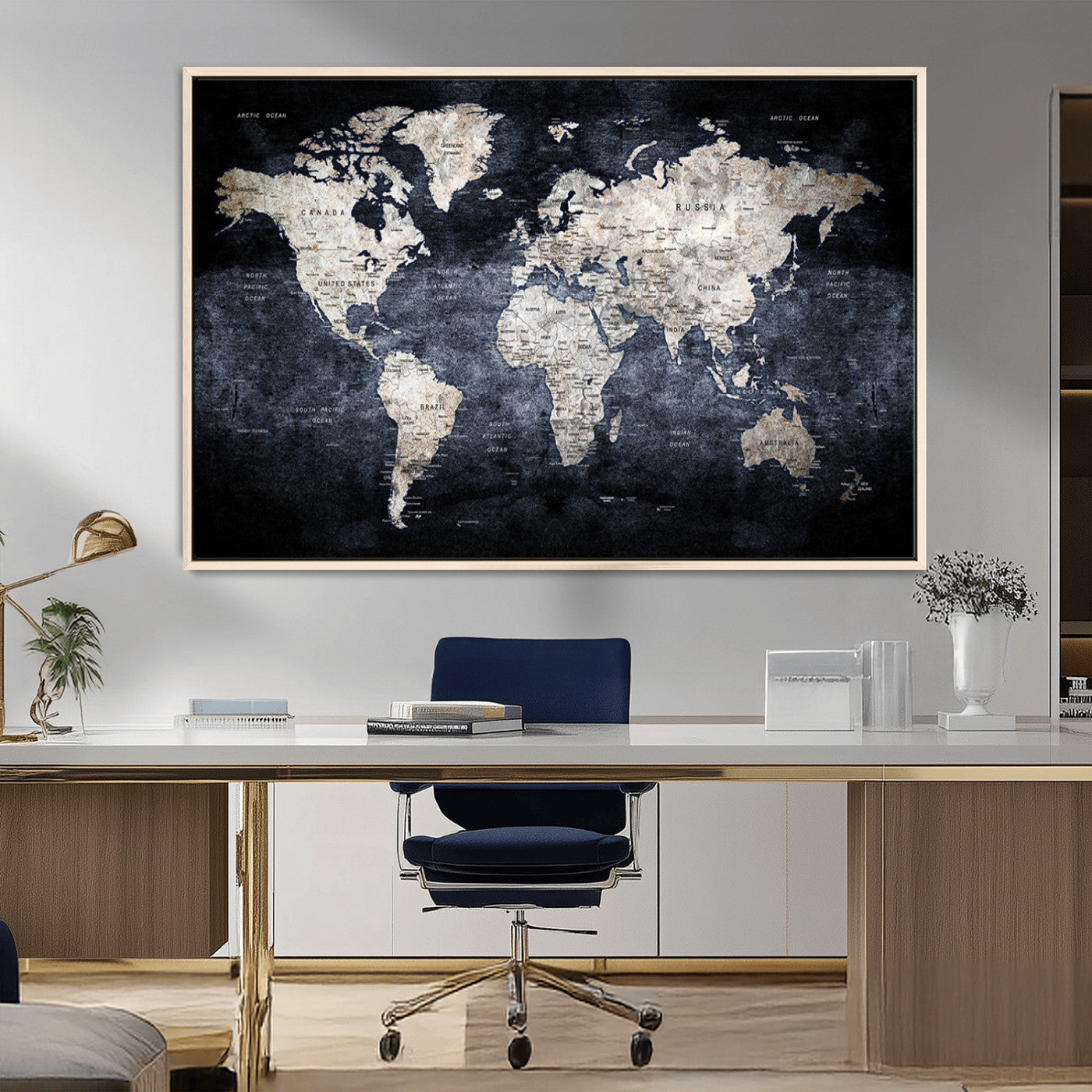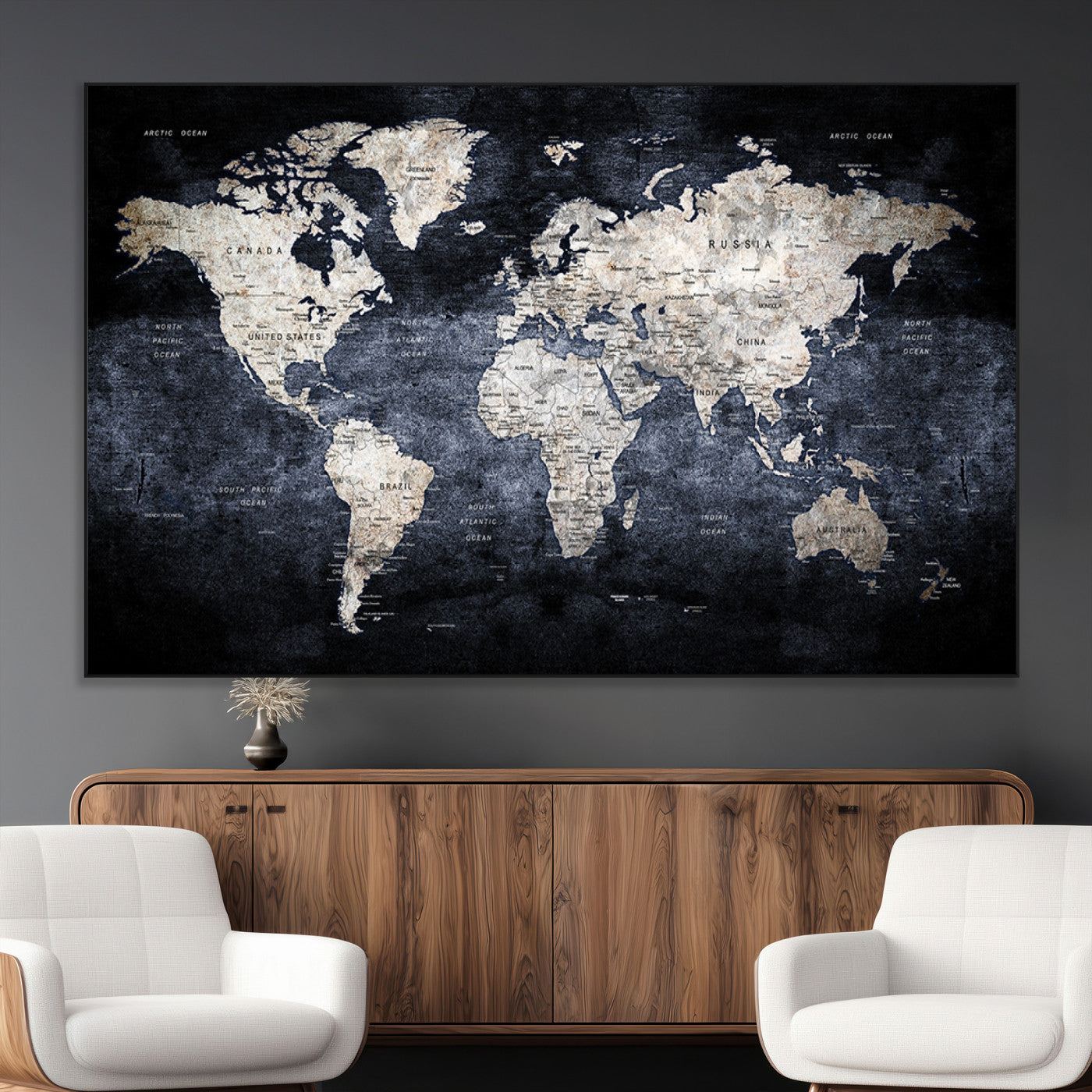 Modern Dark World Map Canvas Print – Framed Push Pin Wall Art, Elegant Travel Map Decoration for Home Office or Living Room Decor