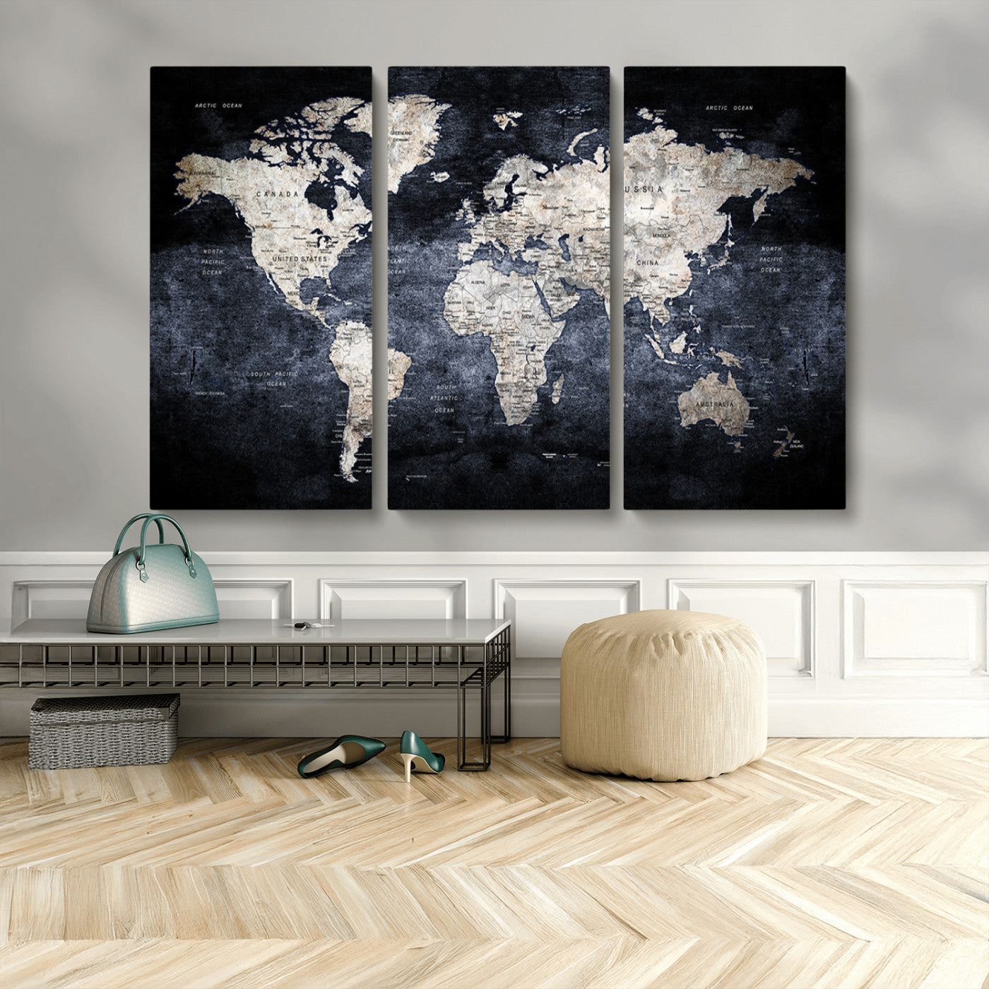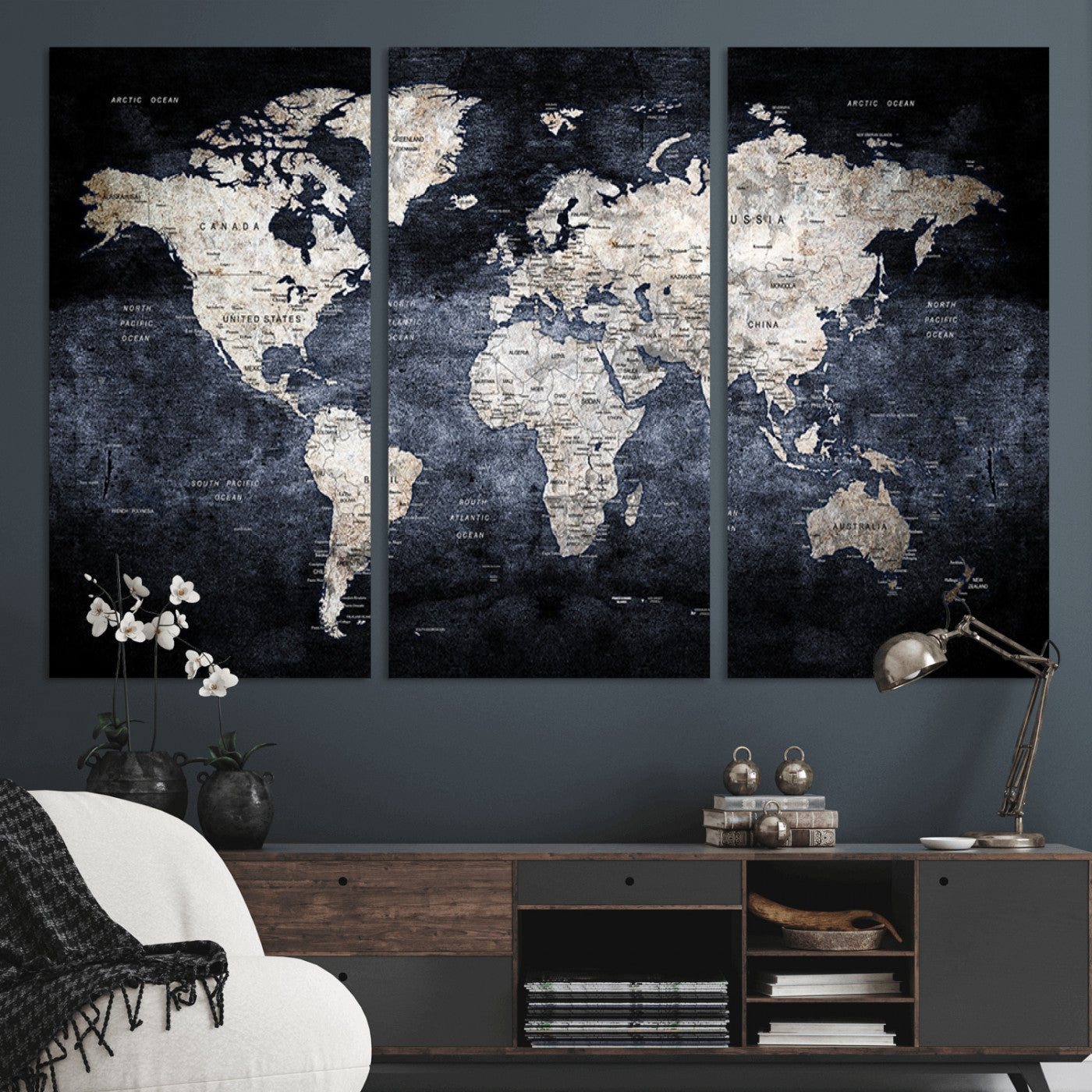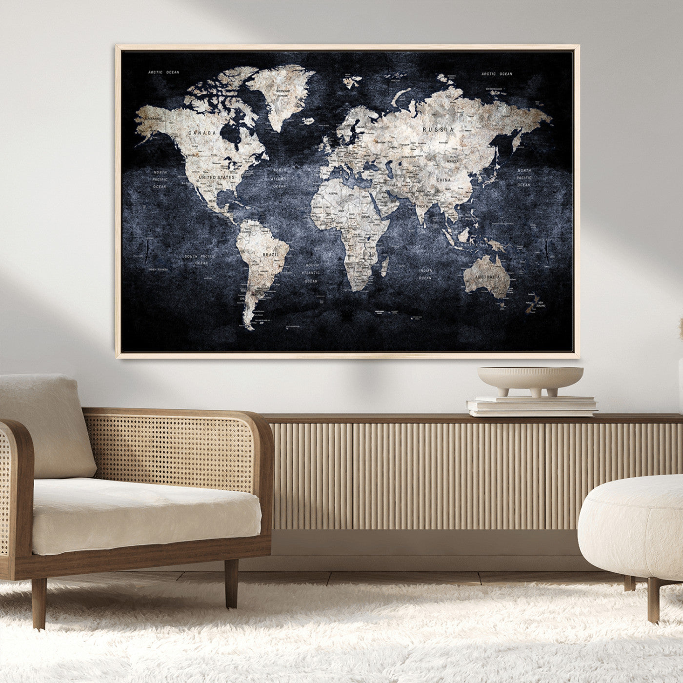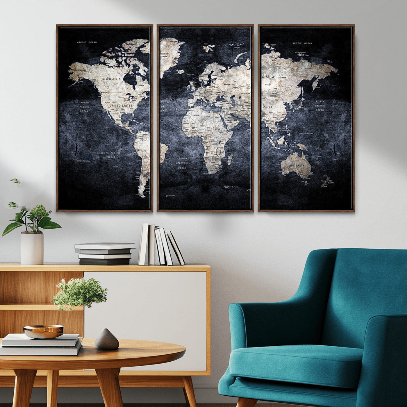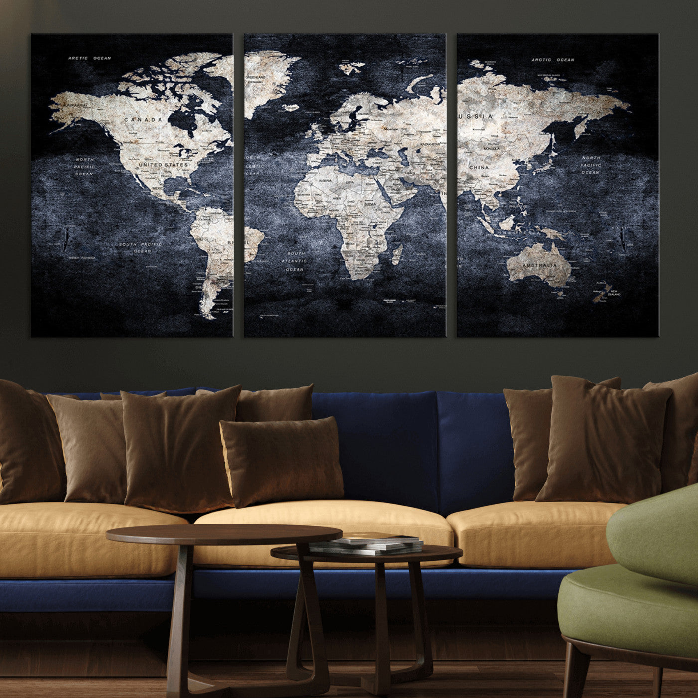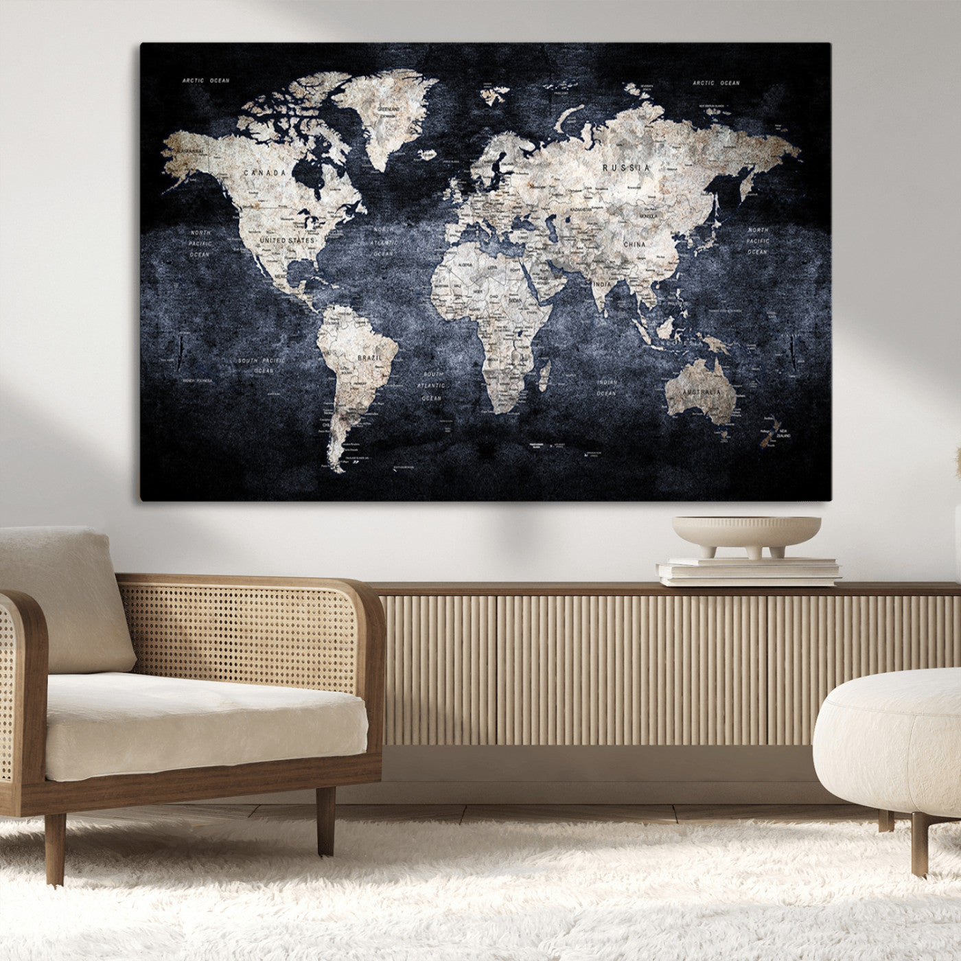 Modern Dark World Map Canvas Print – Framed Push Pin Wall Art, Elegant Travel Map Decoration for Home Office or Living Room Decor