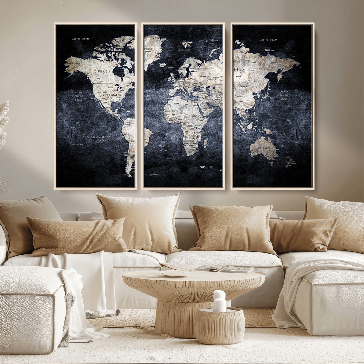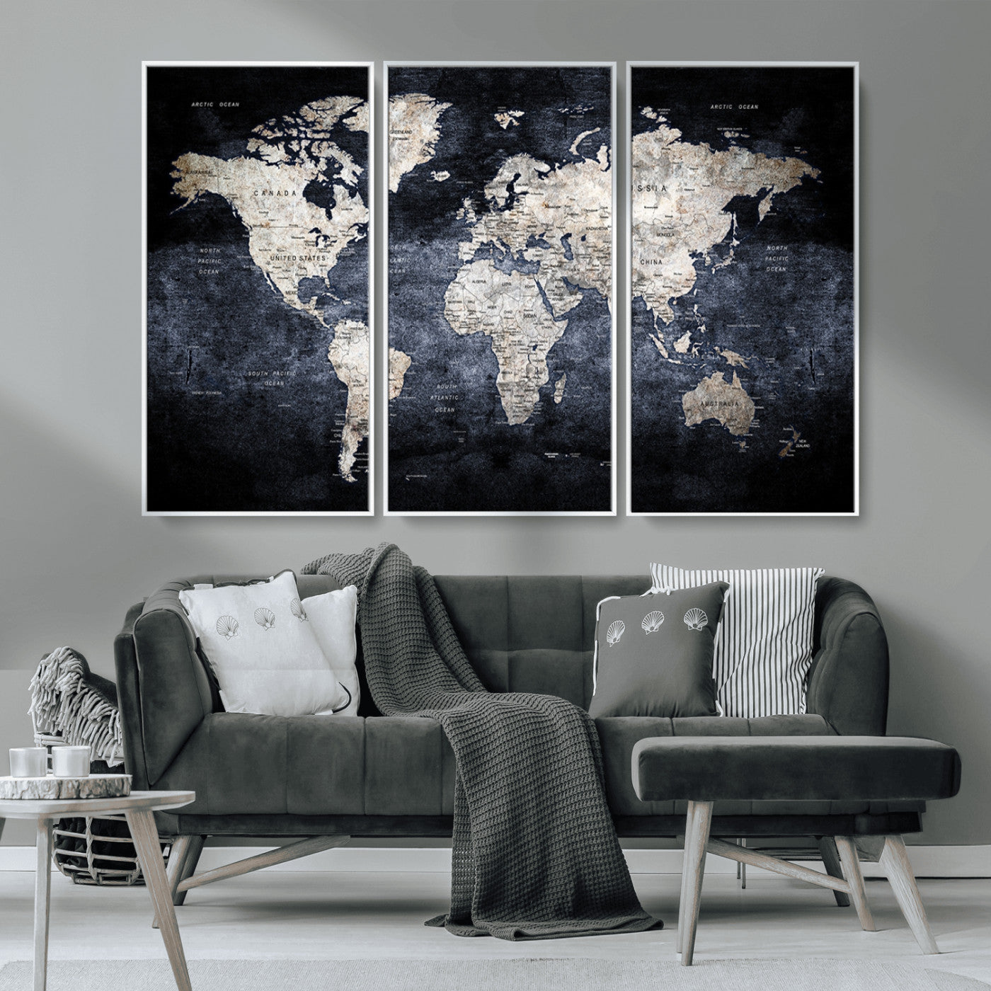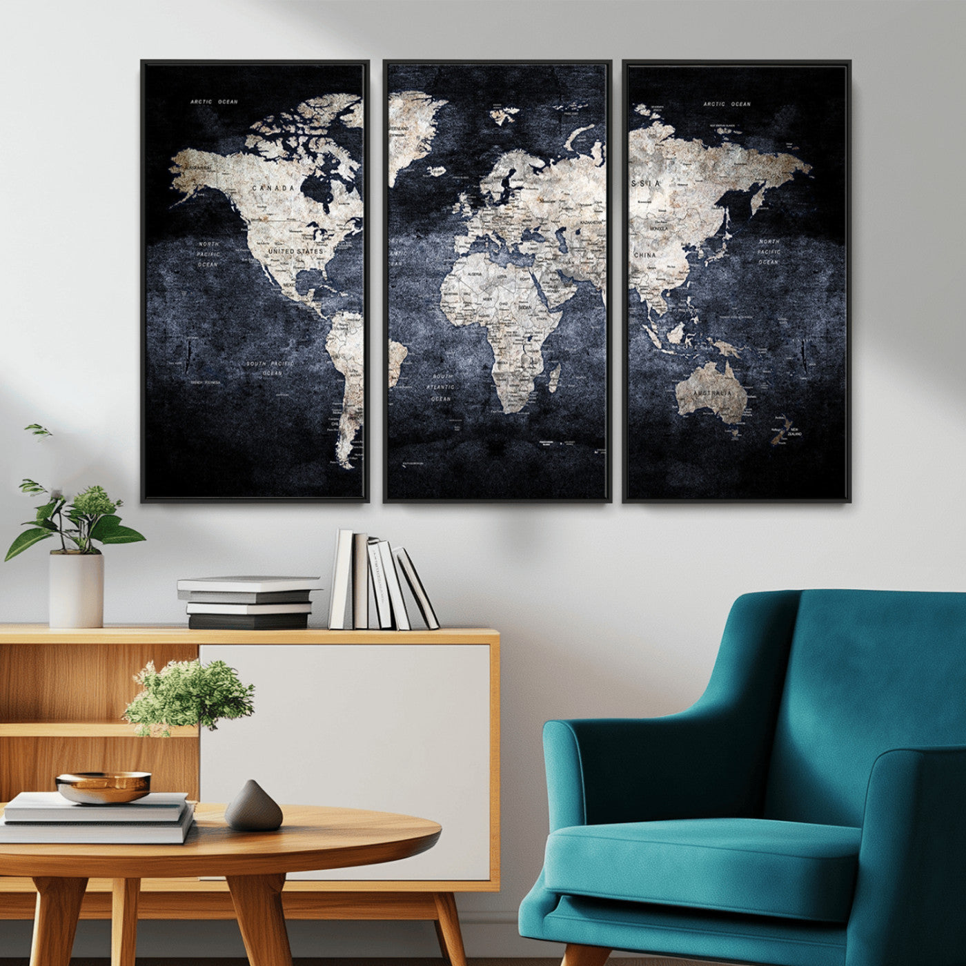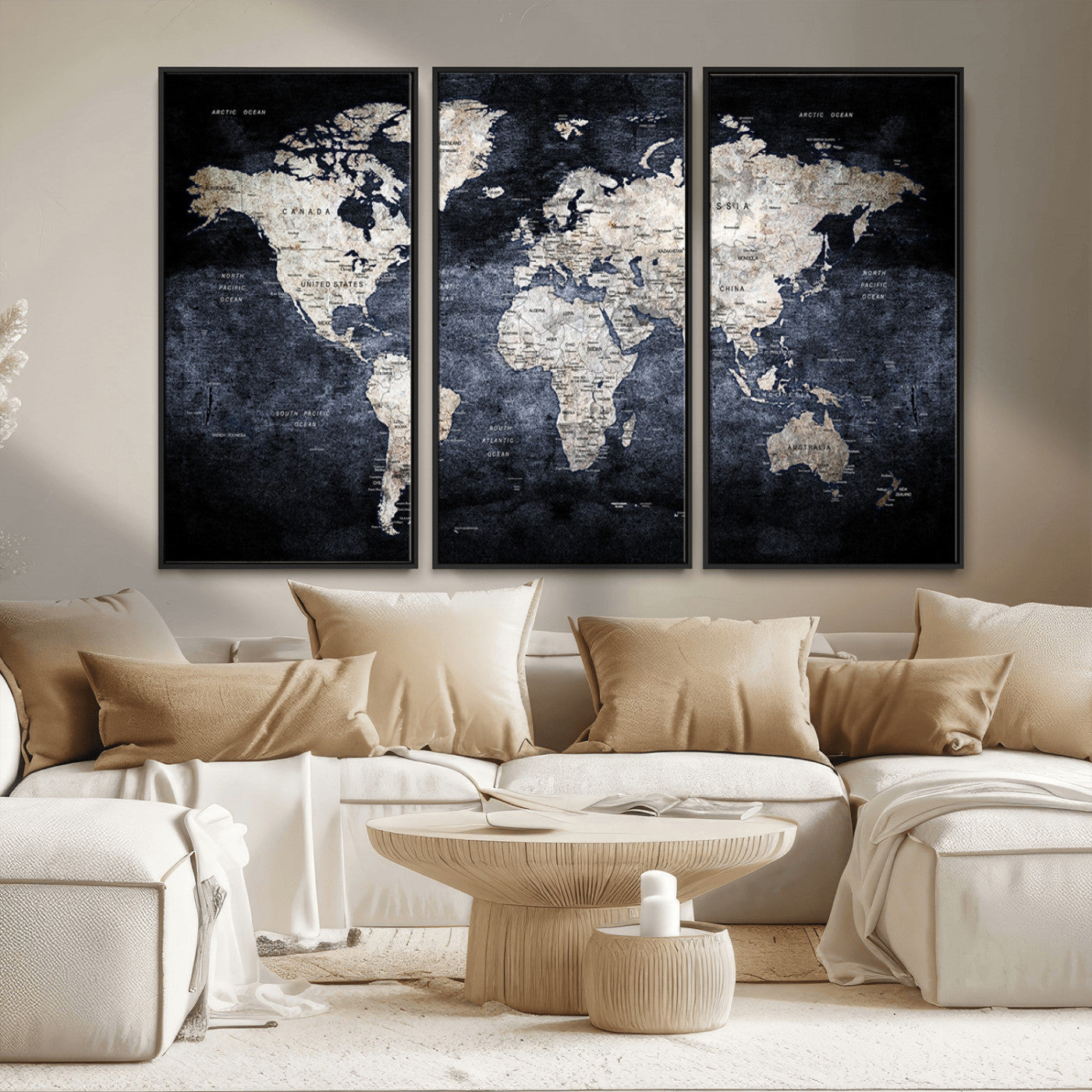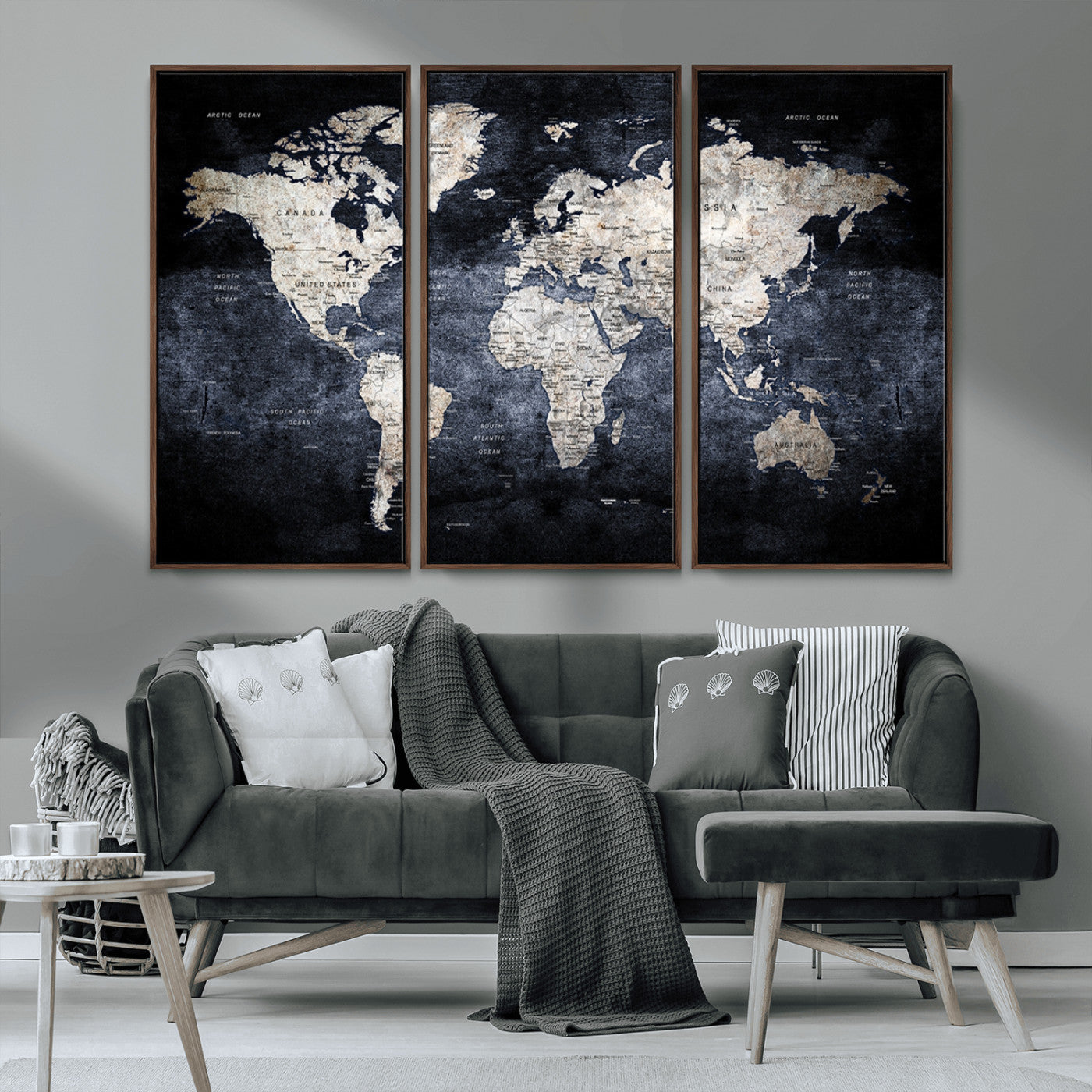 Modern Dark World Map Canvas Print – Framed Push Pin Wall Art, Elegant Travel Map Decoration for Home Office or Living Room Decor