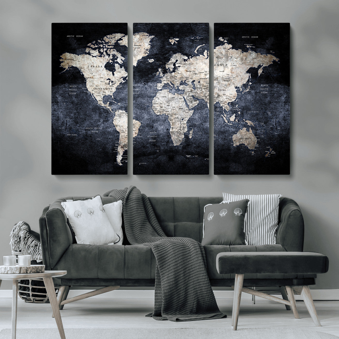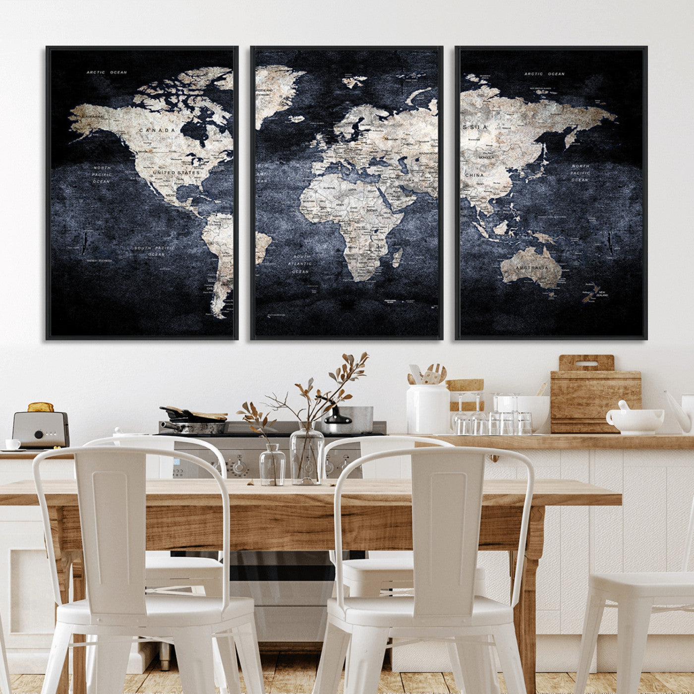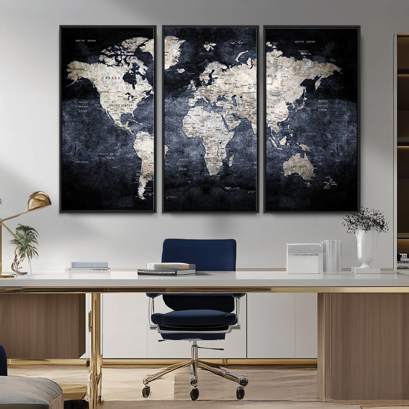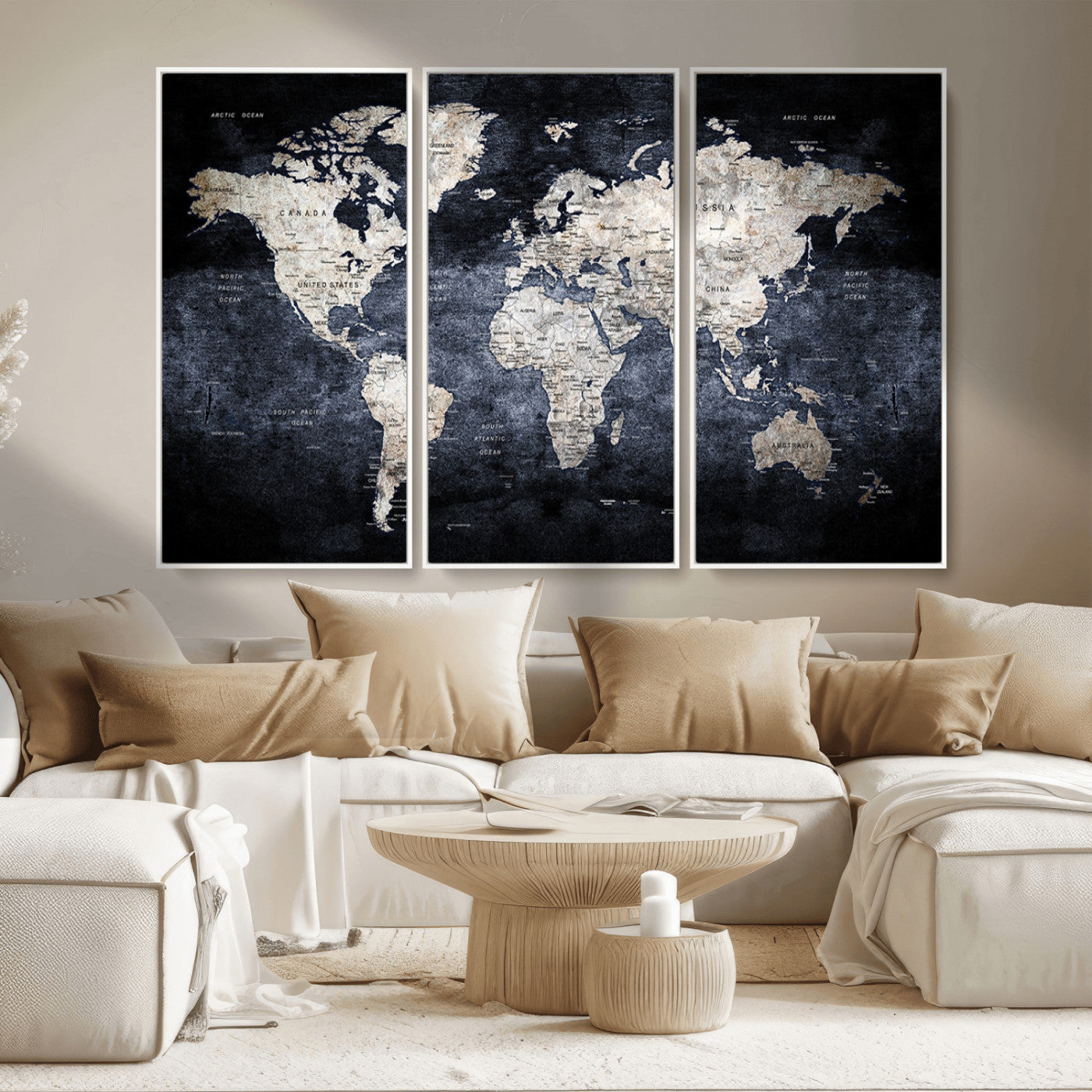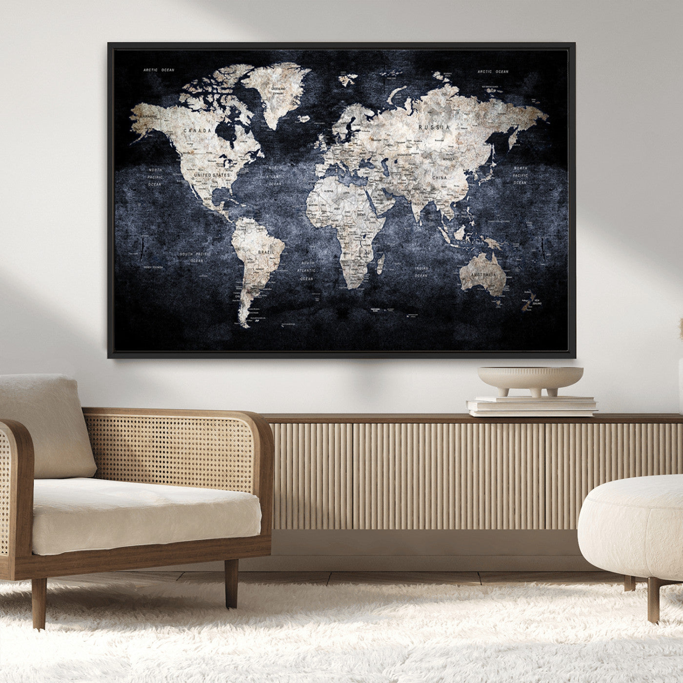 Modern Dark World Map Canvas Print – Framed Push Pin Wall Art, Elegant Travel Map Decoration for Home Office or Living Room Decor