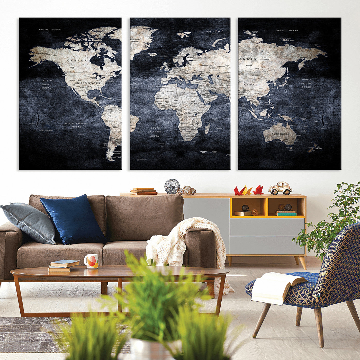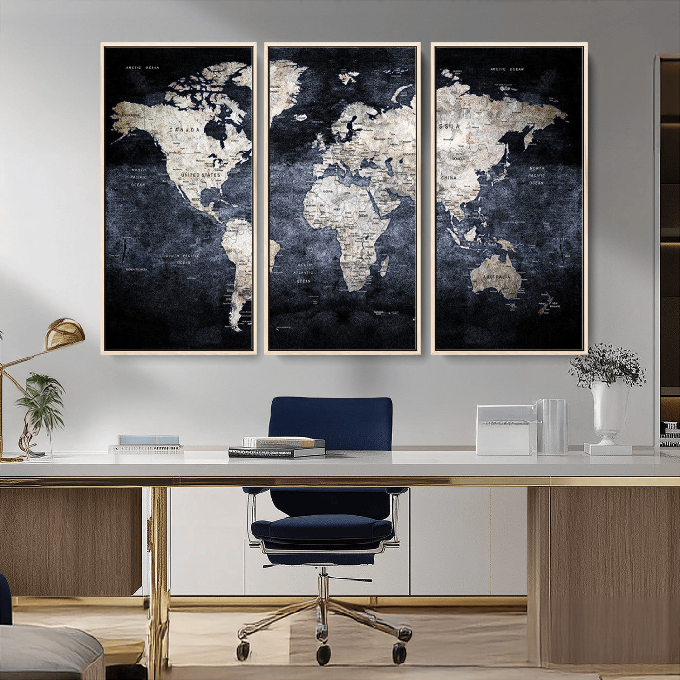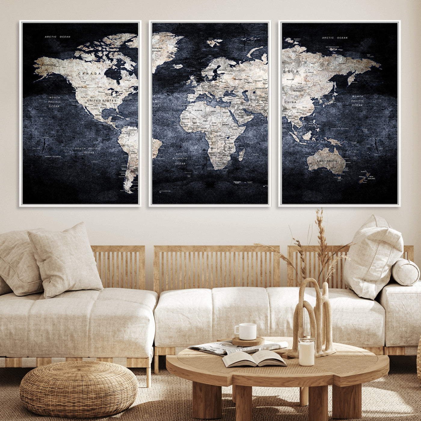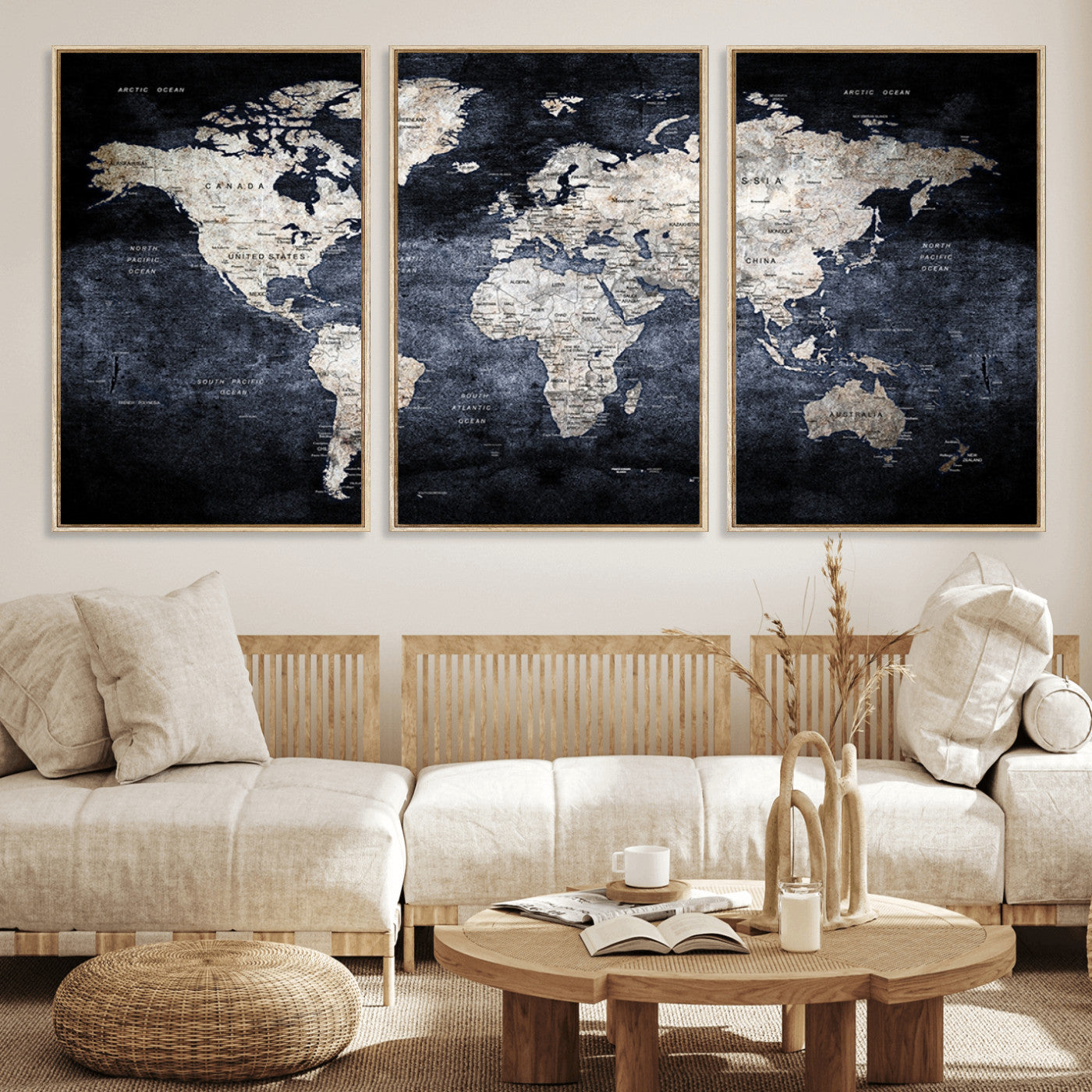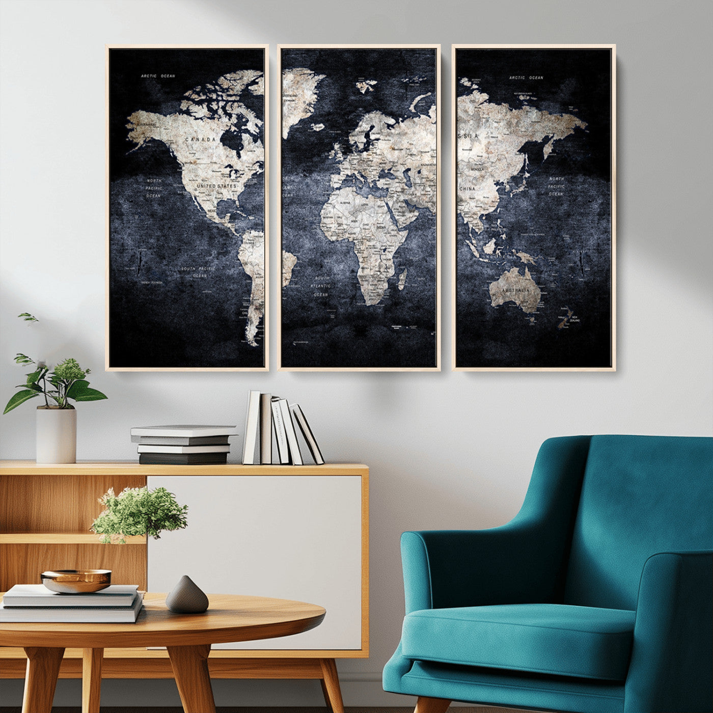 Modern Dark World Map Canvas Print – Framed Push Pin Wall Art, Elegant Travel Map Decoration for Home Office or Living Room Decor