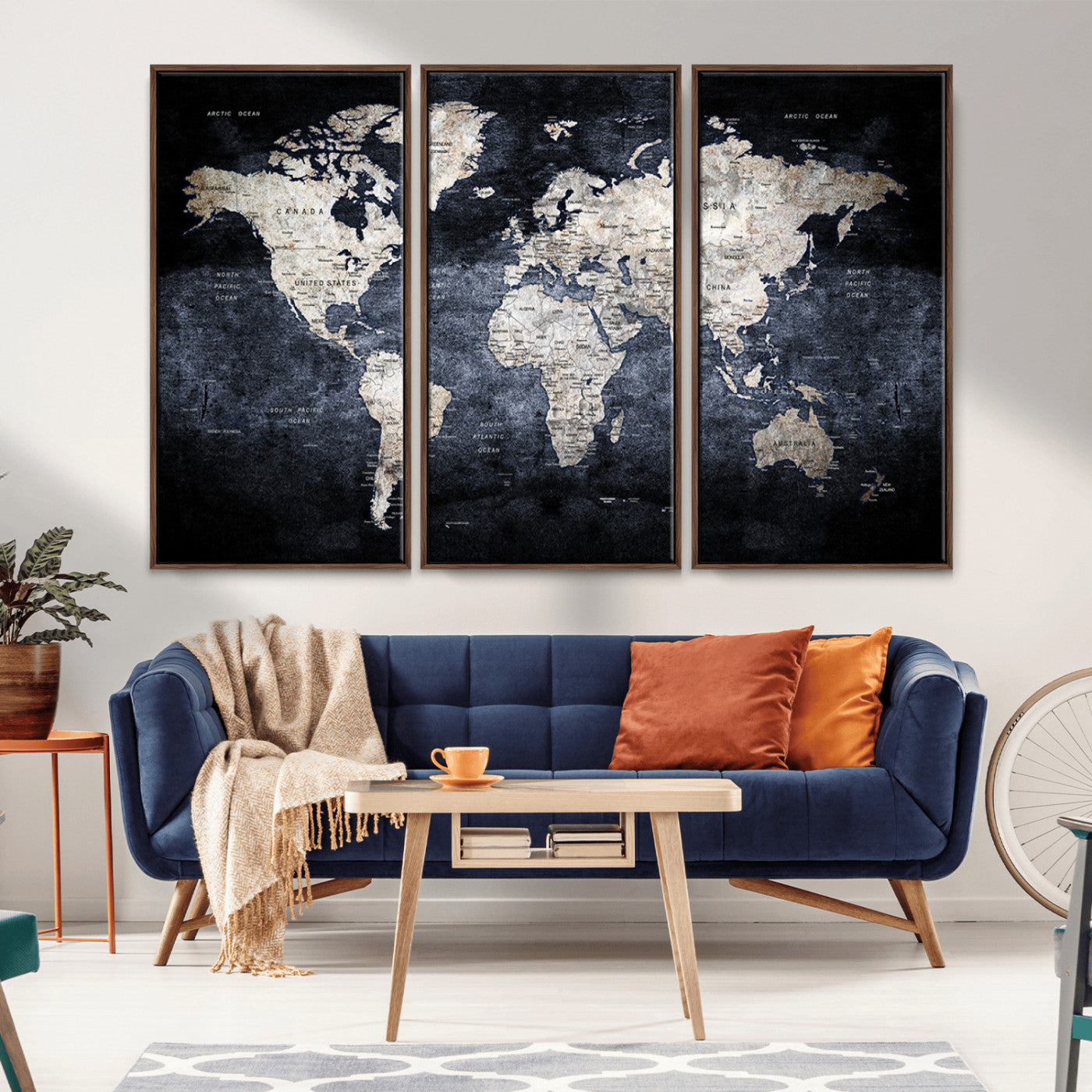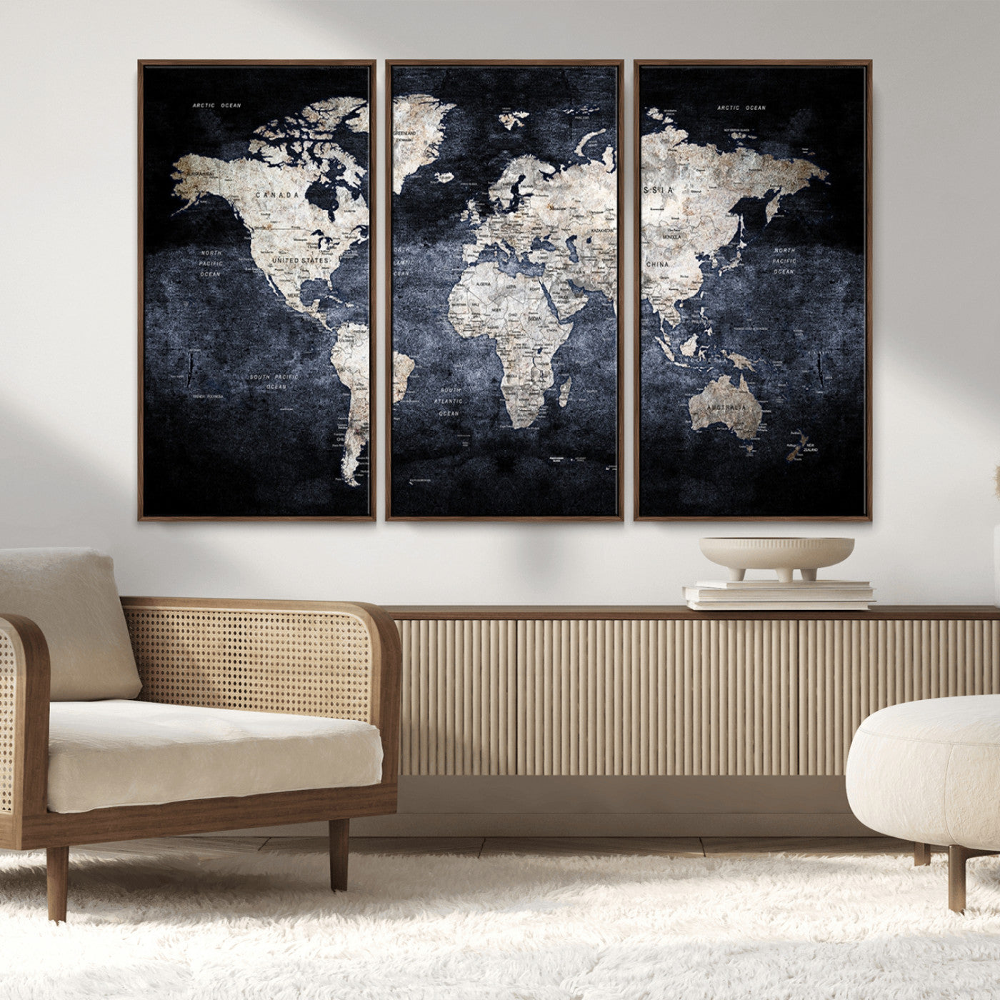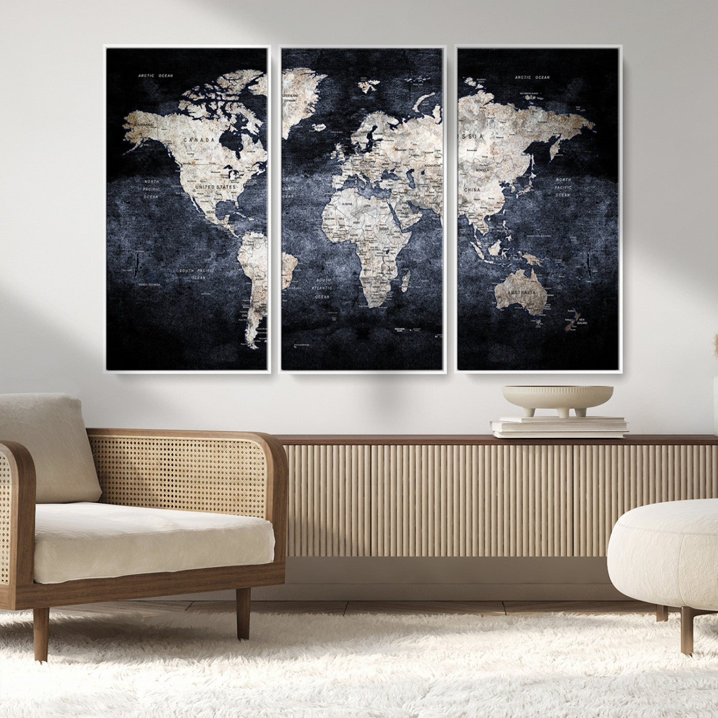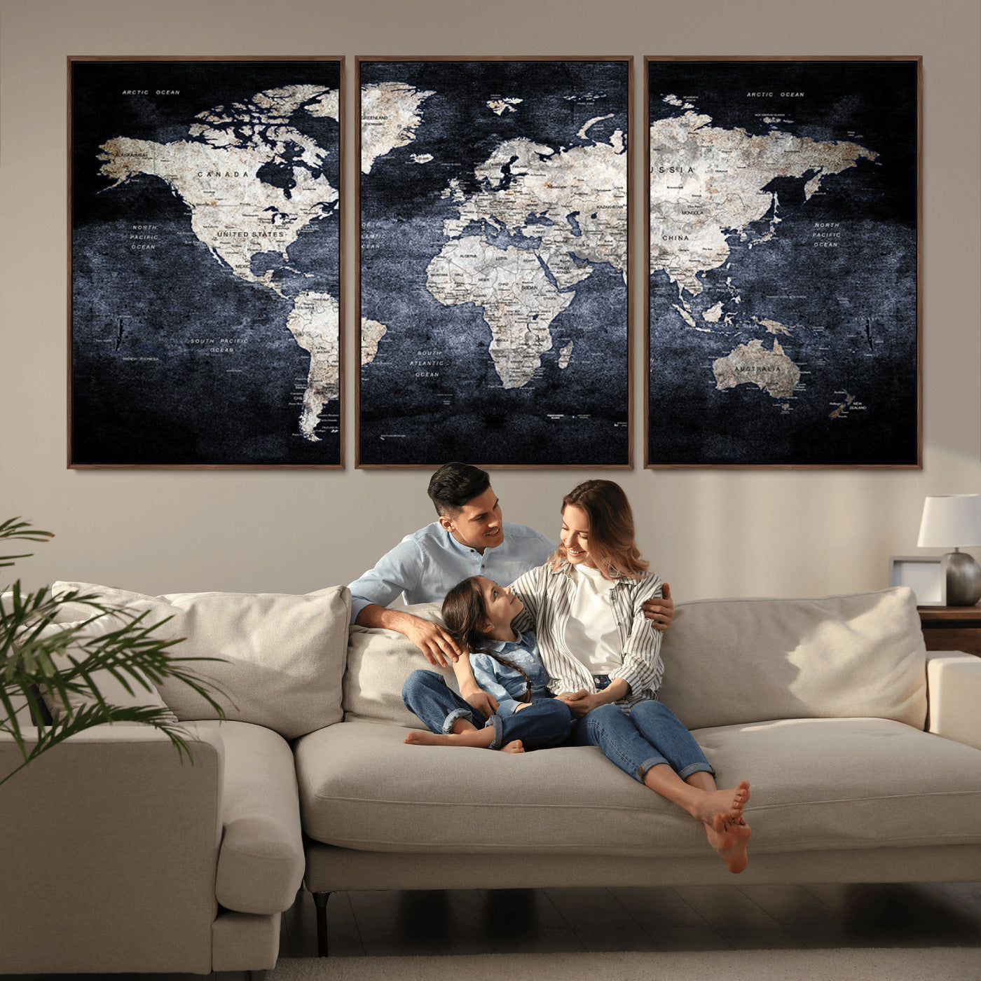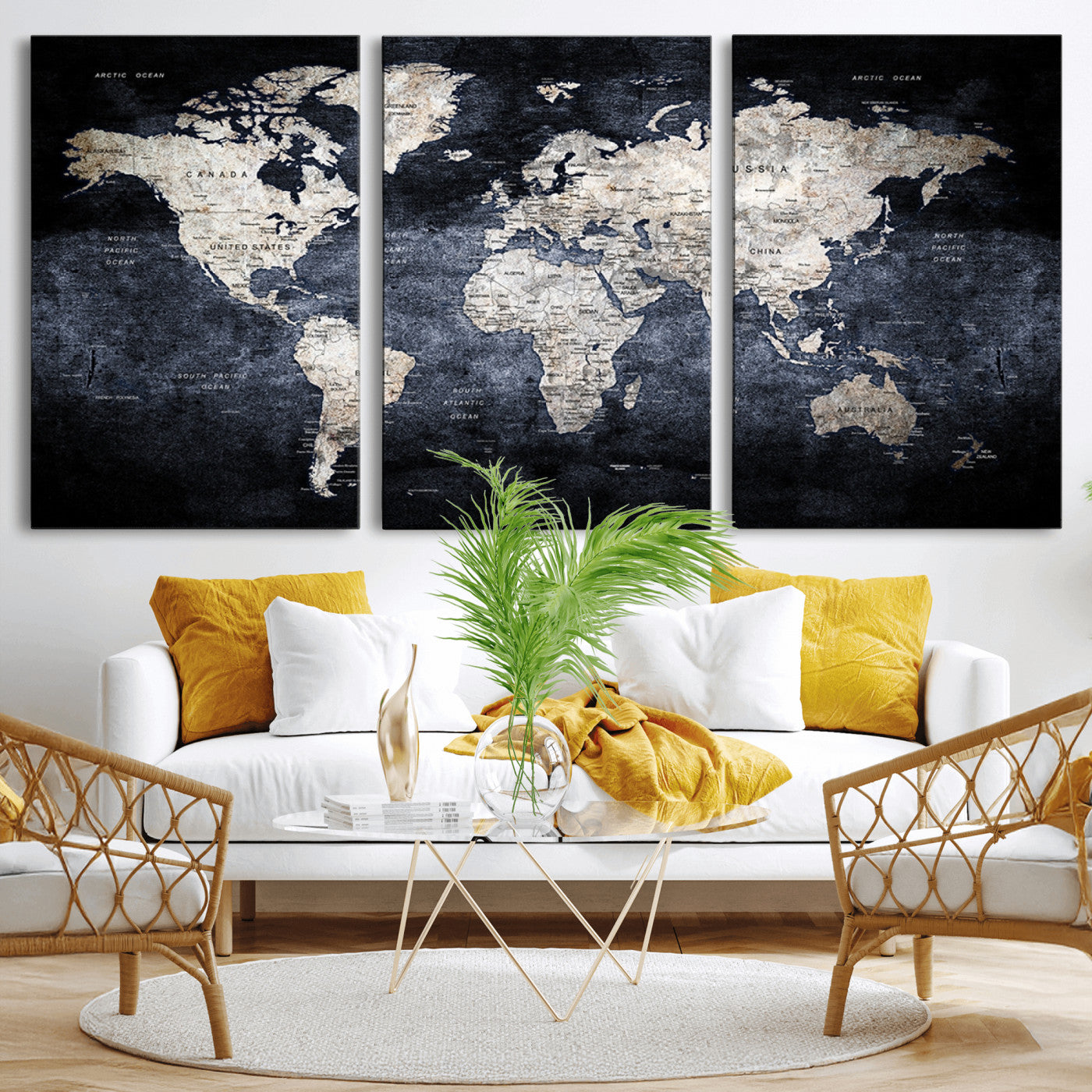 Modern Dark World Map Canvas Print – Framed Push Pin Wall Art, Elegant Travel Map Decoration for Home Office or Living Room Decor