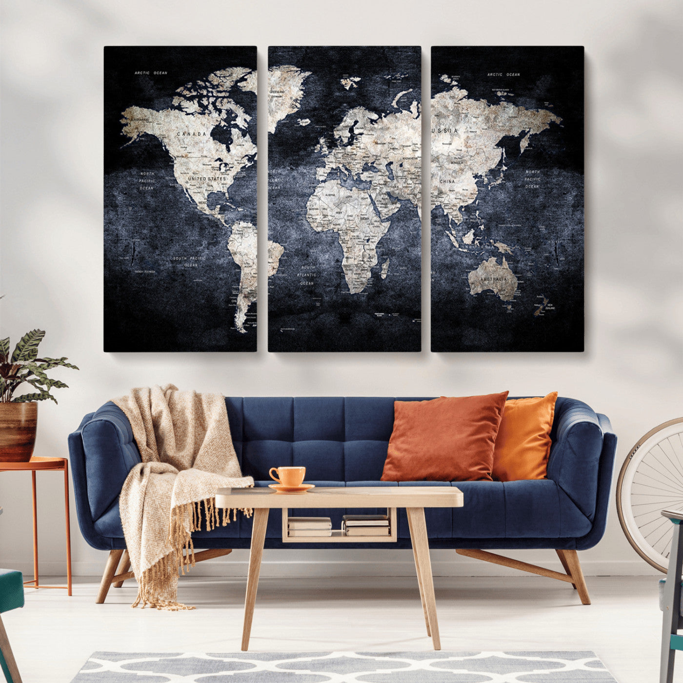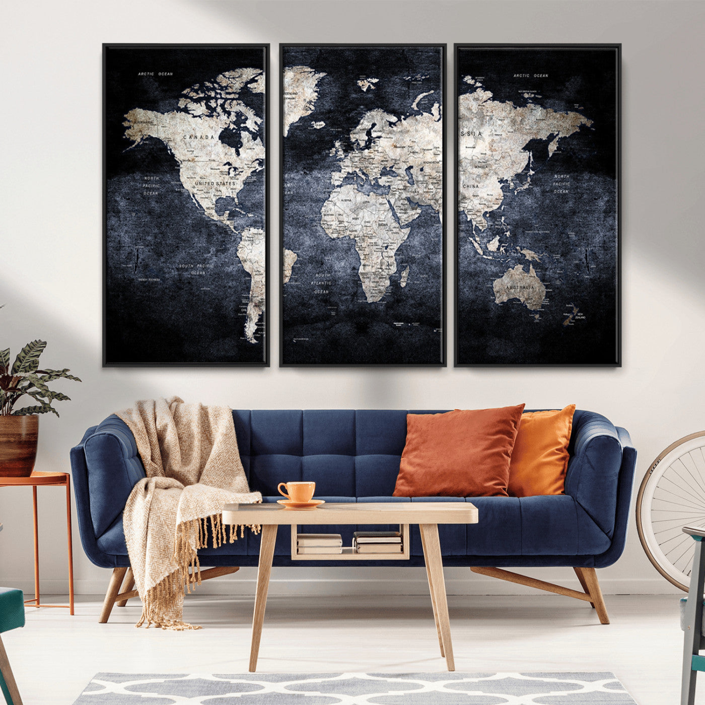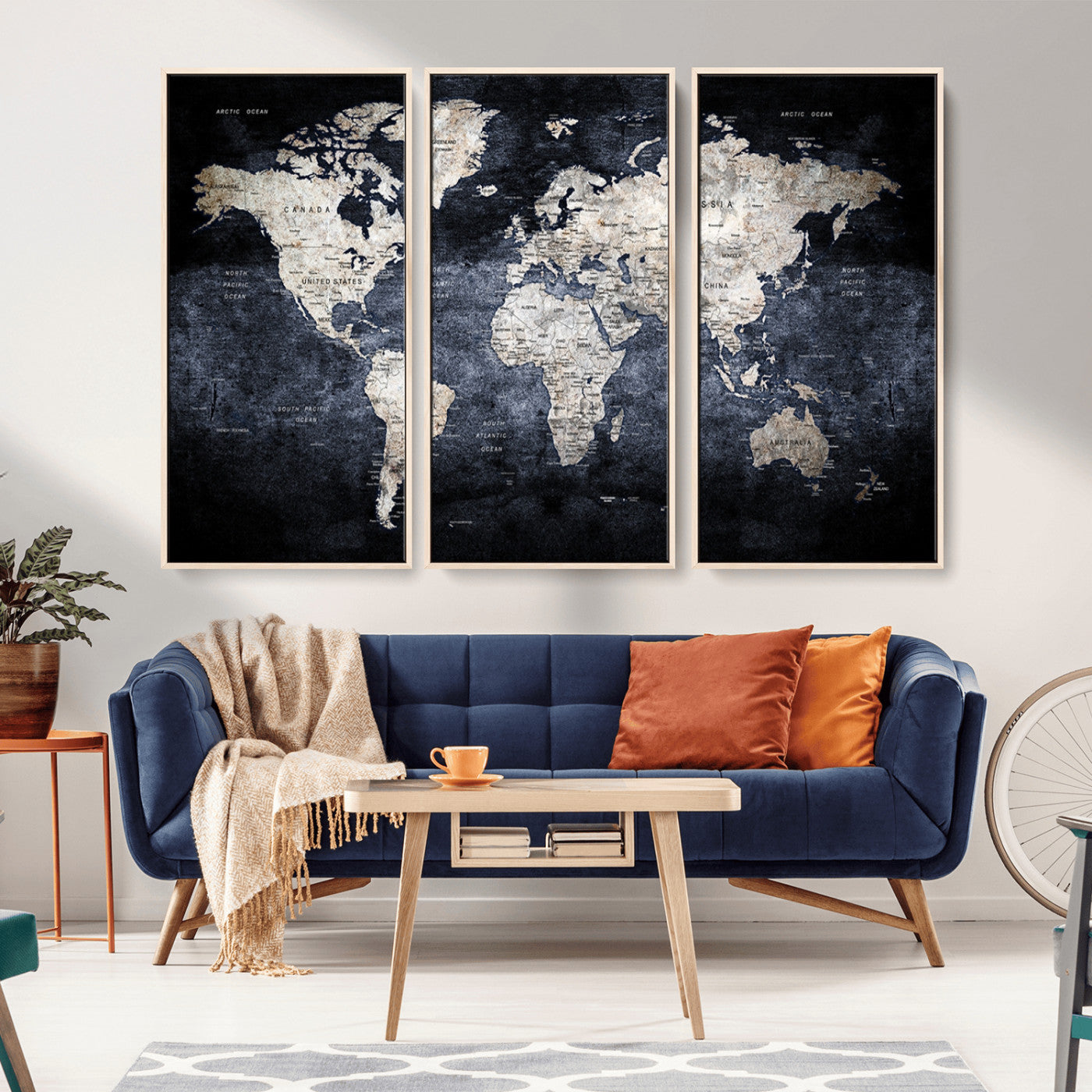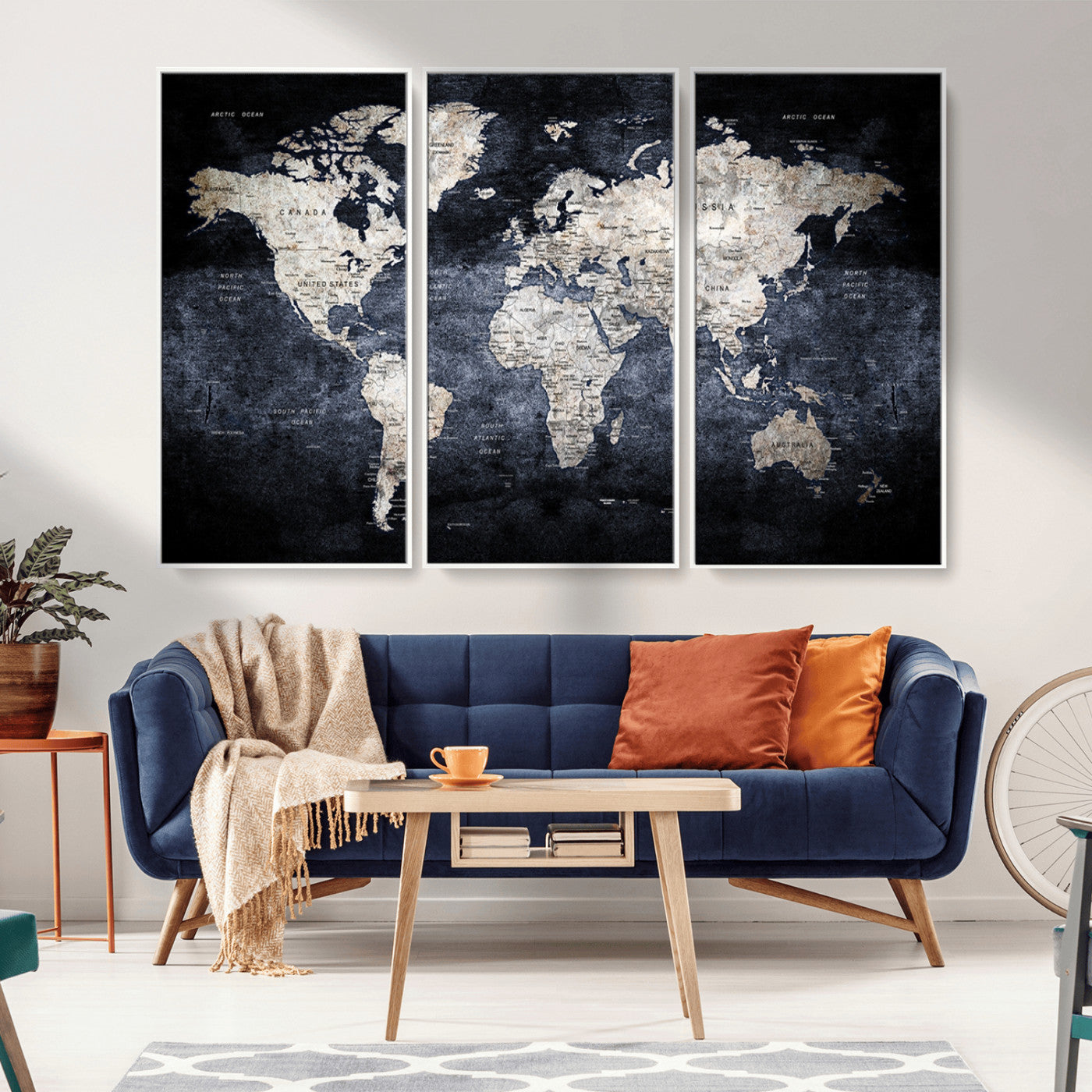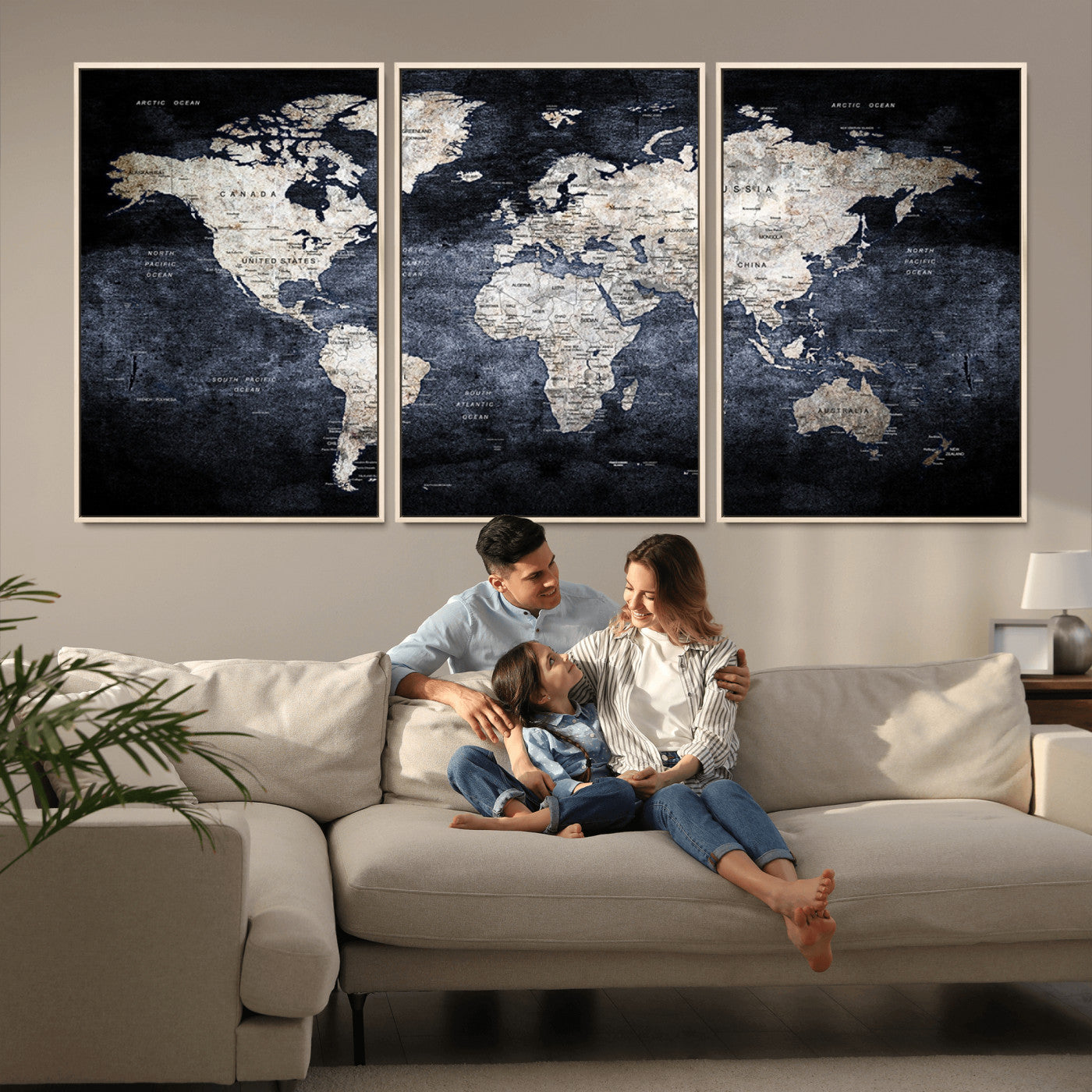 Modern Dark World Map Canvas Print – Framed Push Pin Wall Art, Elegant Travel Map Decoration for Home Office or Living Room Decor