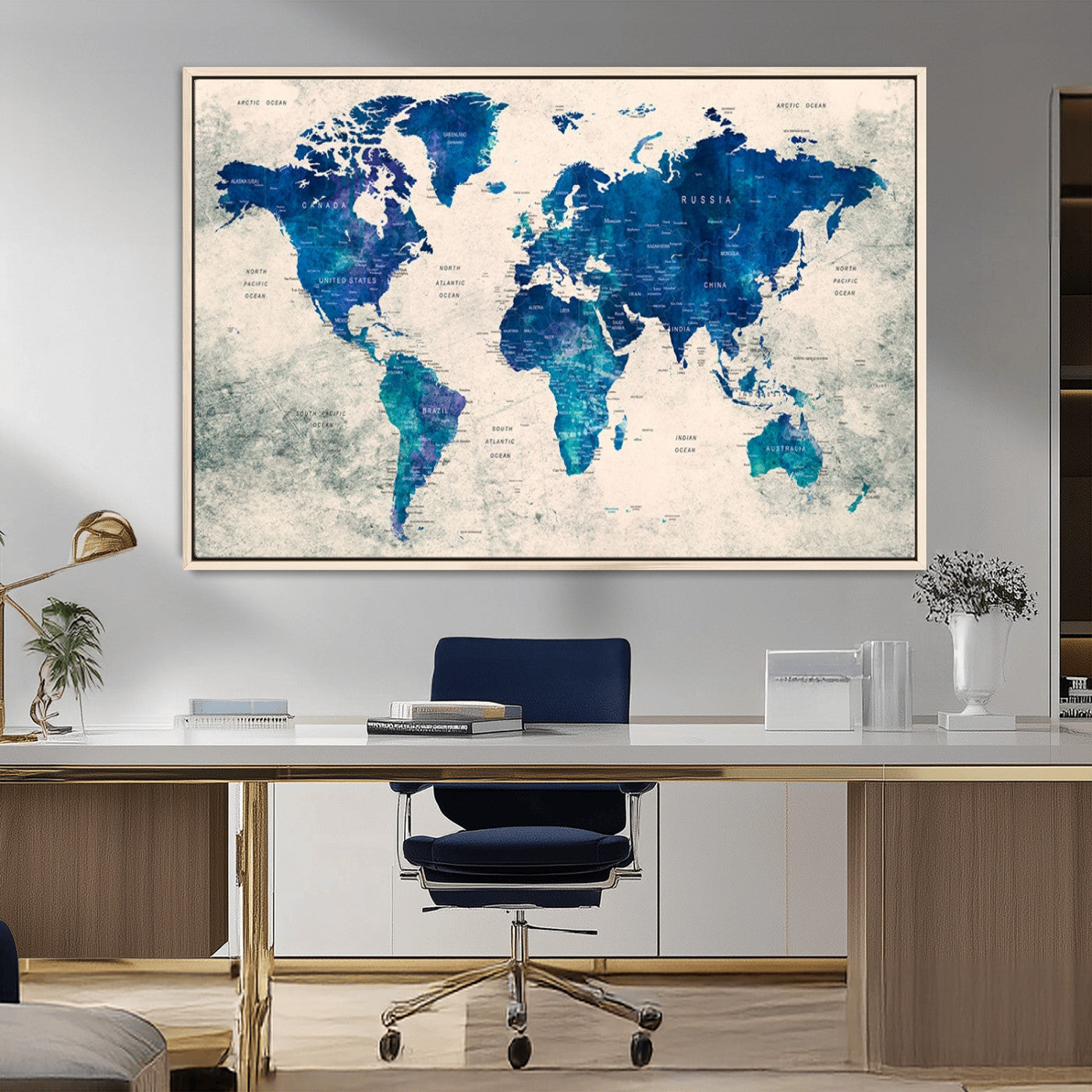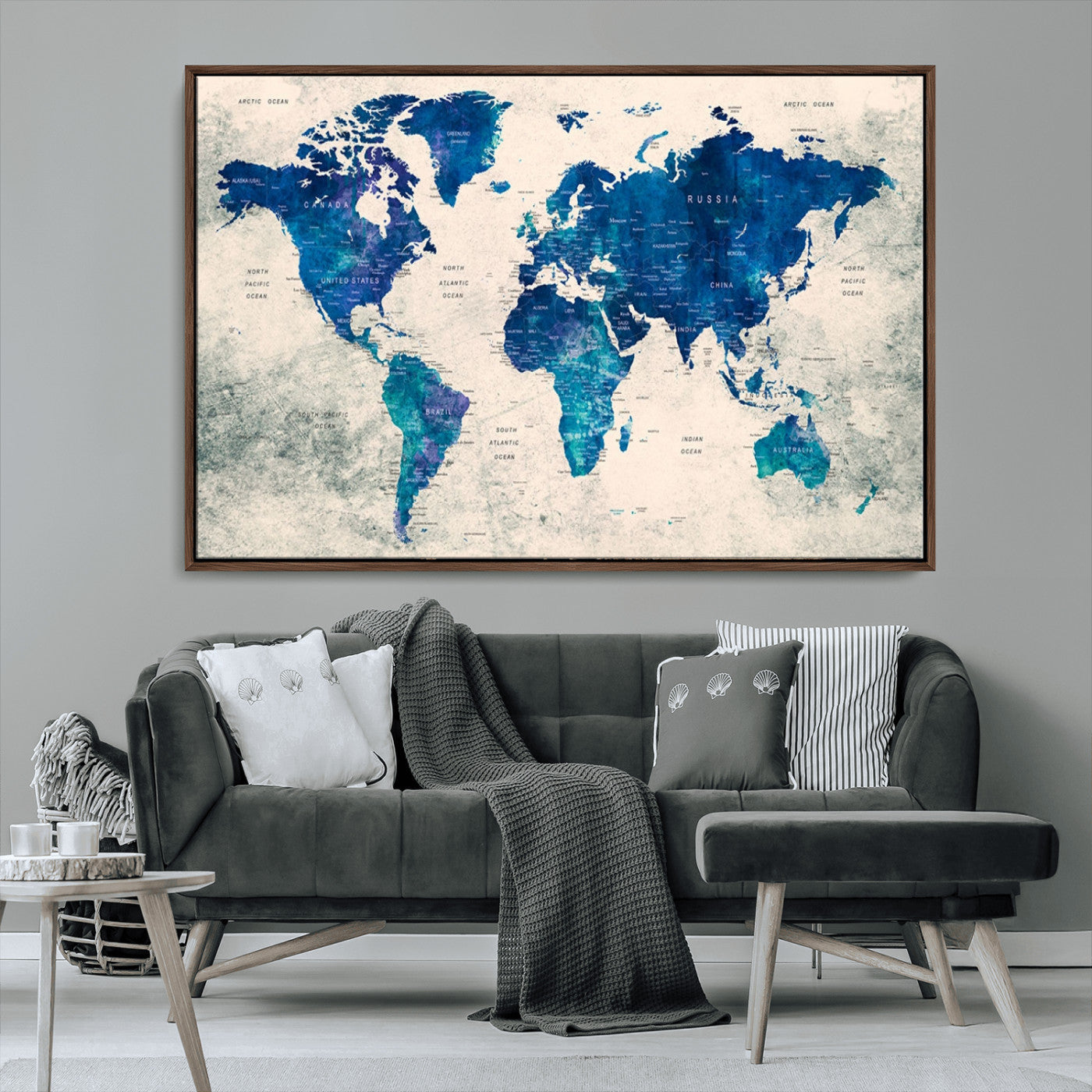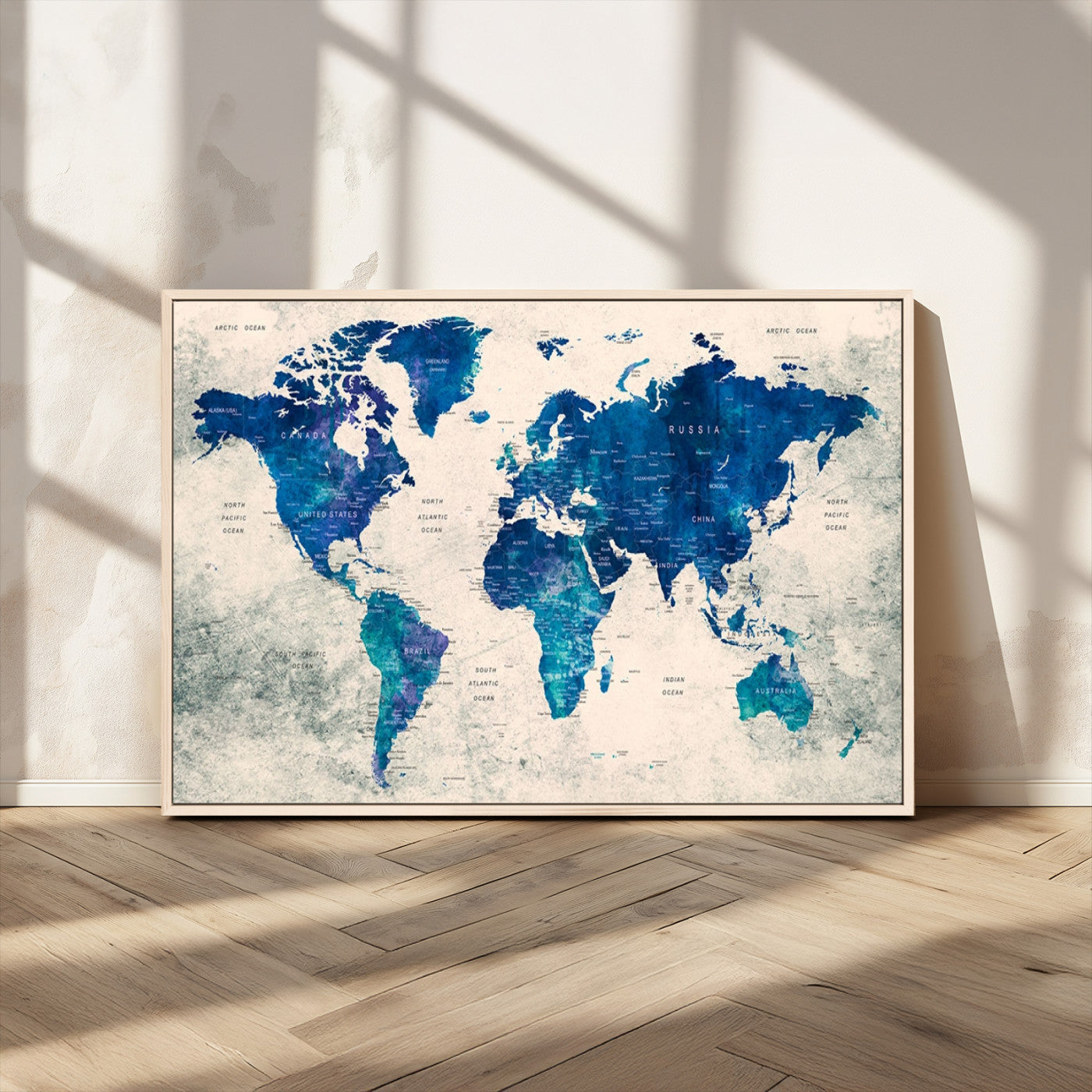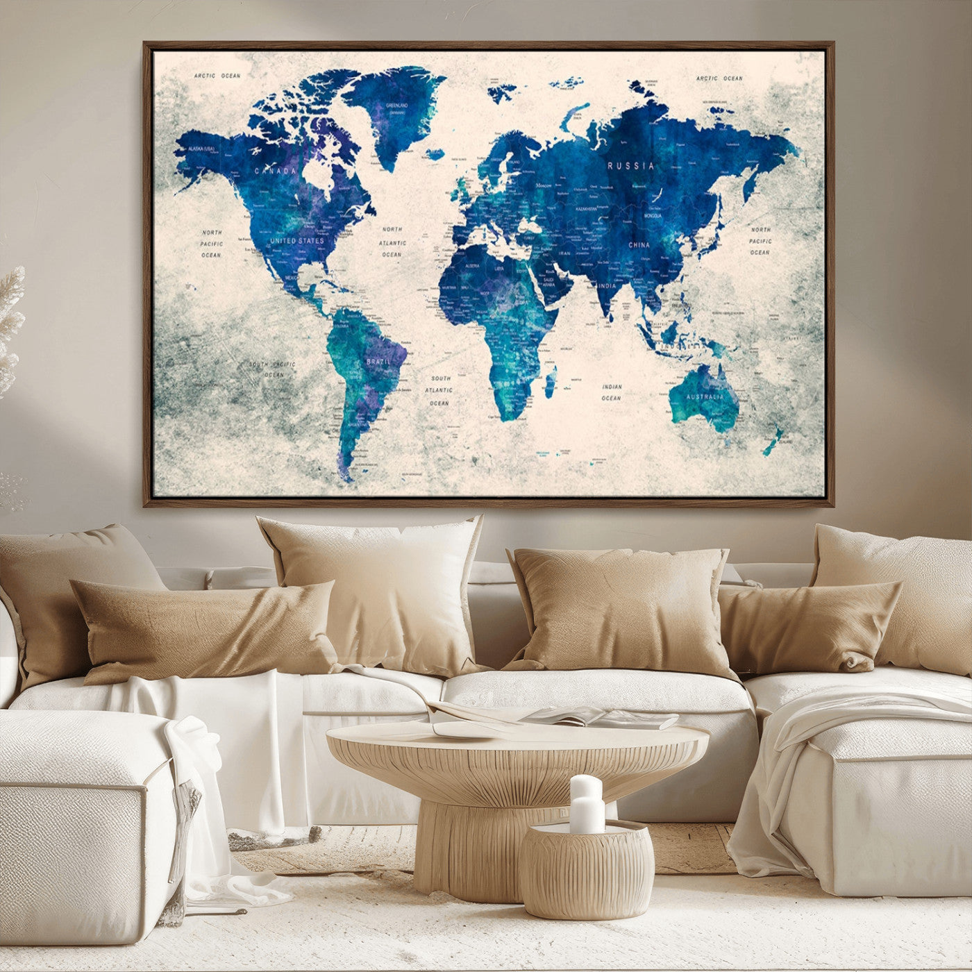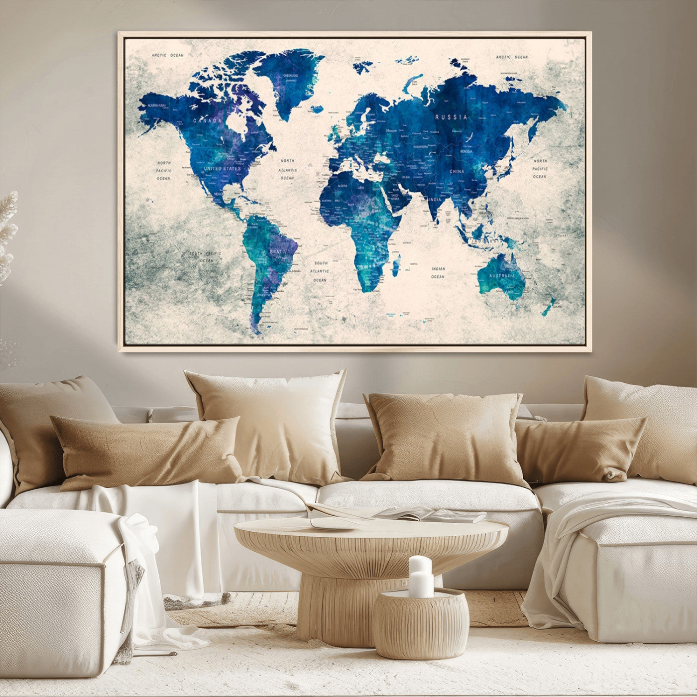 Blue Watercolor World Map Canvas Print – Framed Modern Wall Art, Elegant Push Pin Travel Map Decor for Home Office or Living Room