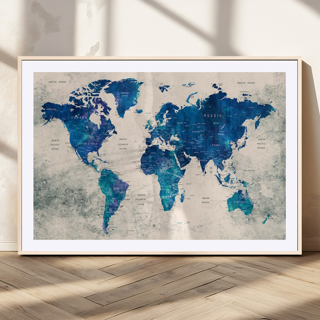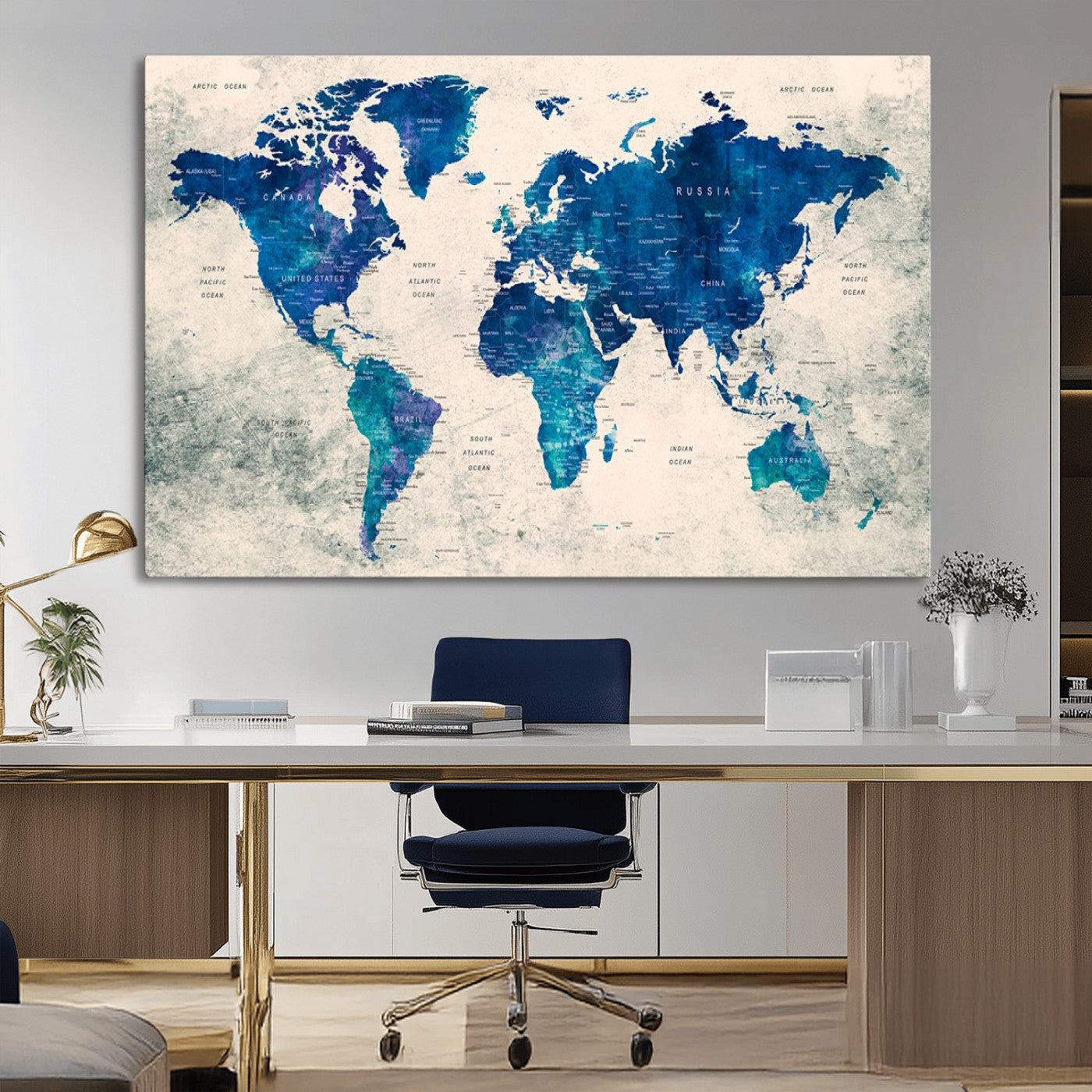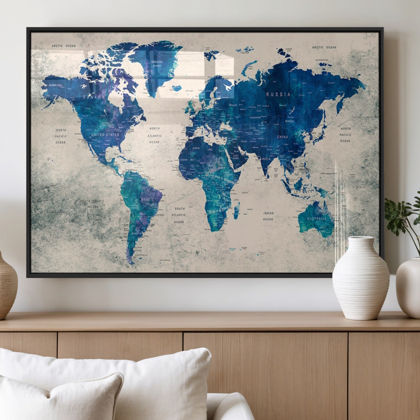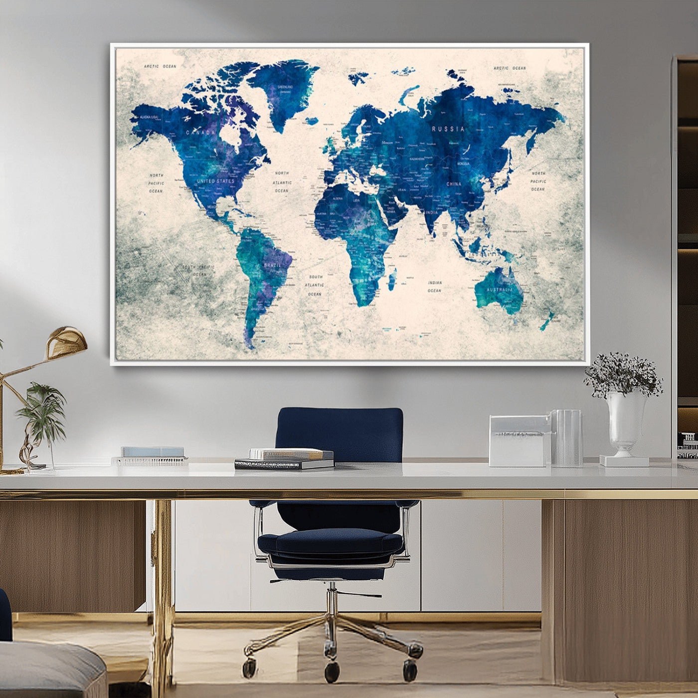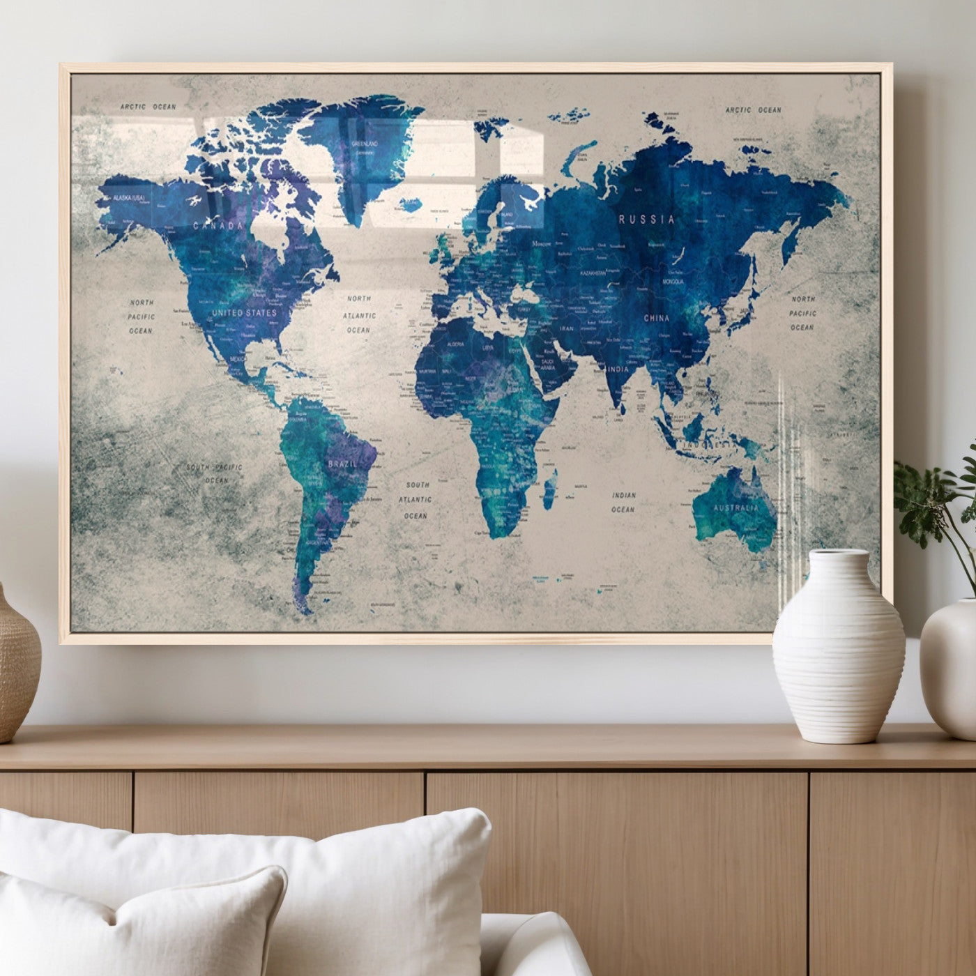 Blue Watercolor World Map Canvas Print – Framed Modern Wall Art, Elegant Push Pin Travel Map Decor for Home Office or Living Room