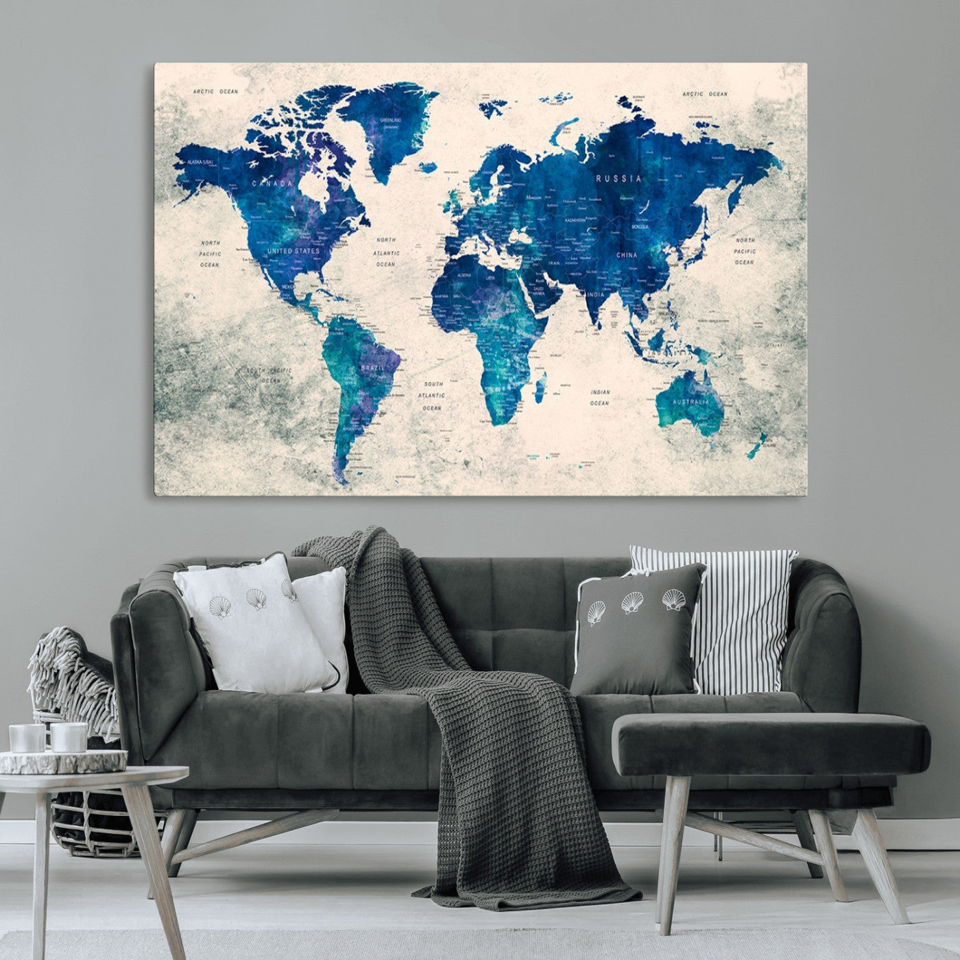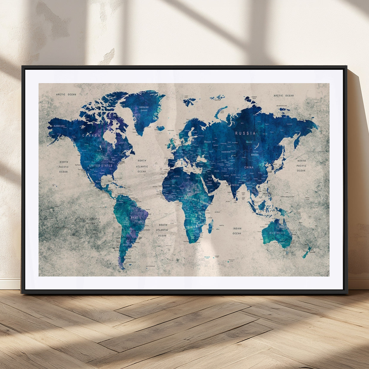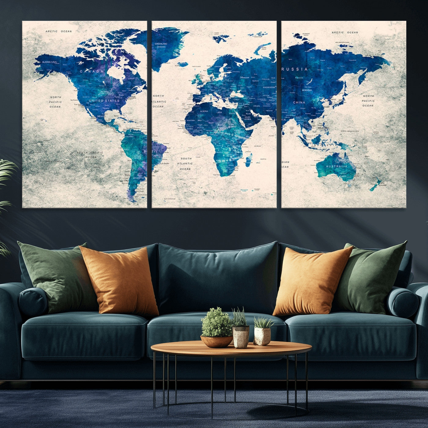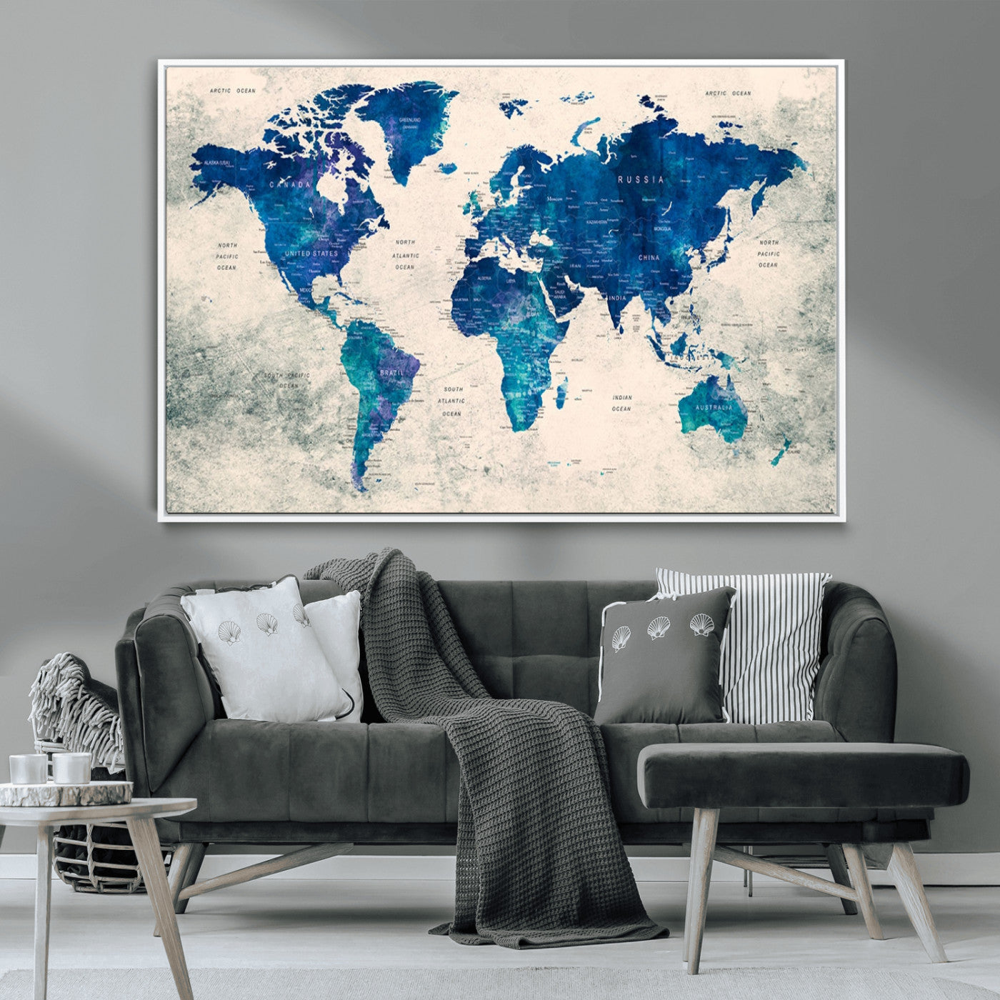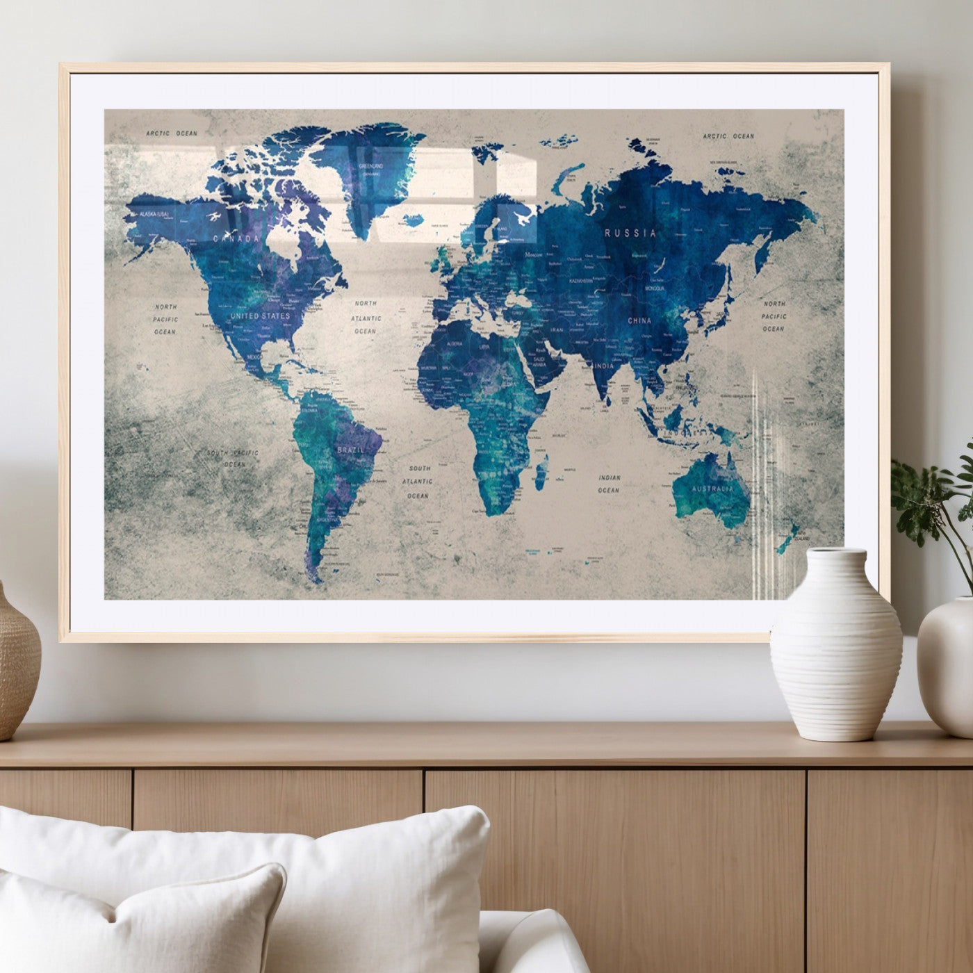 Blue Watercolor World Map Canvas Print – Framed Modern Wall Art, Elegant Push Pin Travel Map Decor for Home Office or Living Room