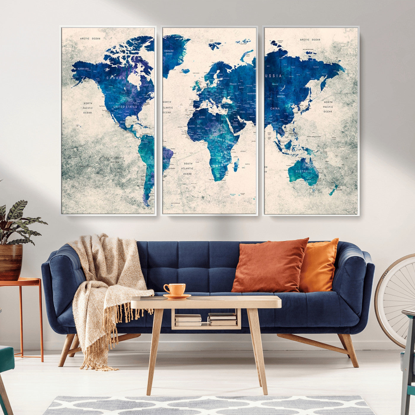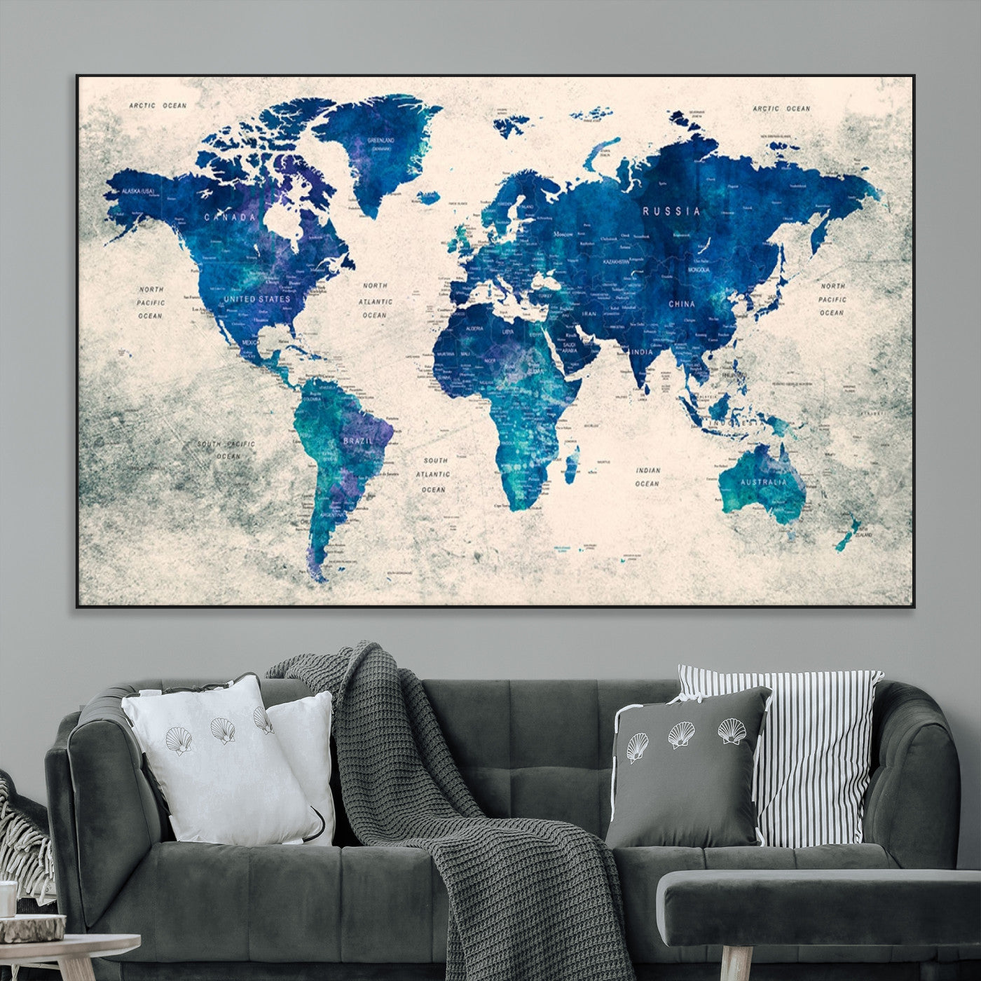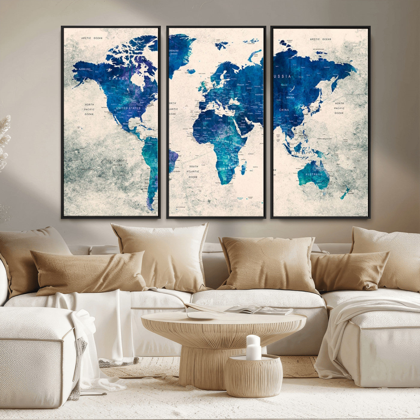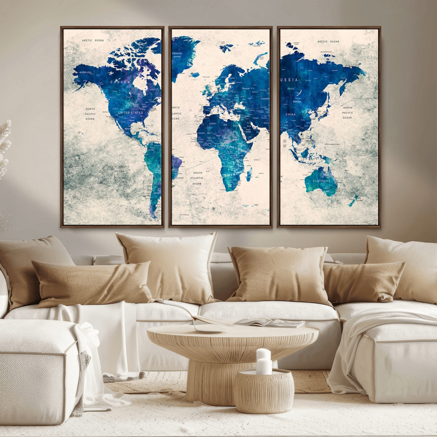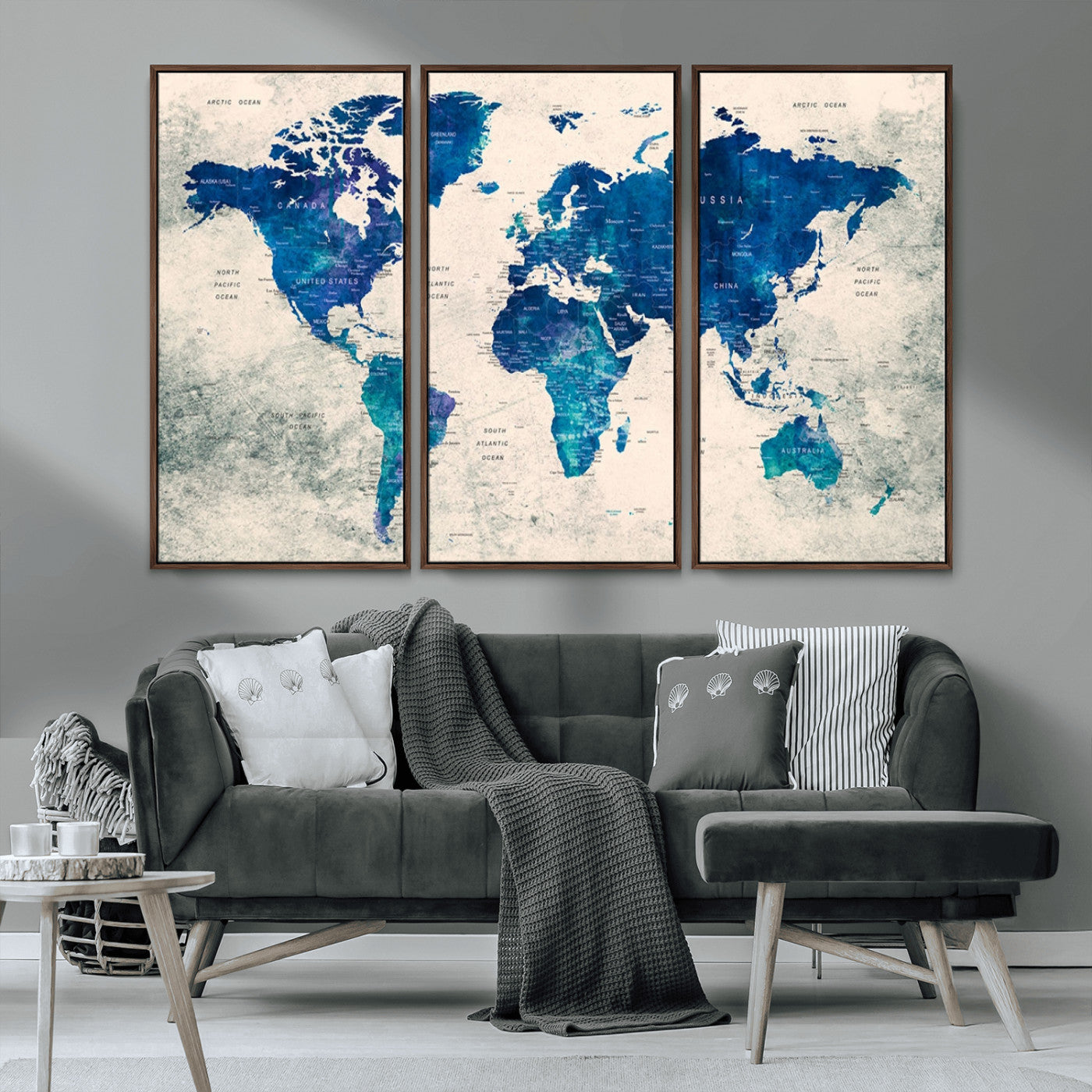Blue Watercolor World Map Canvas Print – Framed Modern Wall Art, Elegant Push Pin Travel Map Decor for Home Office or Living Room