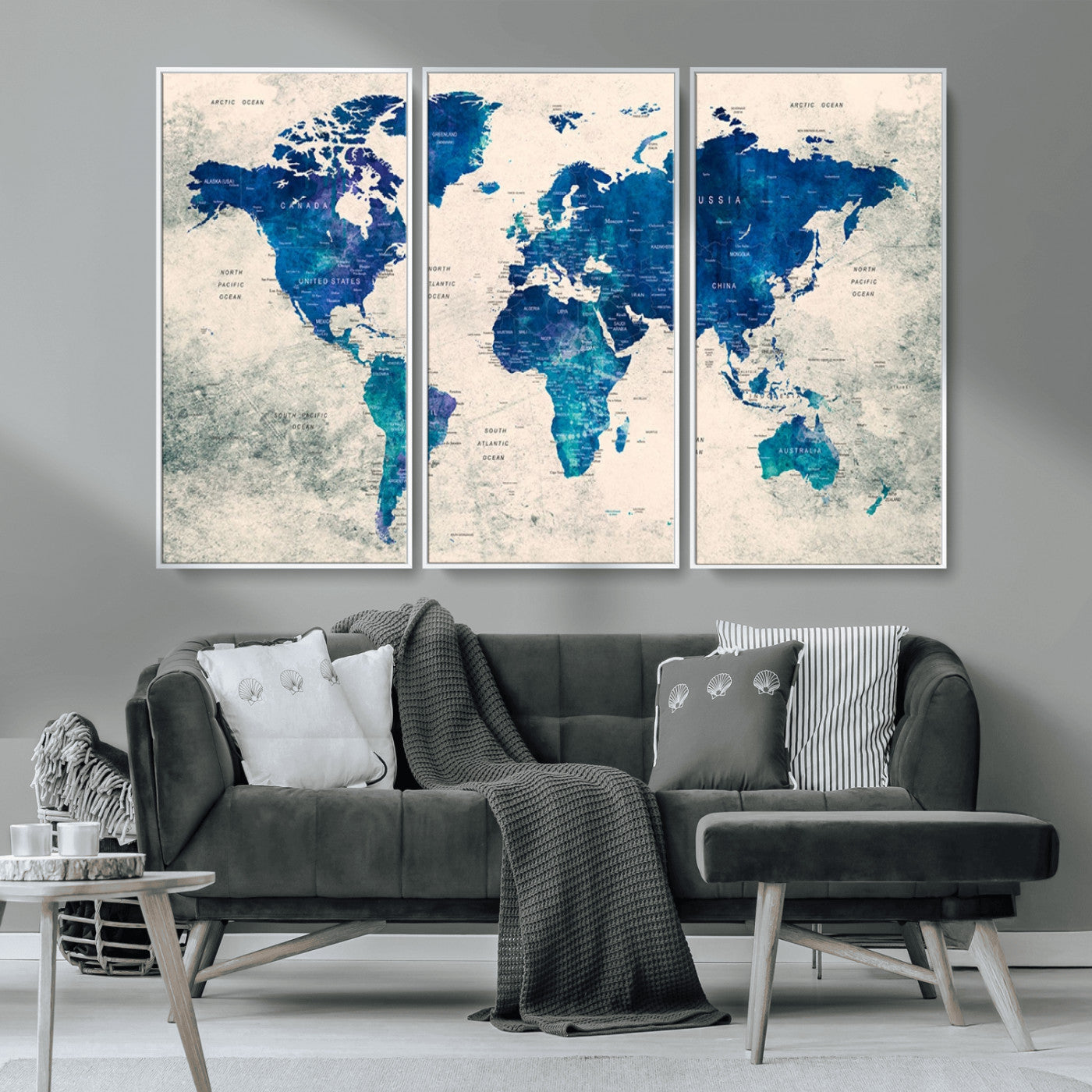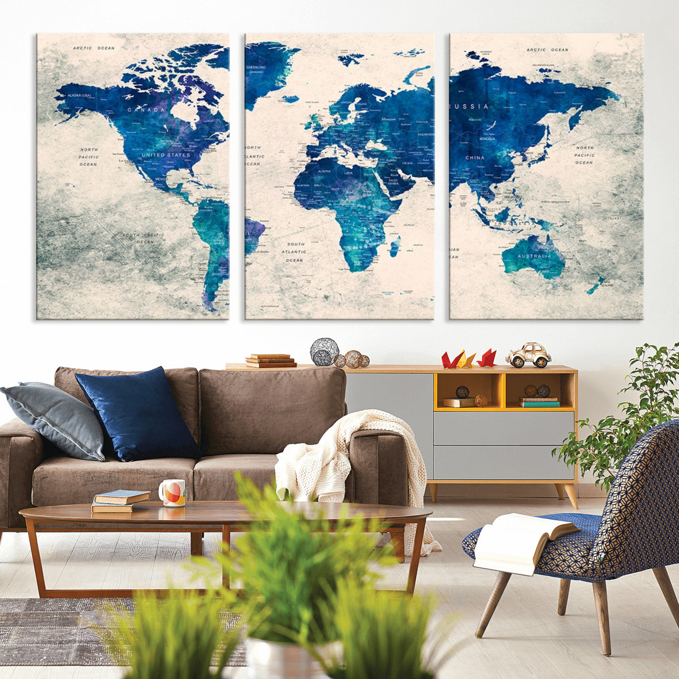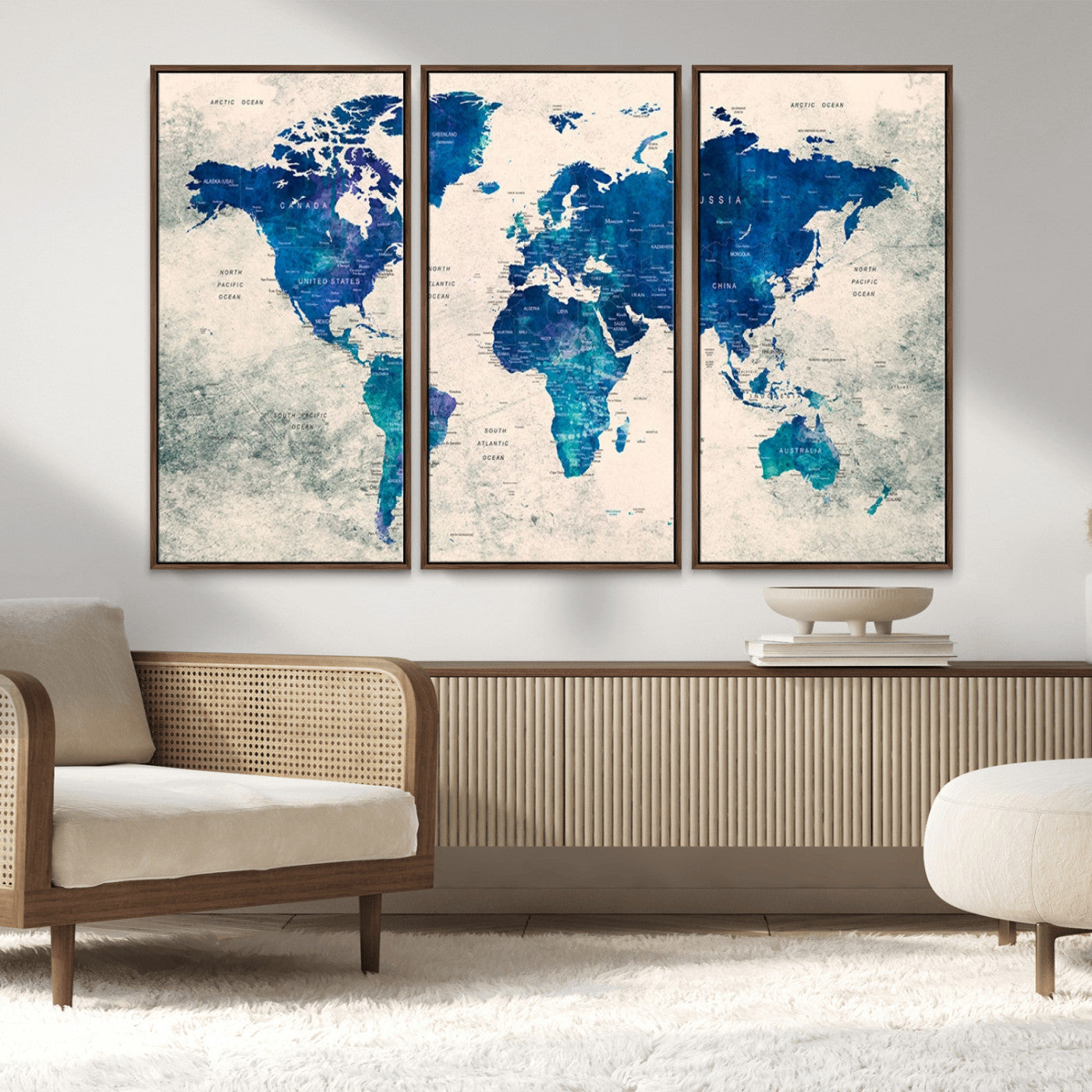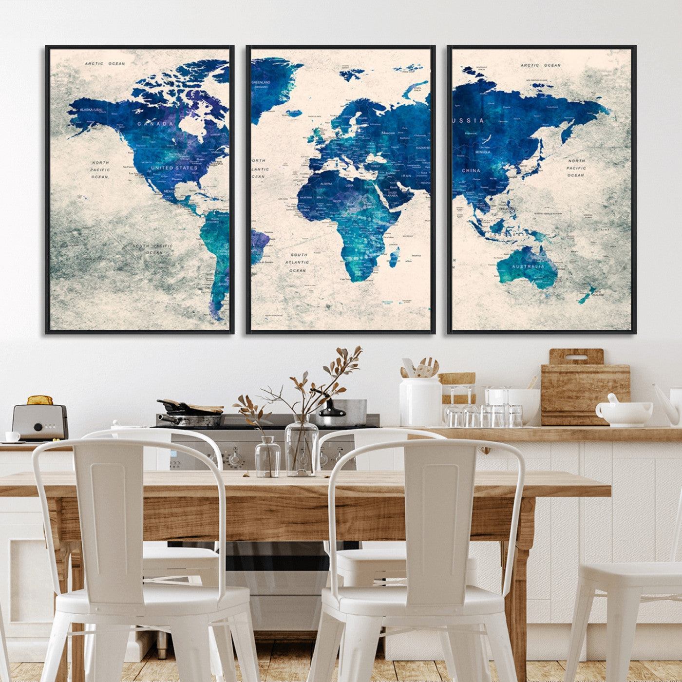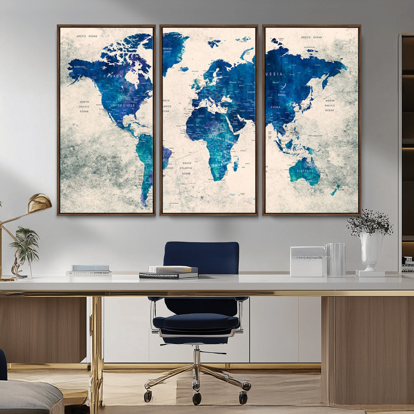Blue Watercolor World Map Canvas Print – Framed Modern Wall Art, Elegant Push Pin Travel Map Decor for Home Office or Living Room