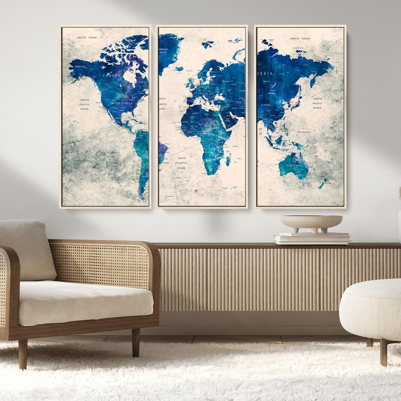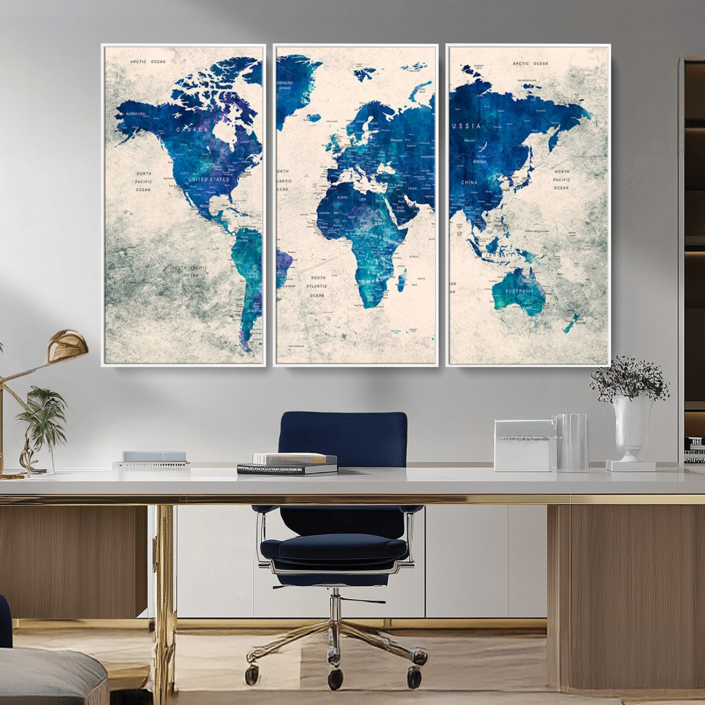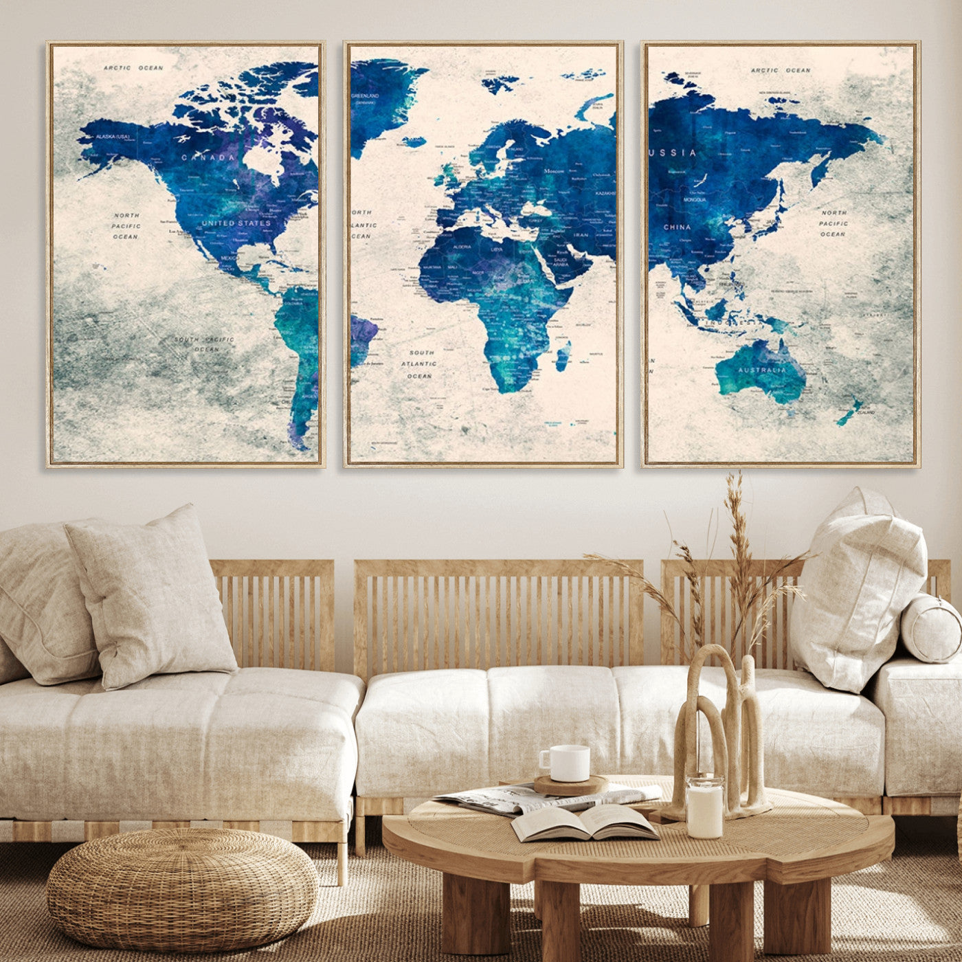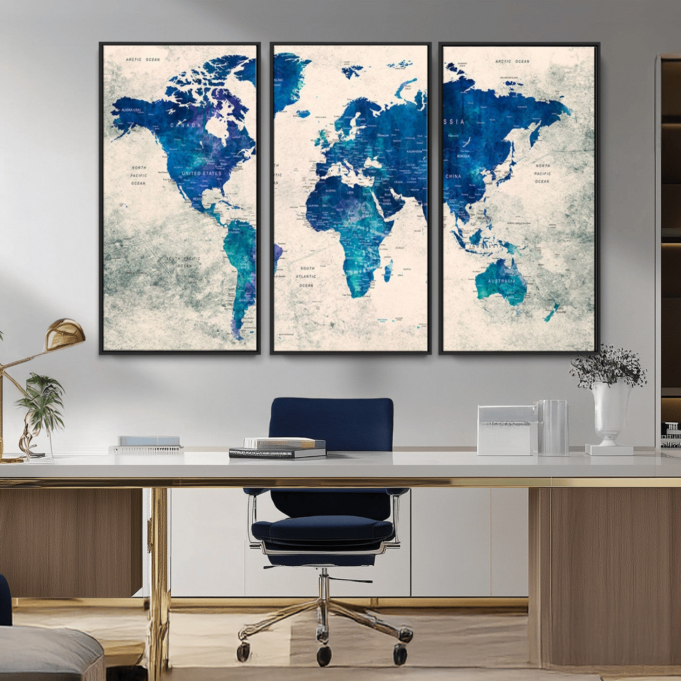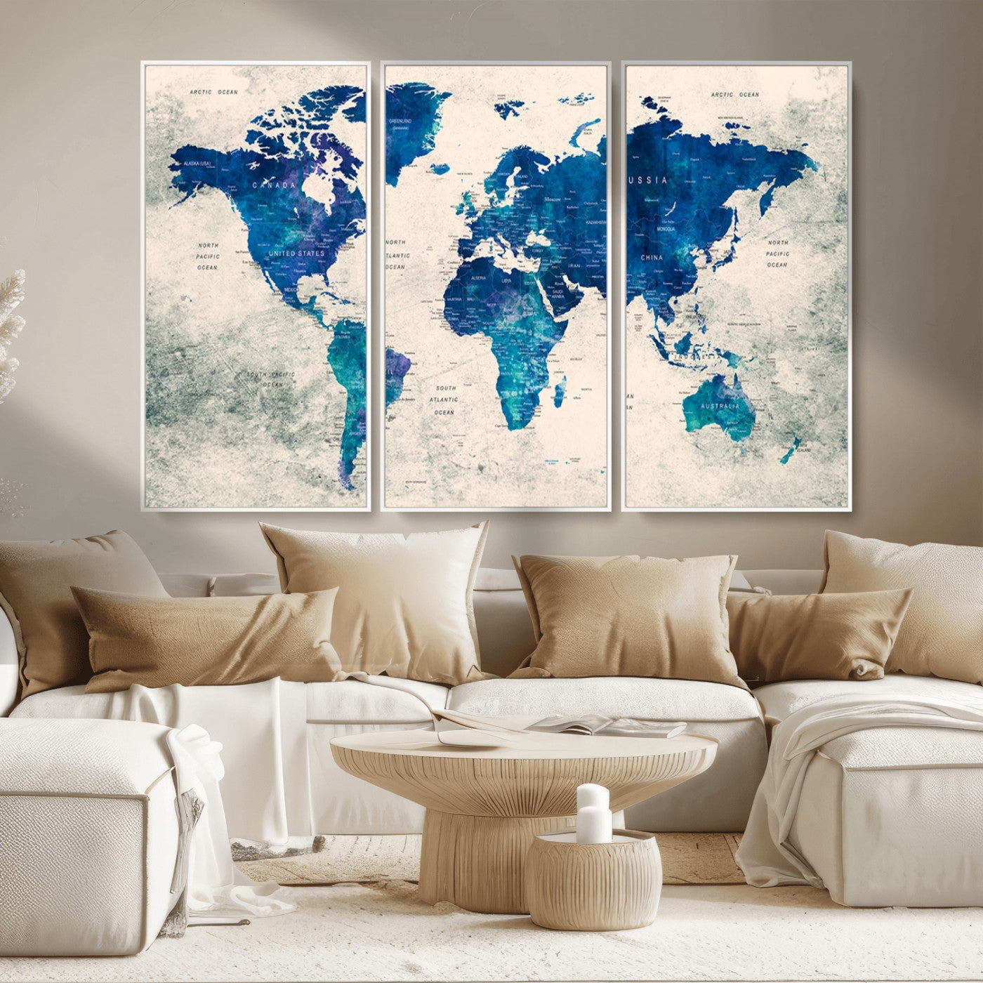 Blue Watercolor World Map Canvas Print – Framed Modern Wall Art, Elegant Push Pin Travel Map Decor for Home Office or Living Room