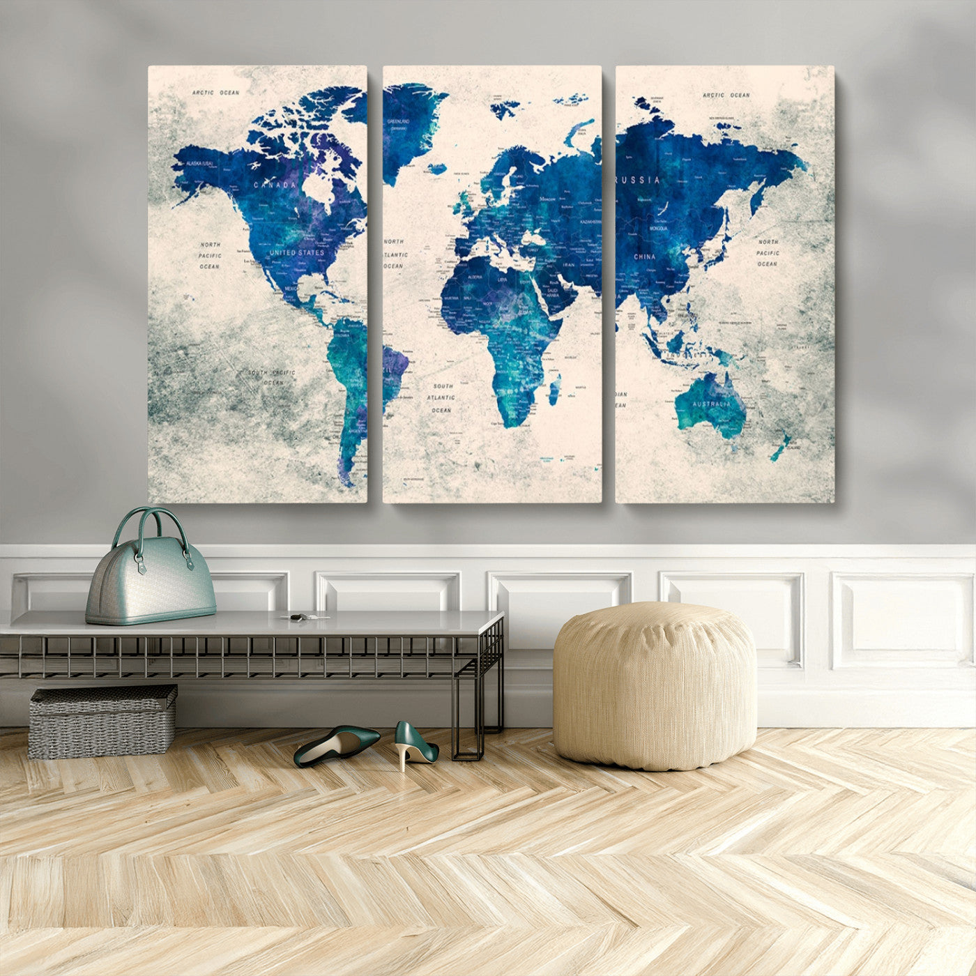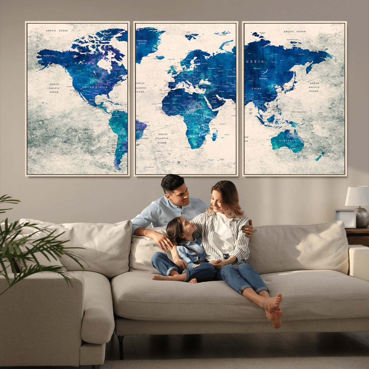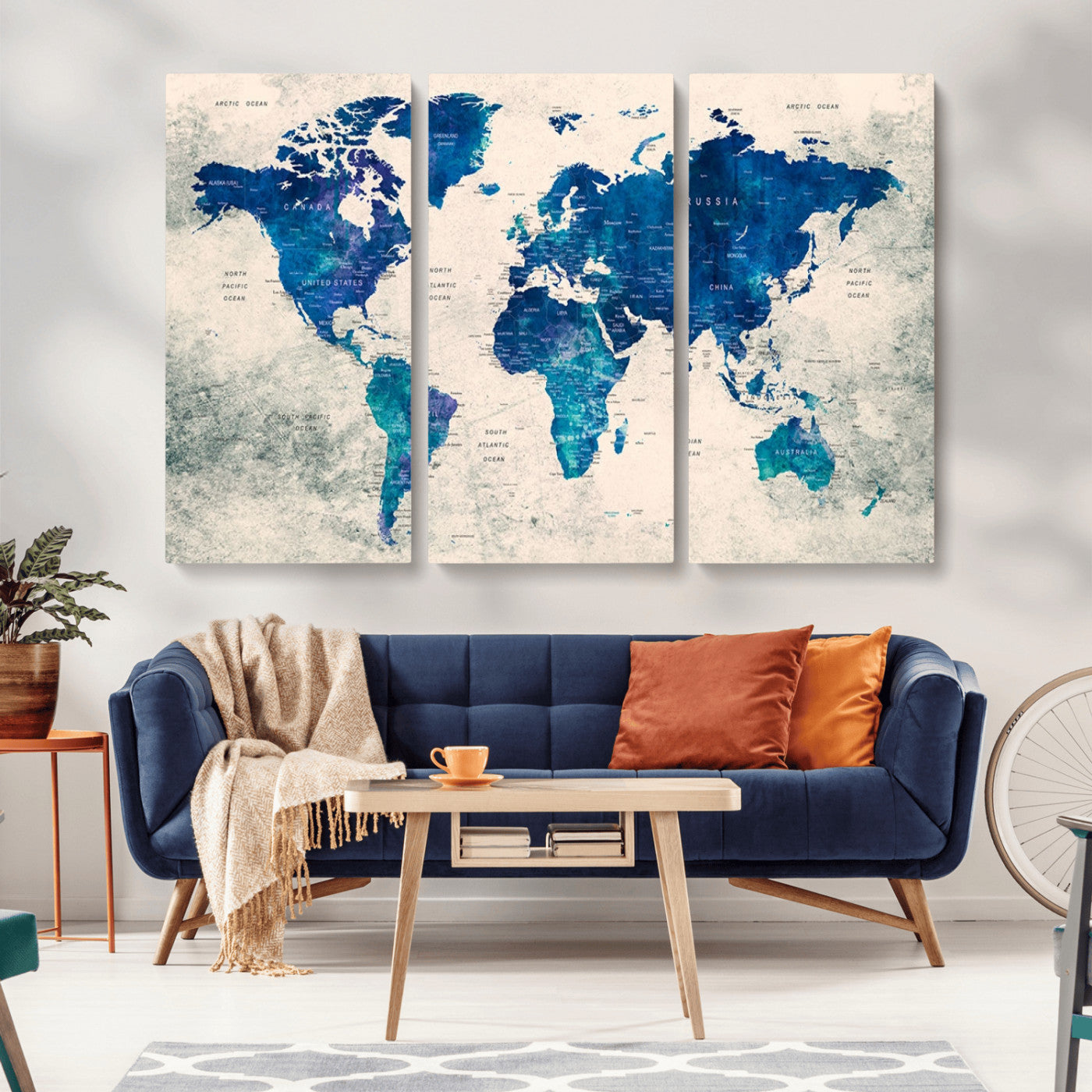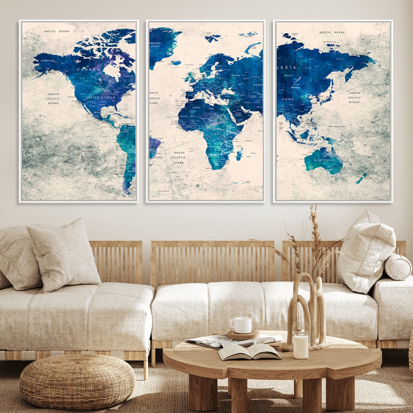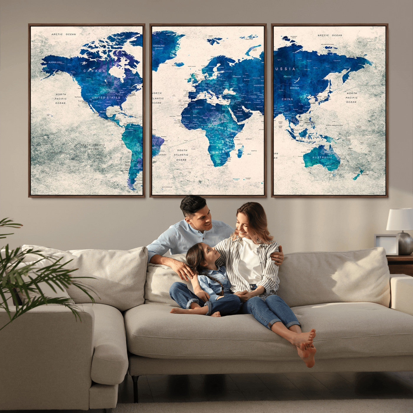 Blue Watercolor World Map Canvas Print – Framed Modern Wall Art, Elegant Push Pin Travel Map Decor for Home Office or Living Room