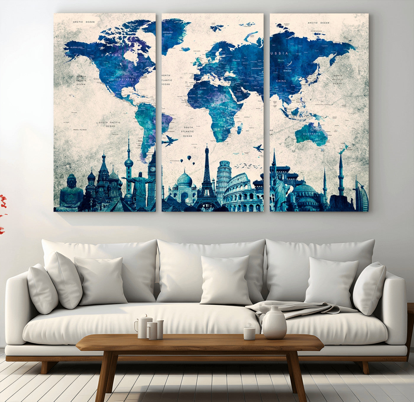 Navy Blue World Map Canvas Print – Framed Push Pin Travel Map Wall Art, Elegant Adventure Decor for Home or Office