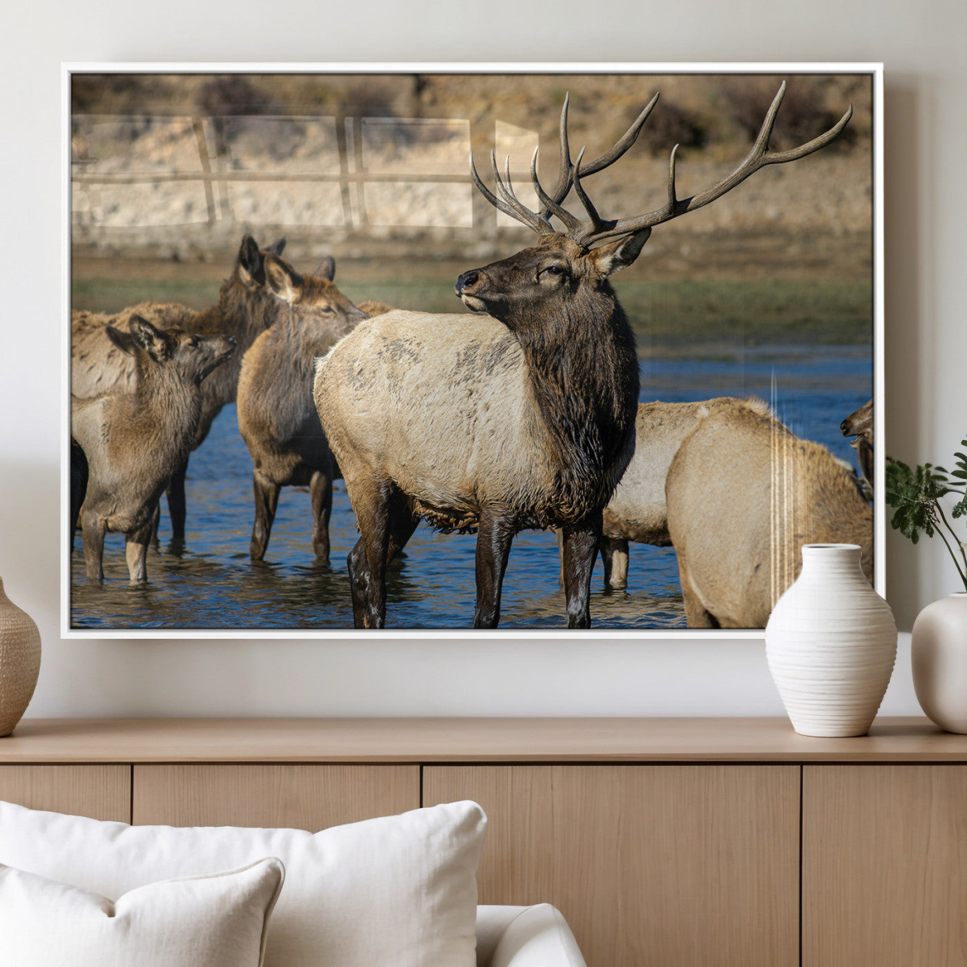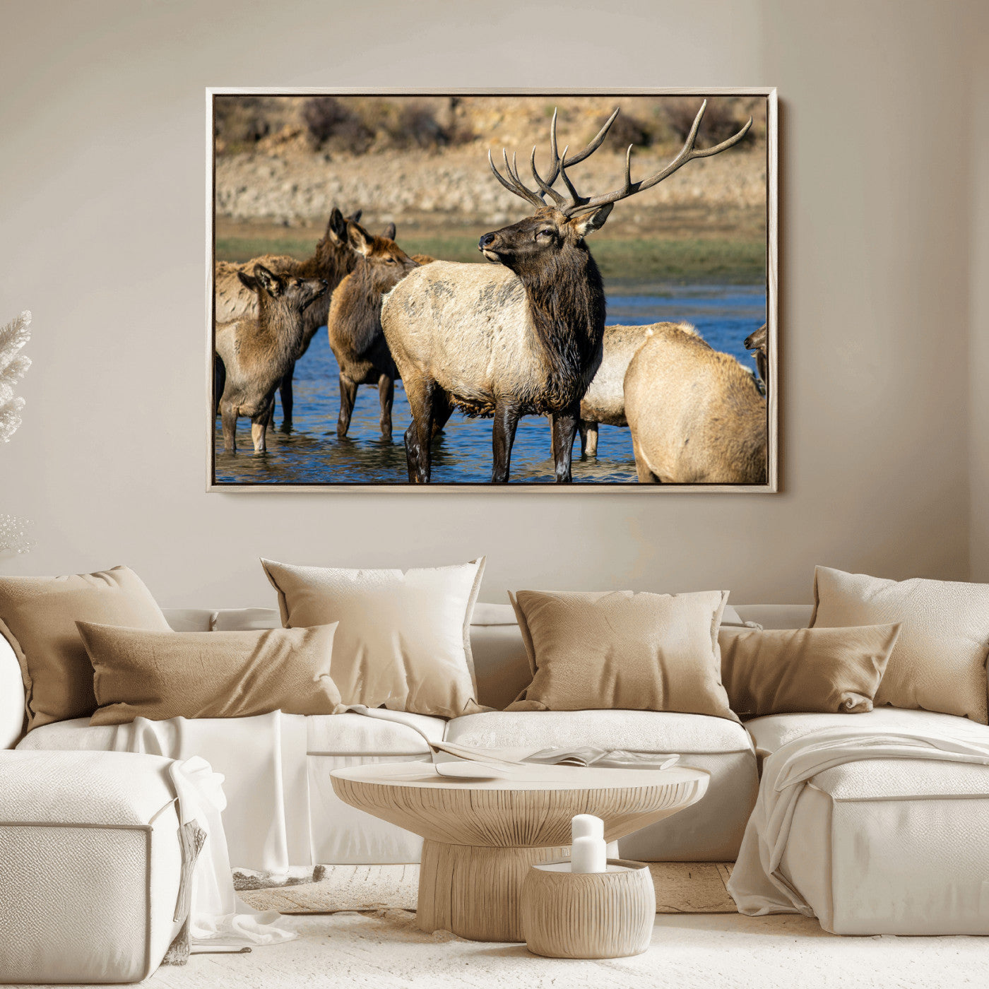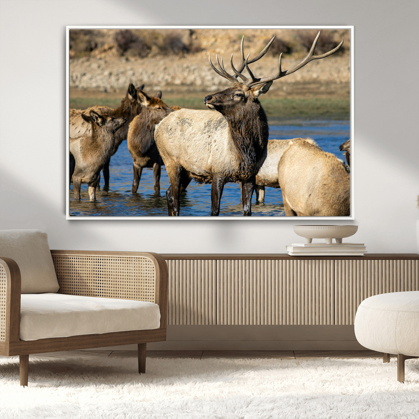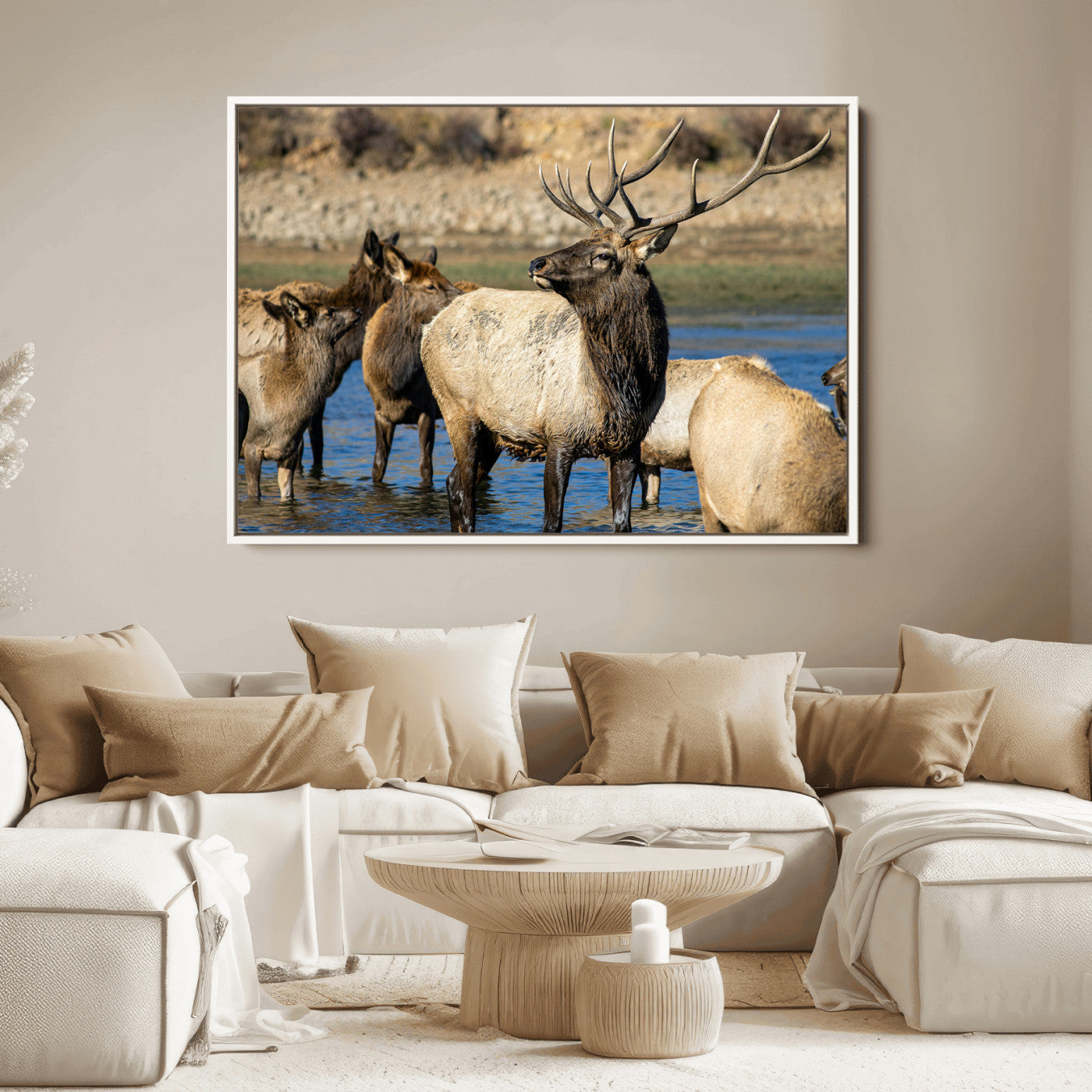 Wild Elk Wall Art Canvas Print – Framed Neutral Wildlife Rustic Scene Artwork for Home, Office, Living Room