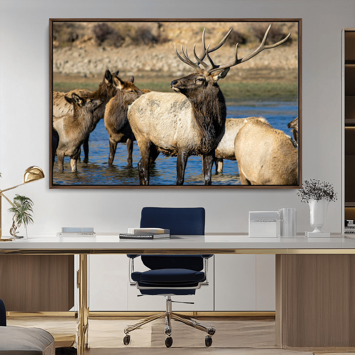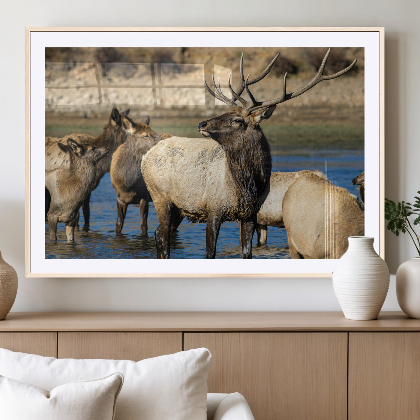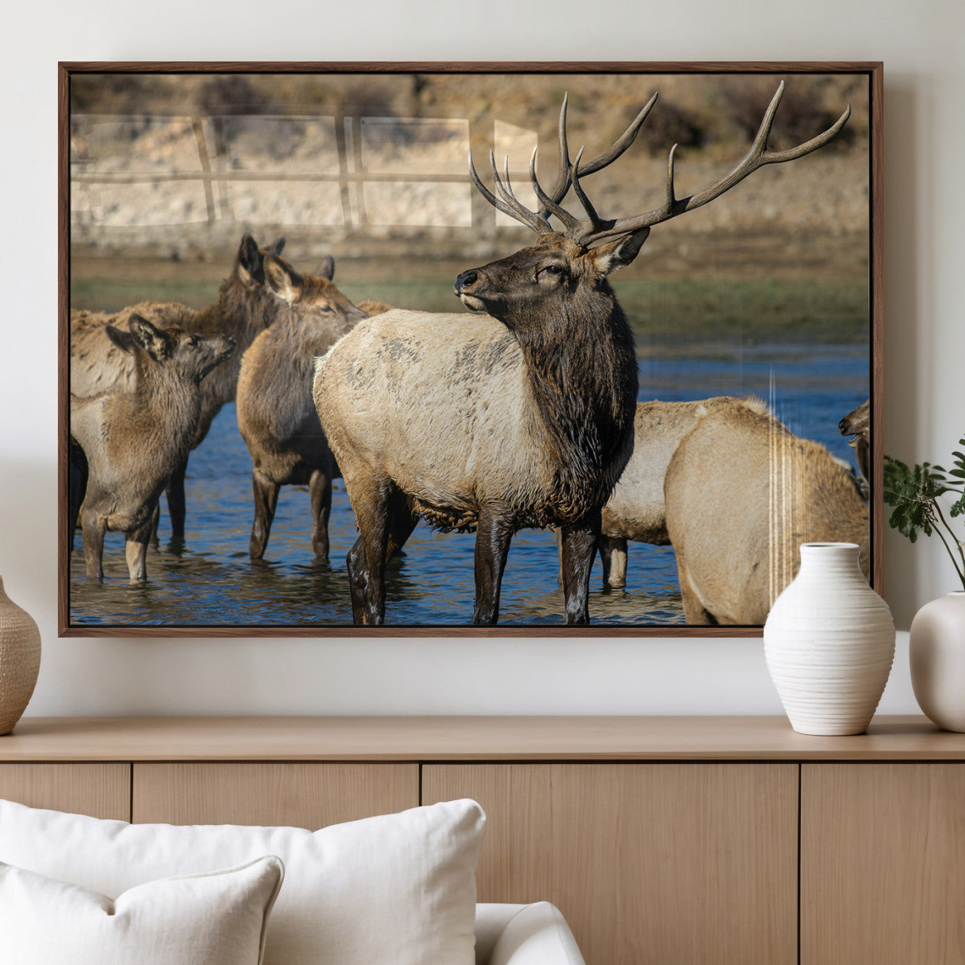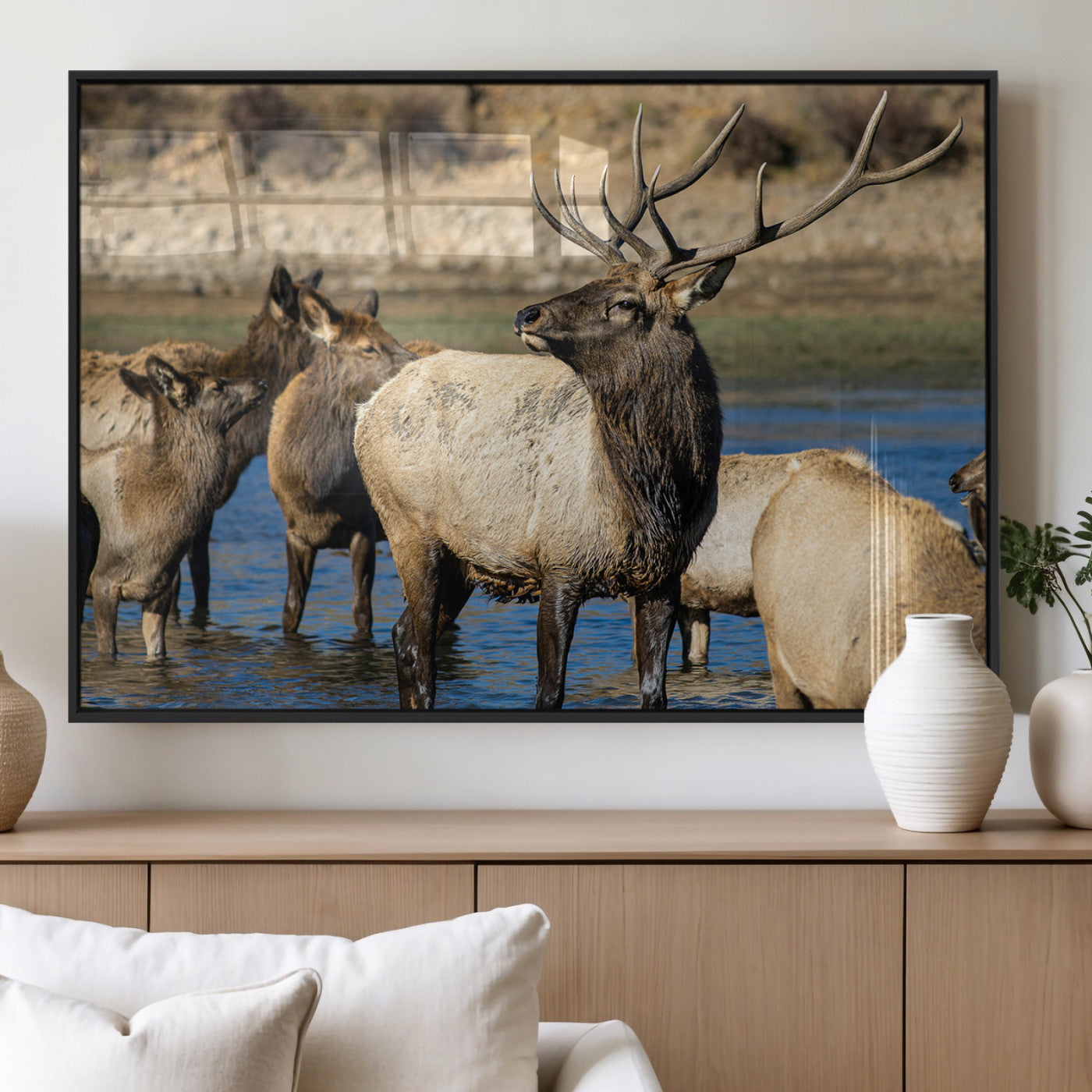 Wild Elk Wall Art Canvas Print – Framed Neutral Wildlife Rustic Scene Artwork for Home, Office, Living Room