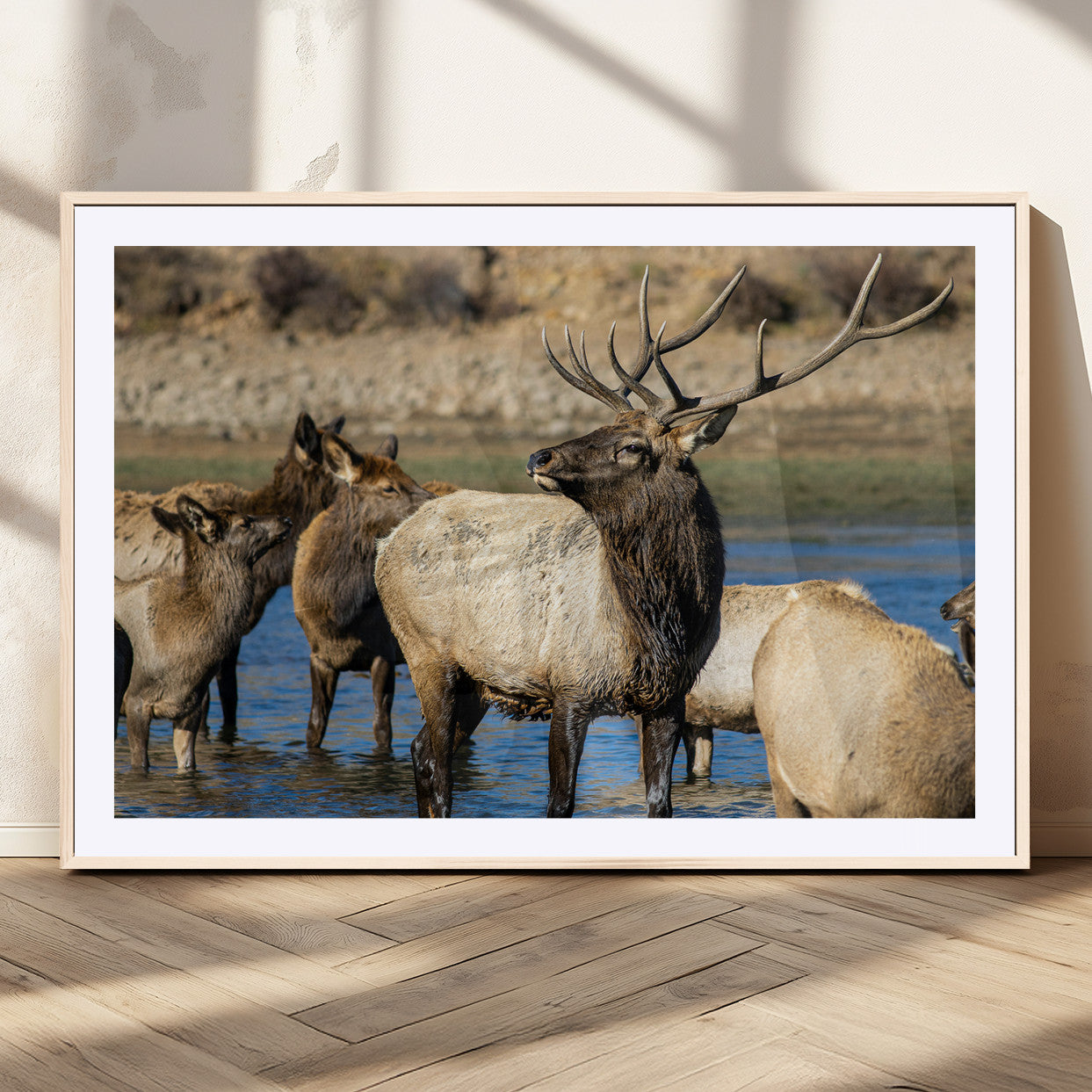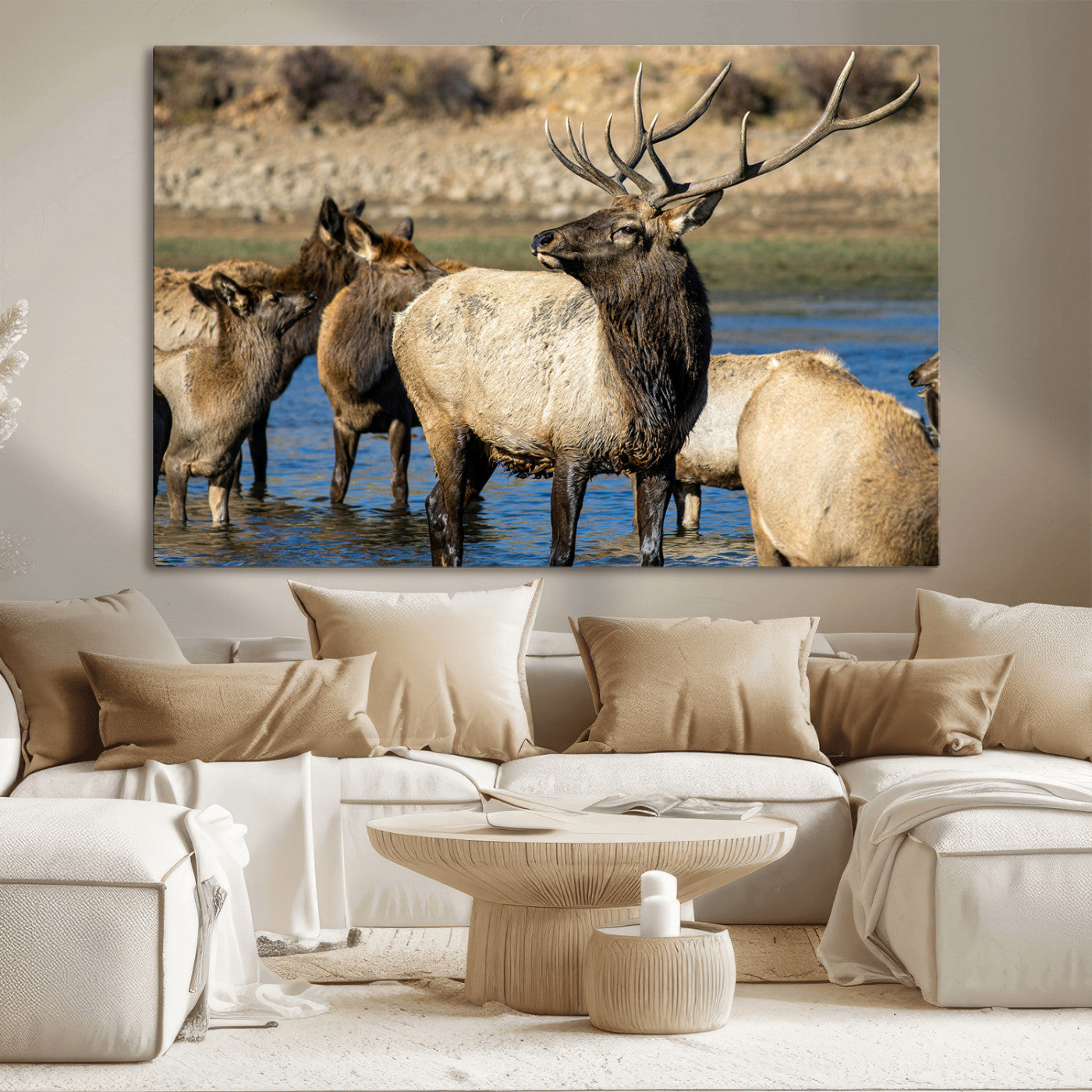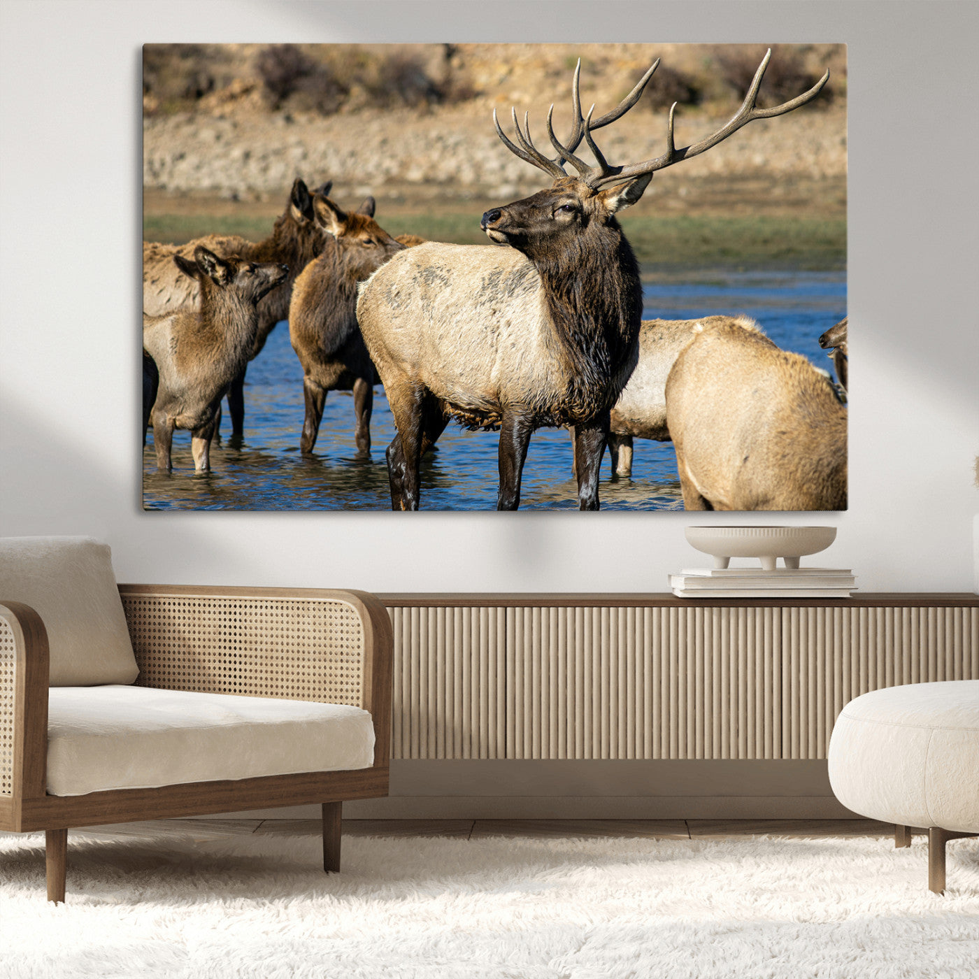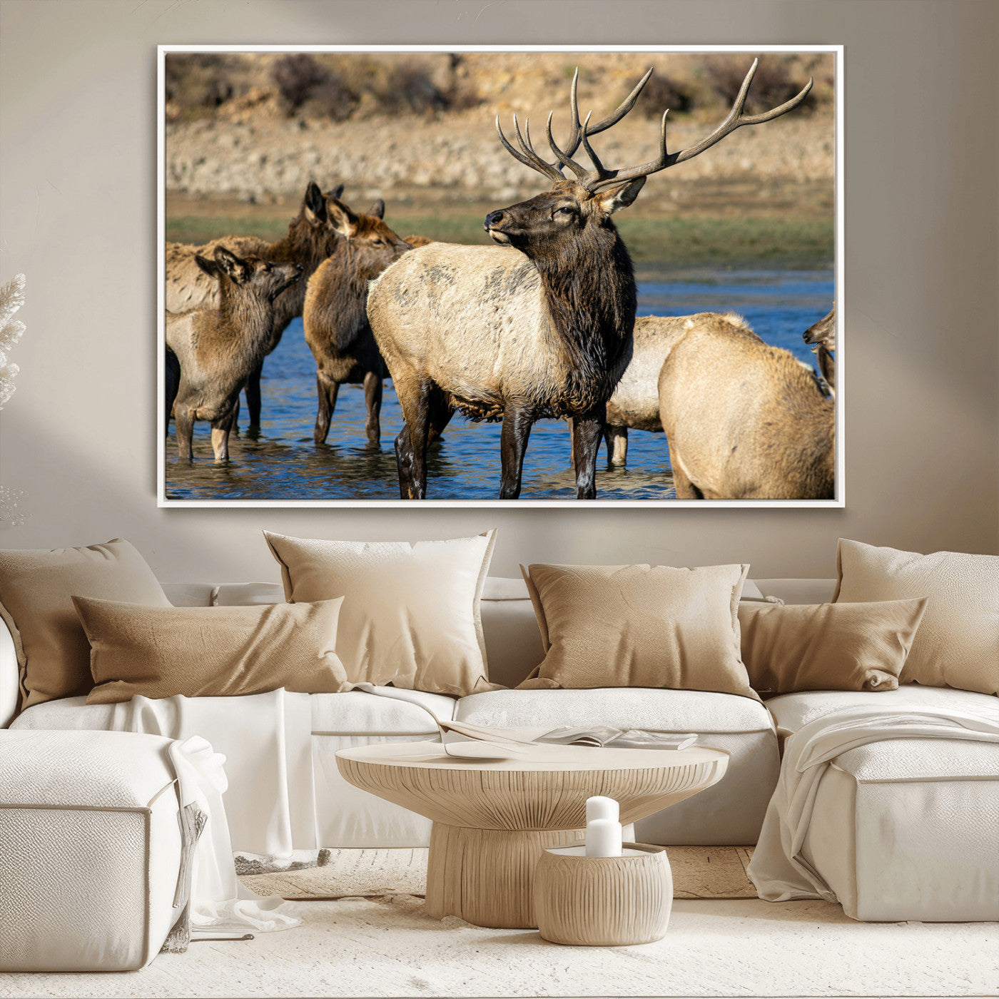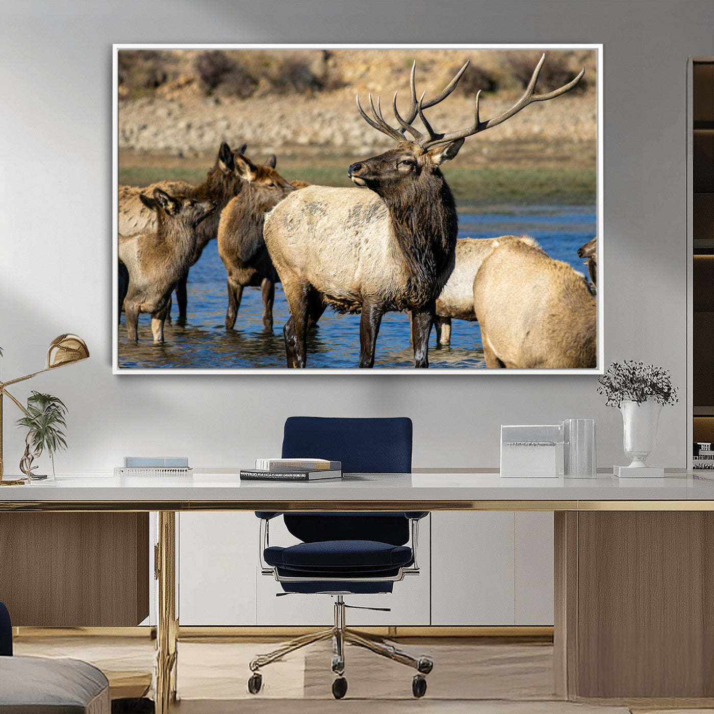 Wild Elk Wall Art Canvas Print – Framed Neutral Wildlife Rustic Scene Artwork for Home, Office, Living Room