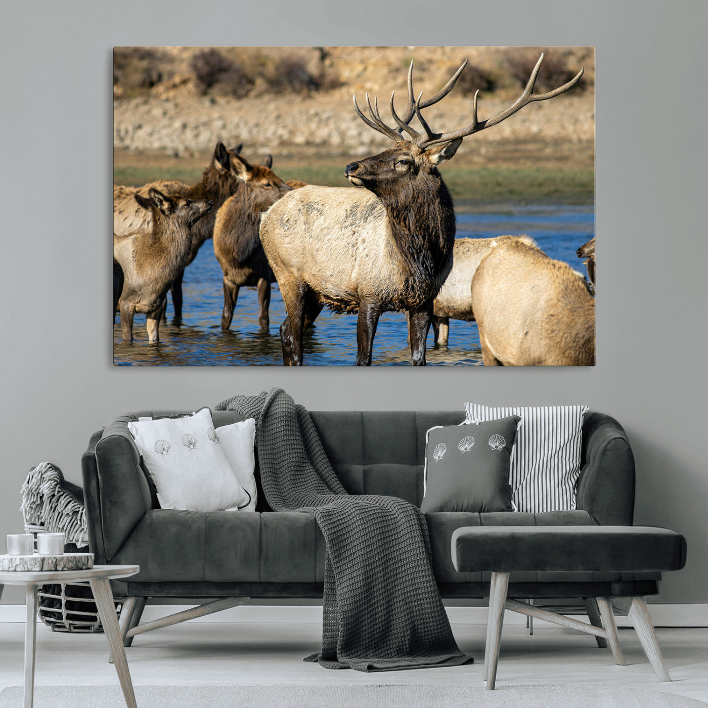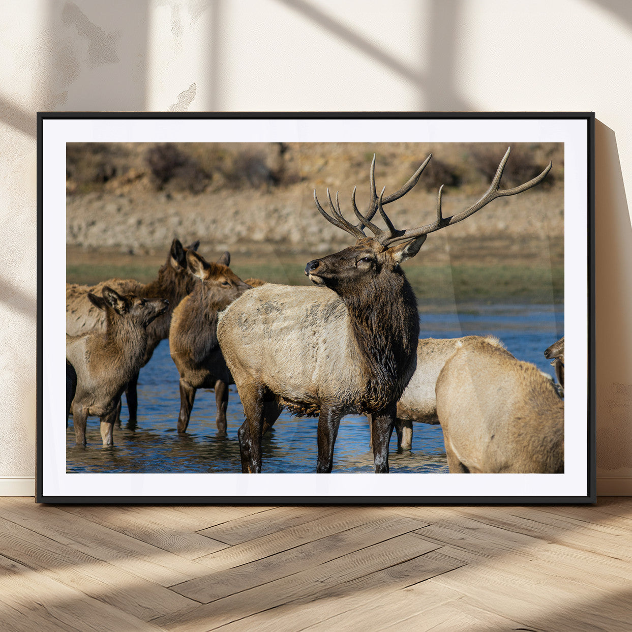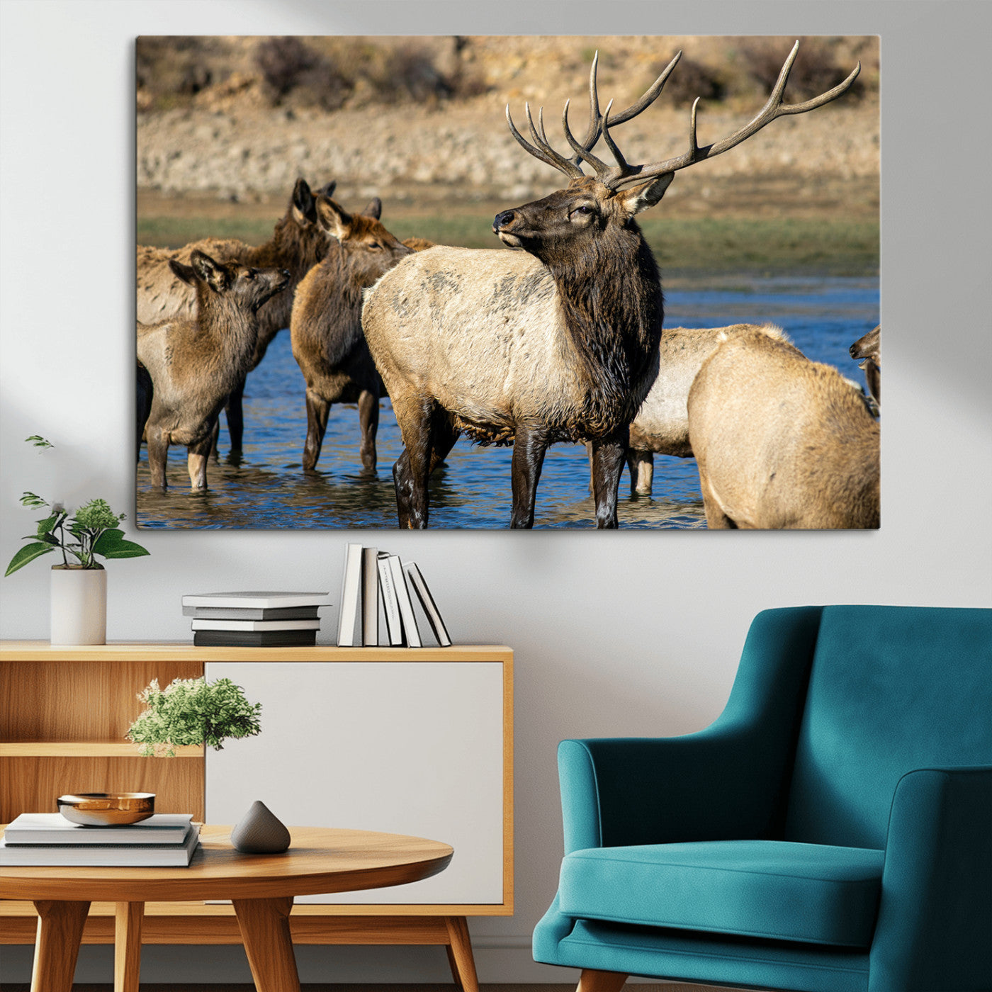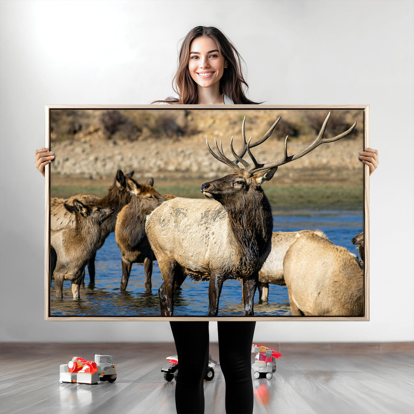 Wild Elk Wall Art Canvas Print – Framed Neutral Wildlife Rustic Scene Artwork for Home, Office, Living Room