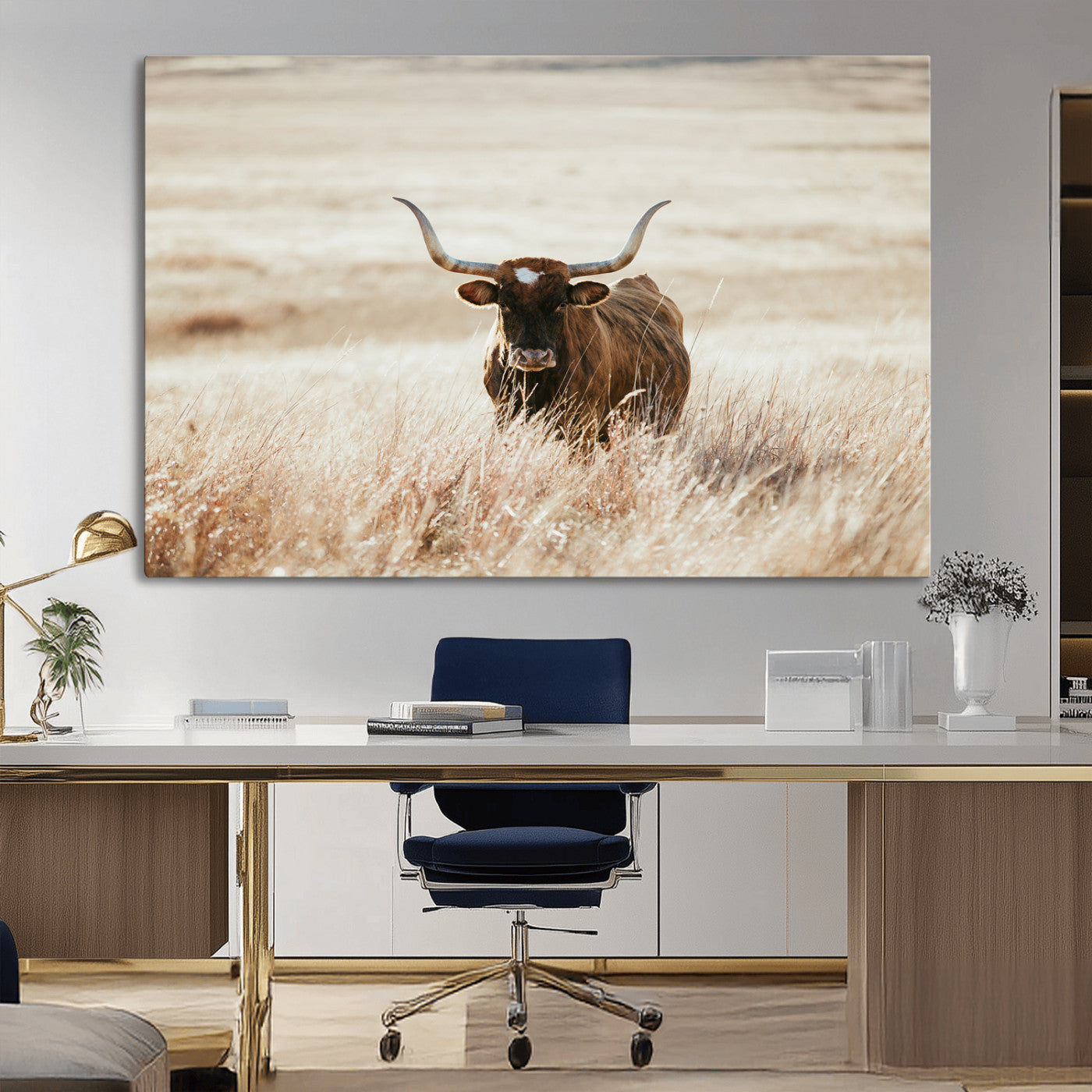 Texas Longhorn Wall Art Canvas Print – Framed Brown Horned Bull Rustic Western Cattle Artwork for Home, Office
