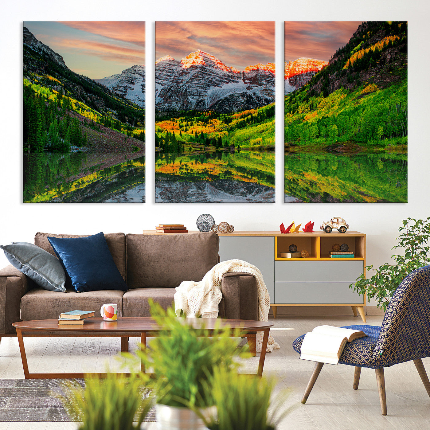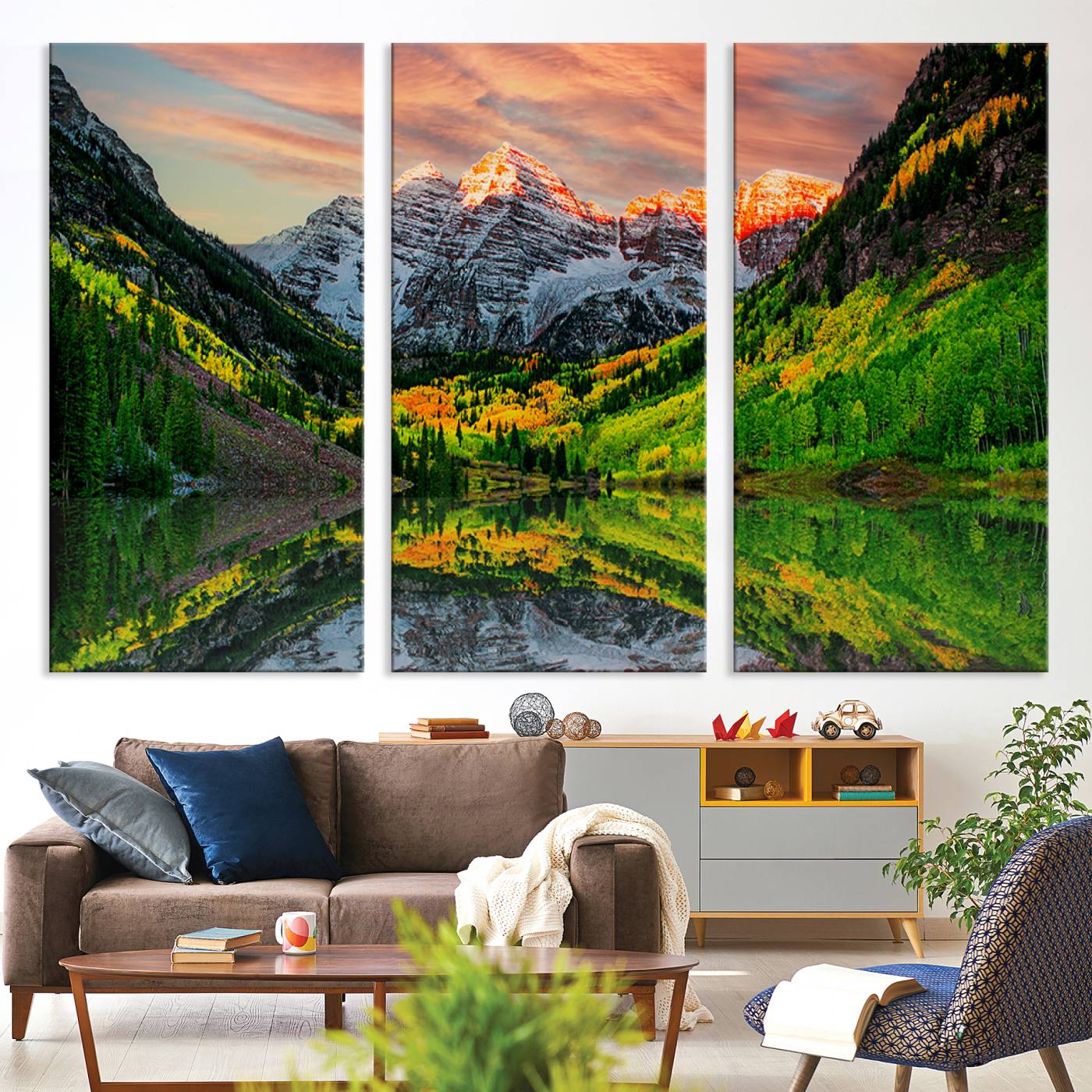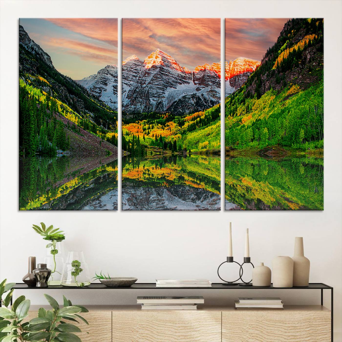Wall Art Canvas Print – Sunset Glow Mountain Peaks Vibrant Green Forest Reflective Lake Calm Waters for Home, Office