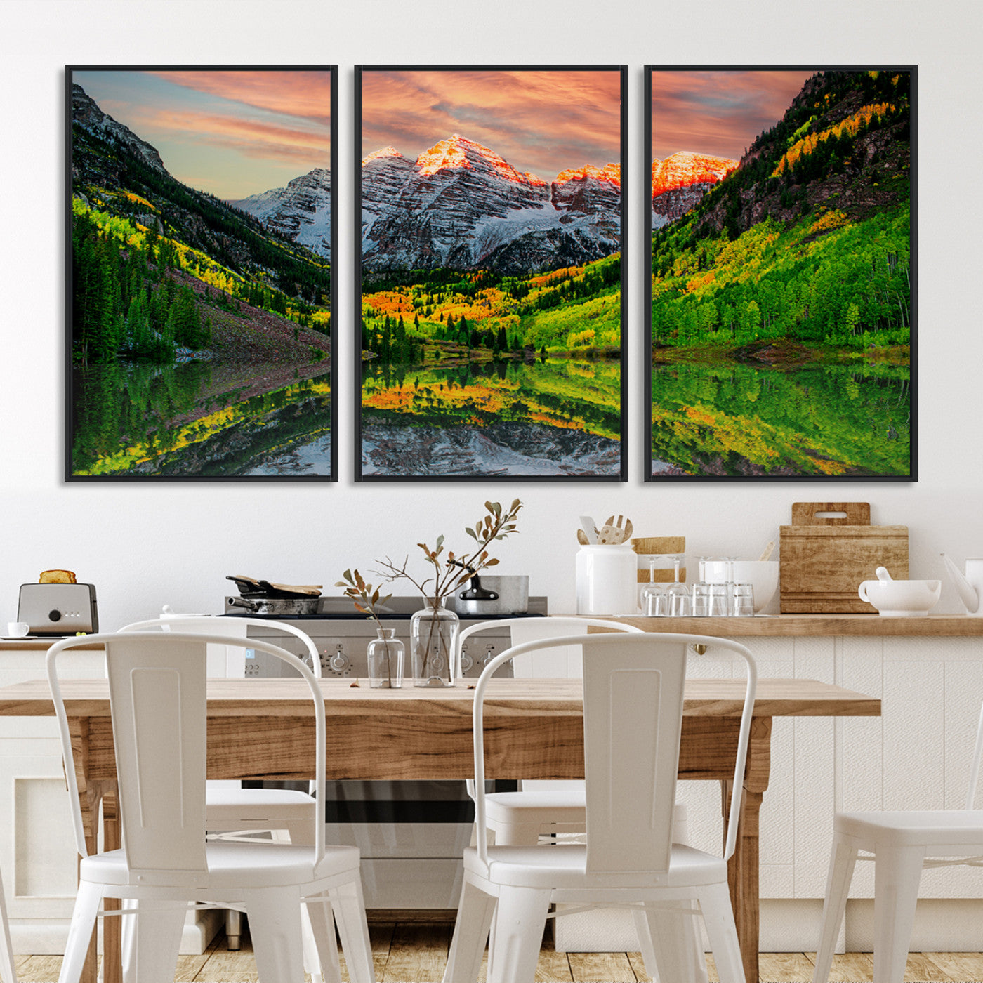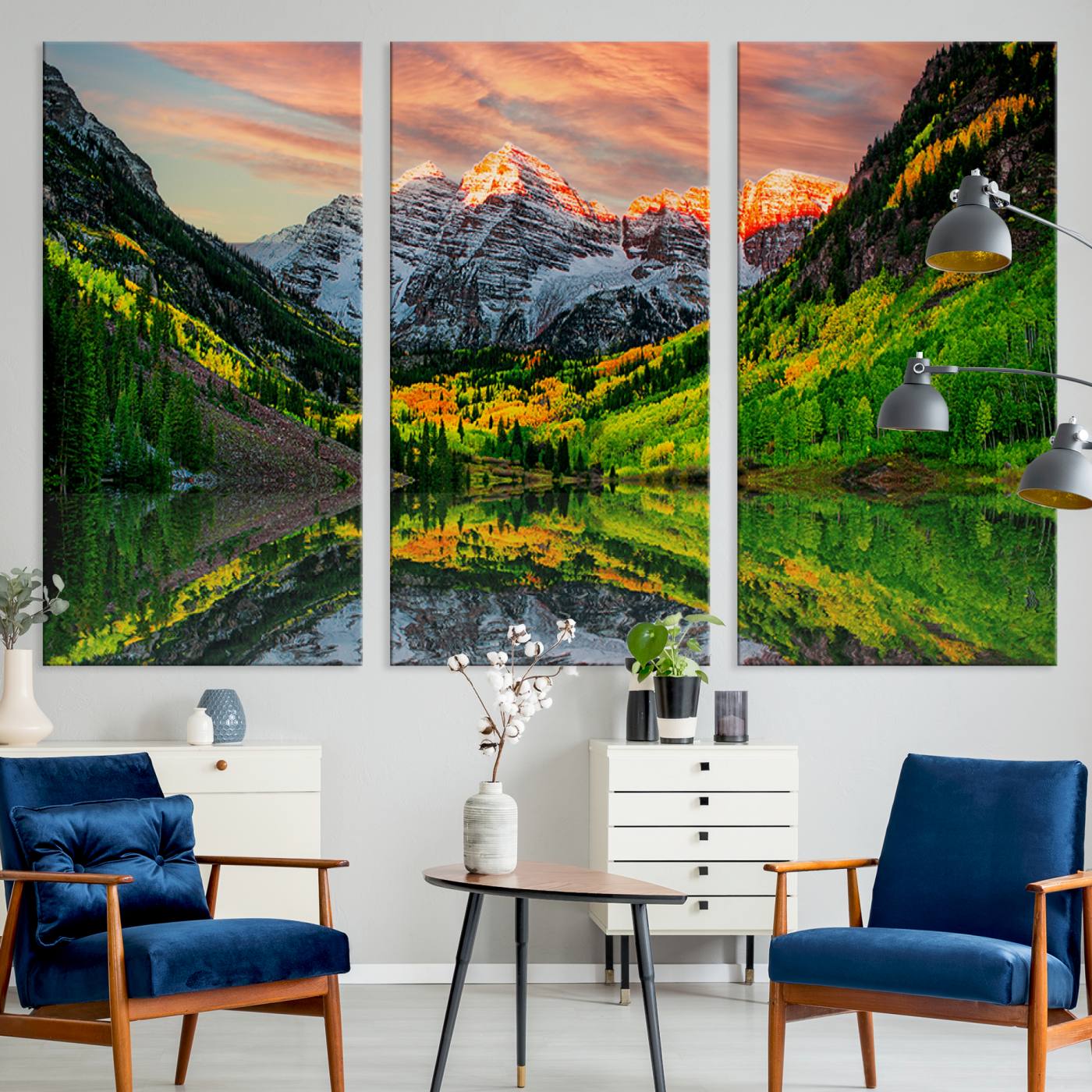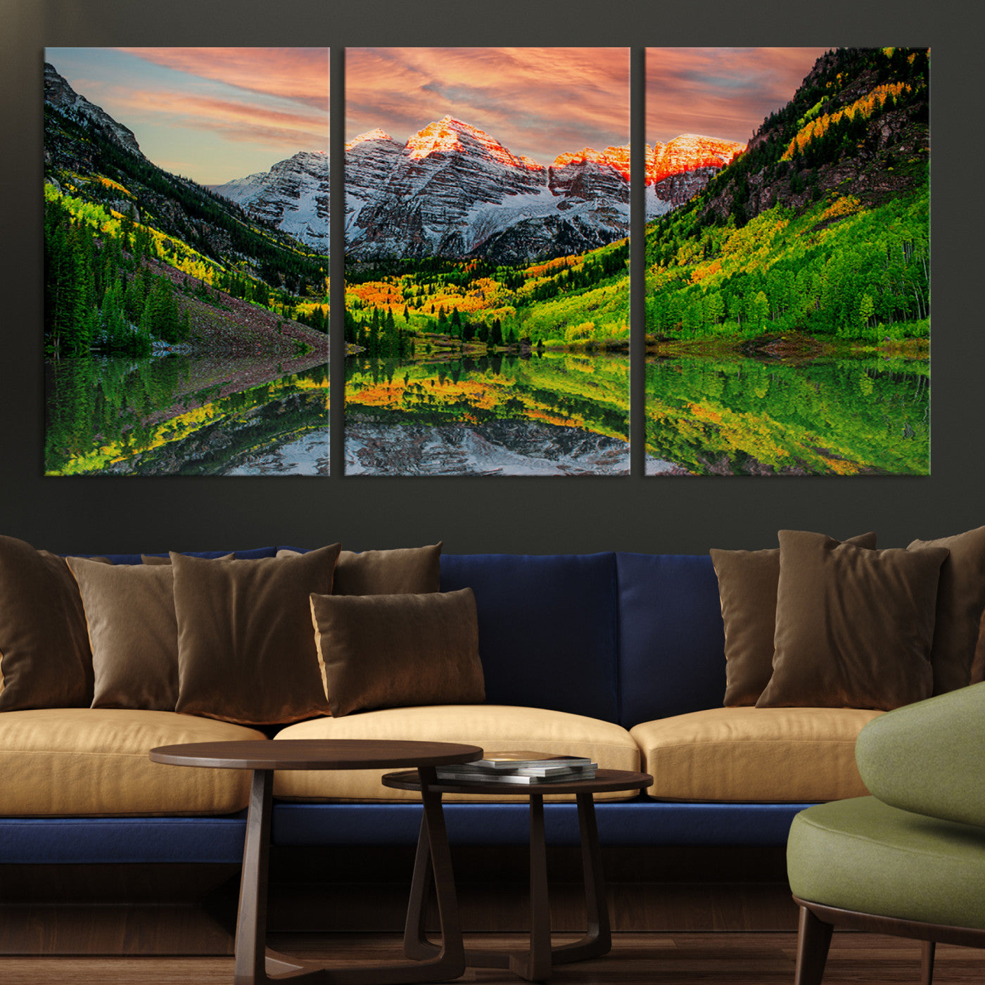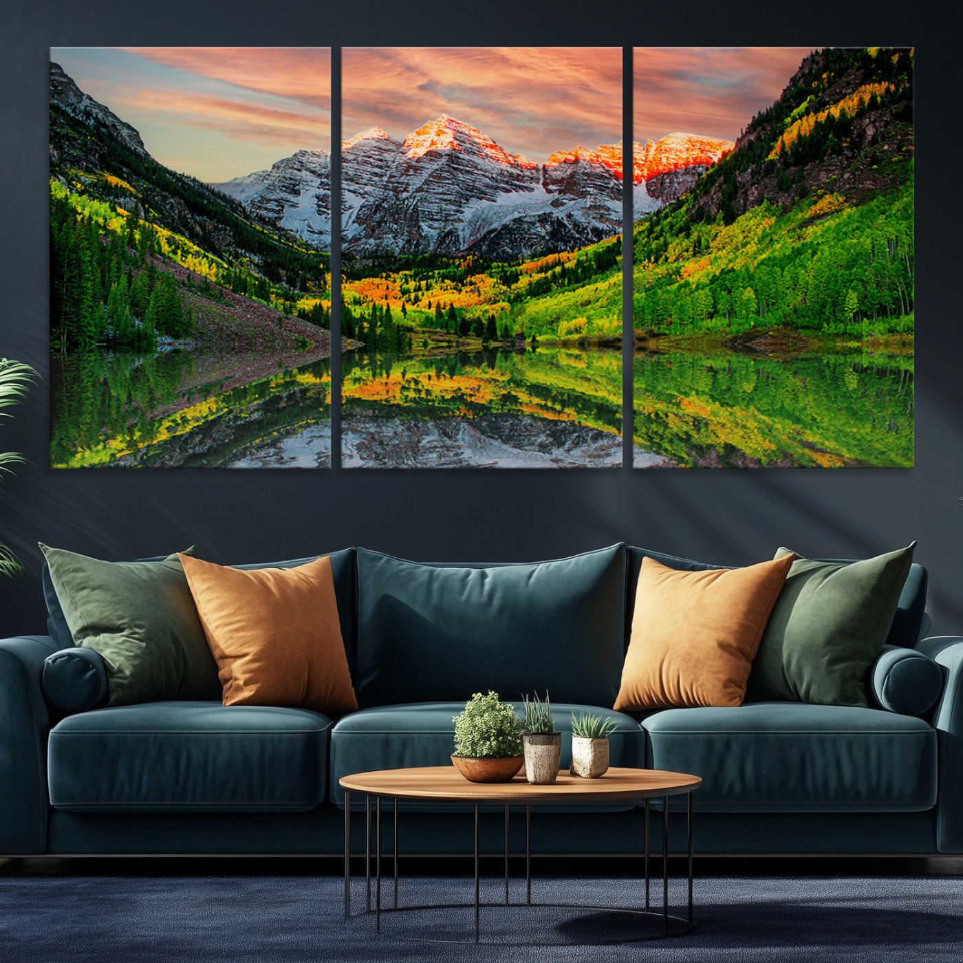 Wall Art Canvas Print – Sunset Glow Mountain Peaks Vibrant Green Forest Reflective Lake Calm Waters for Home, Office