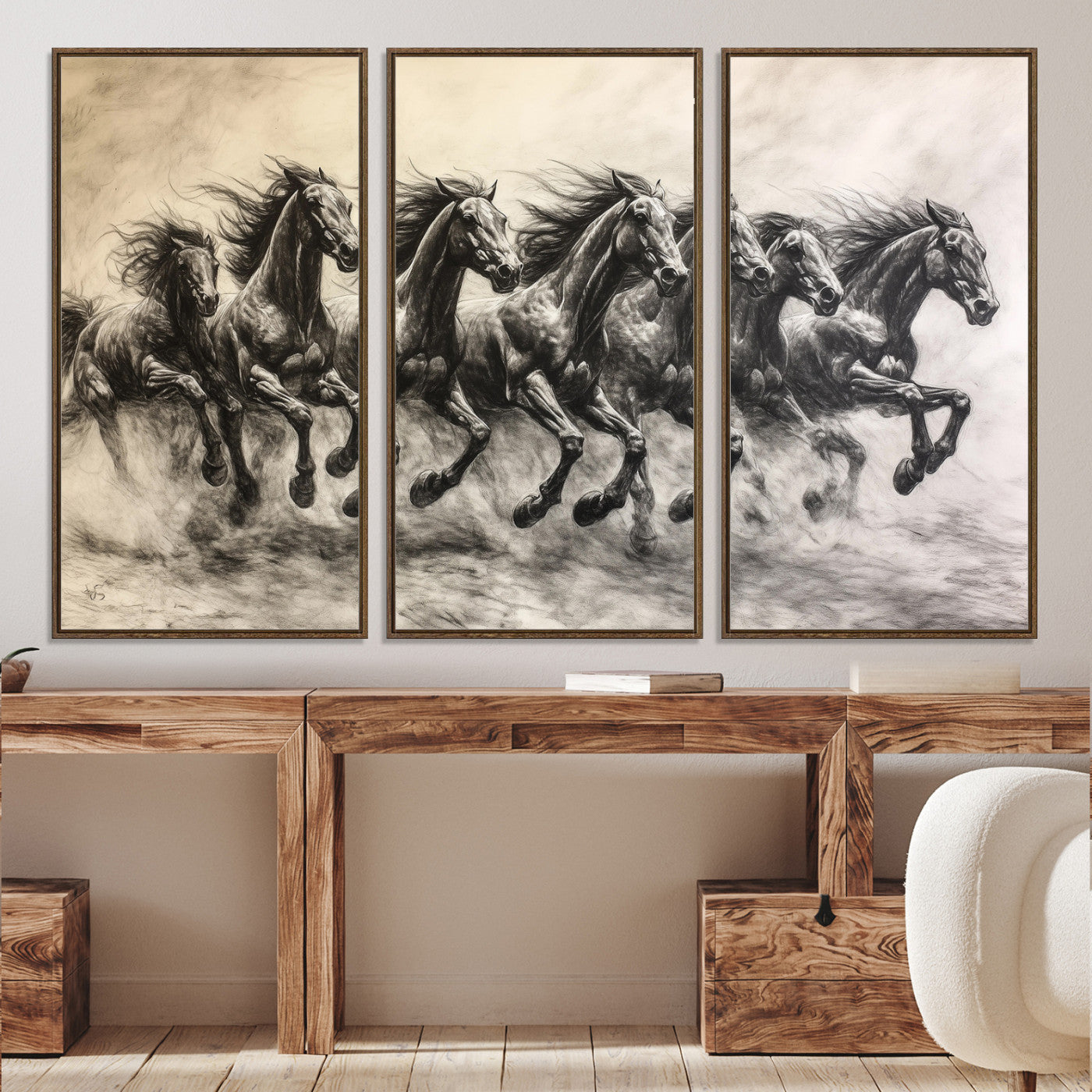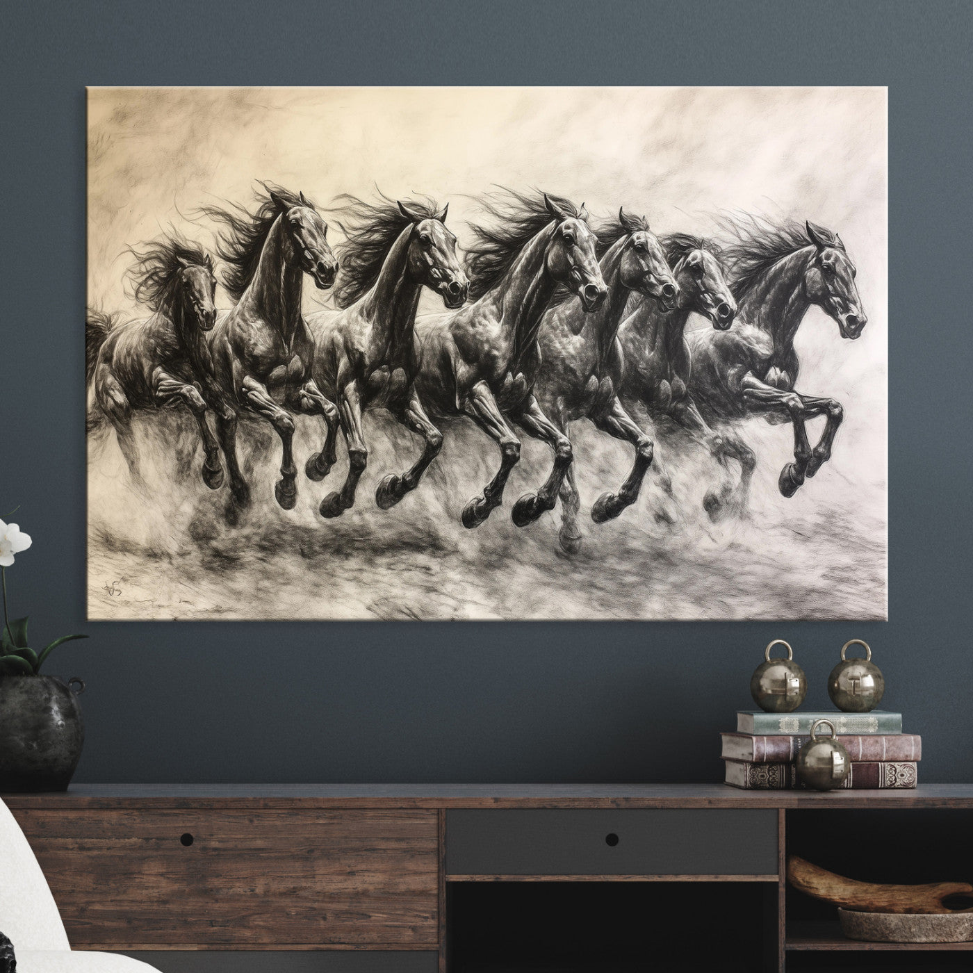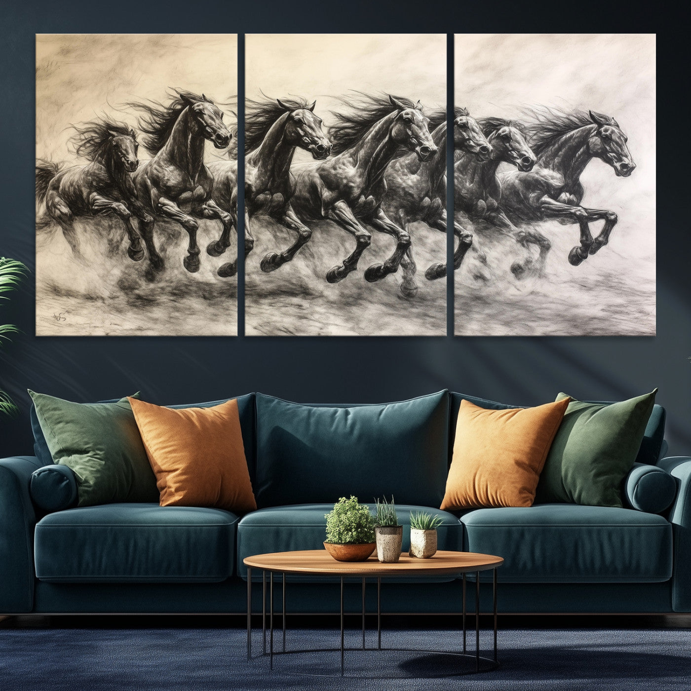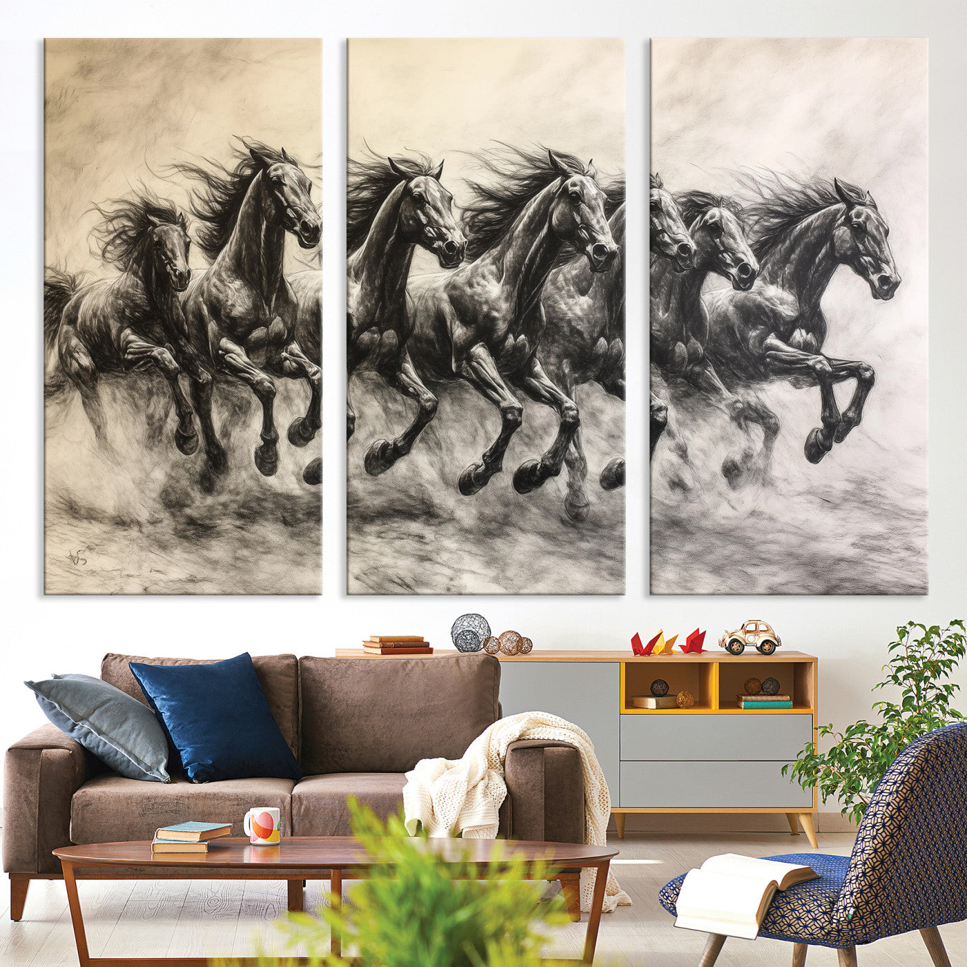 Galloping Horses Wall Art Canvas Print – Framed Wild Stallions Herd Sketch Dynamic Equestrian Artwork for Home Office