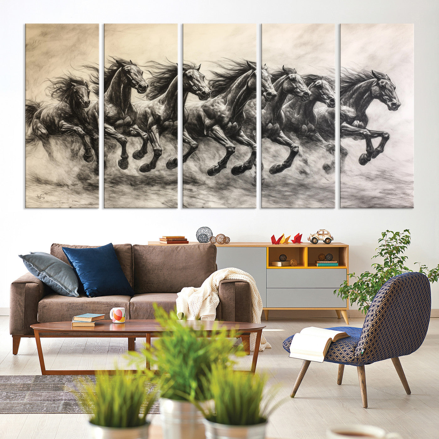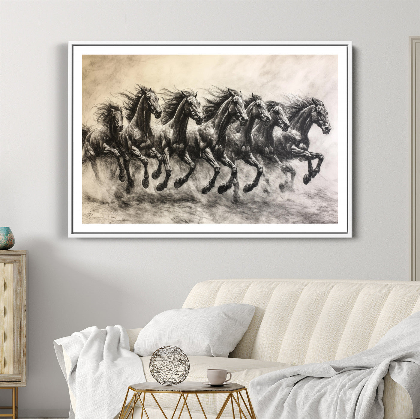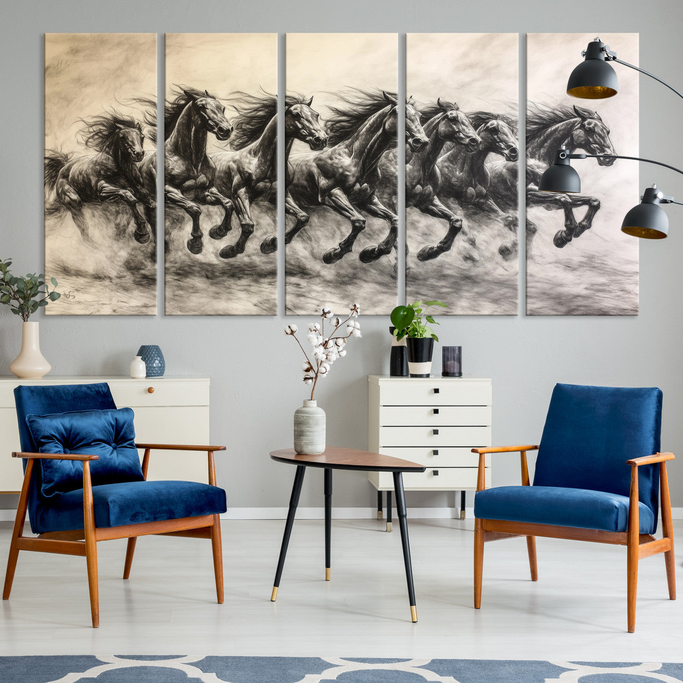 Galloping Horses Wall Art Canvas Print – Framed Wild Stallions Herd Sketch Dynamic Equestrian Artwork for Home Office