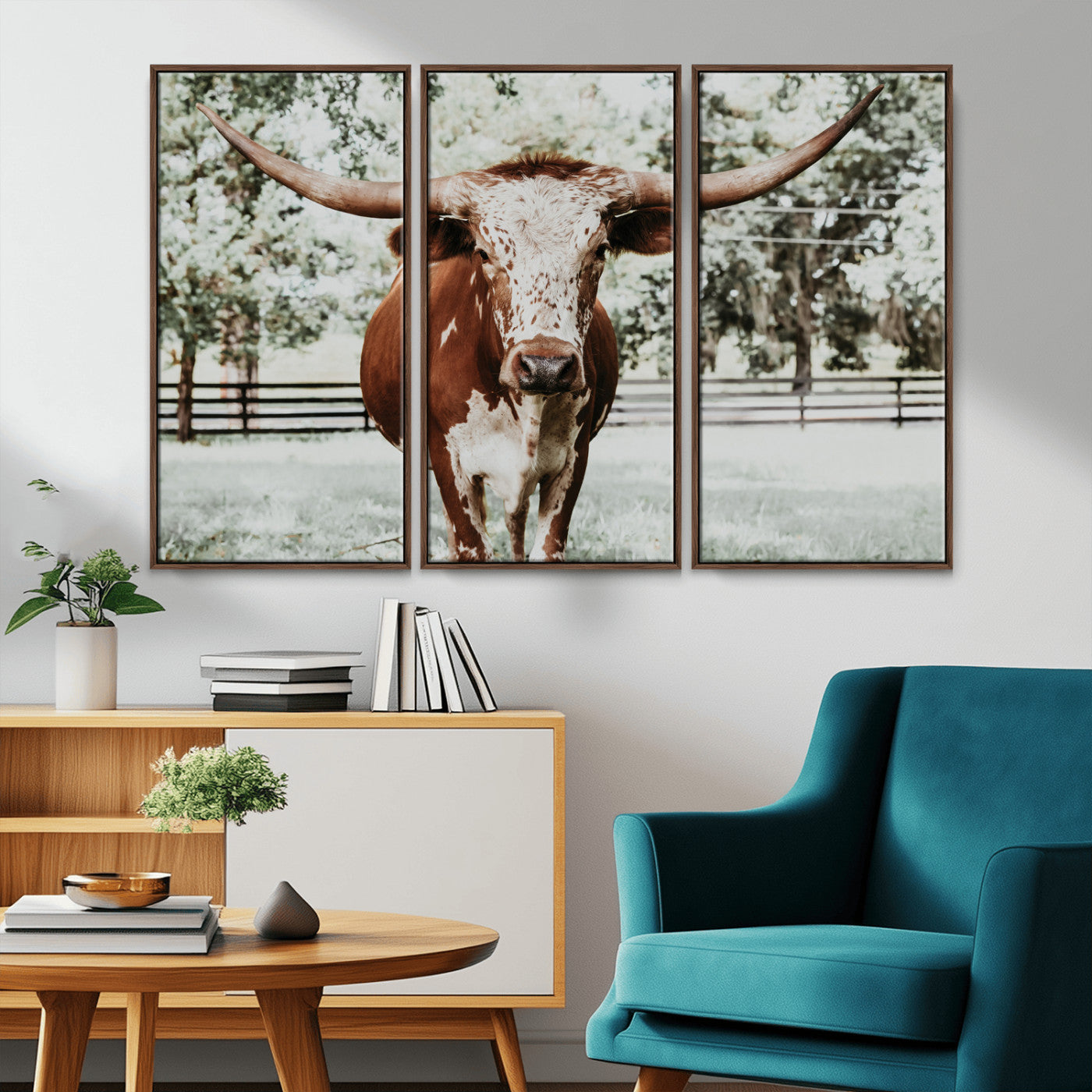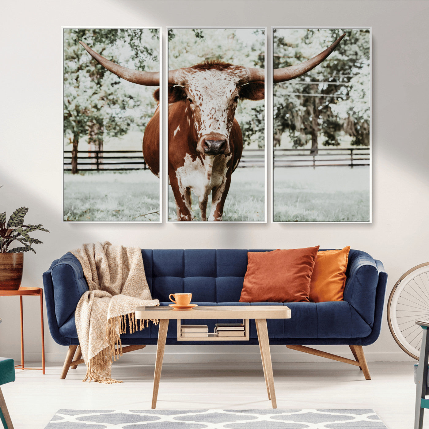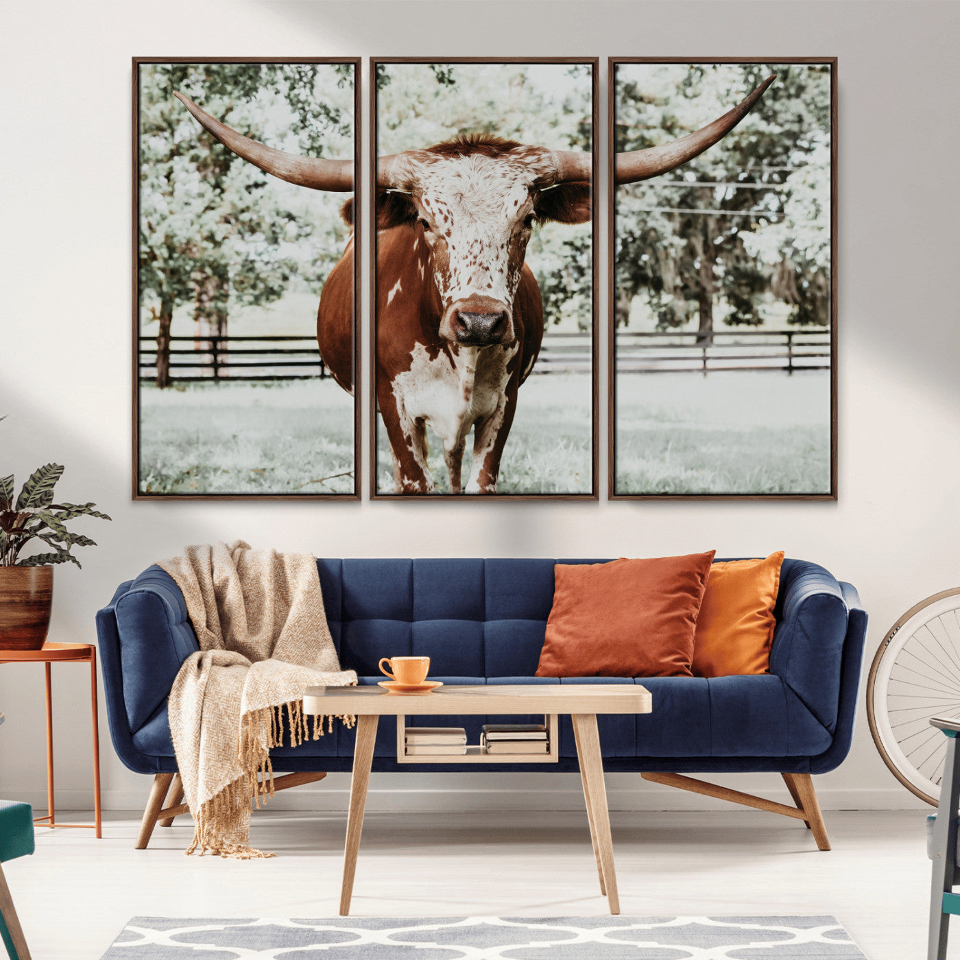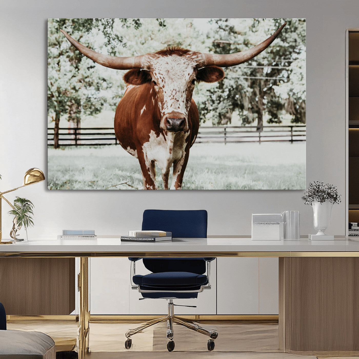 Texas Longhorn Wall Art Canvas Print – Framed Spotted Bull Rustic Western Horned Cattle Artwork for Home Office