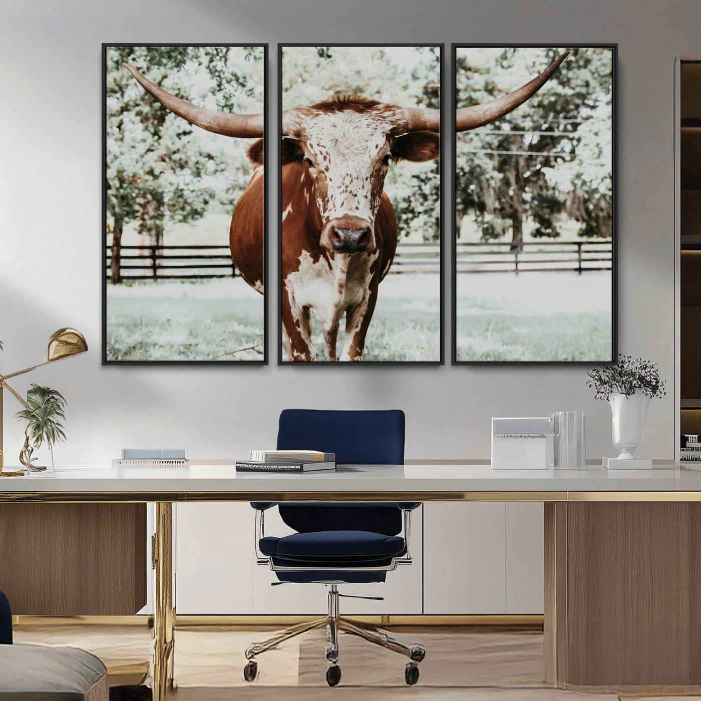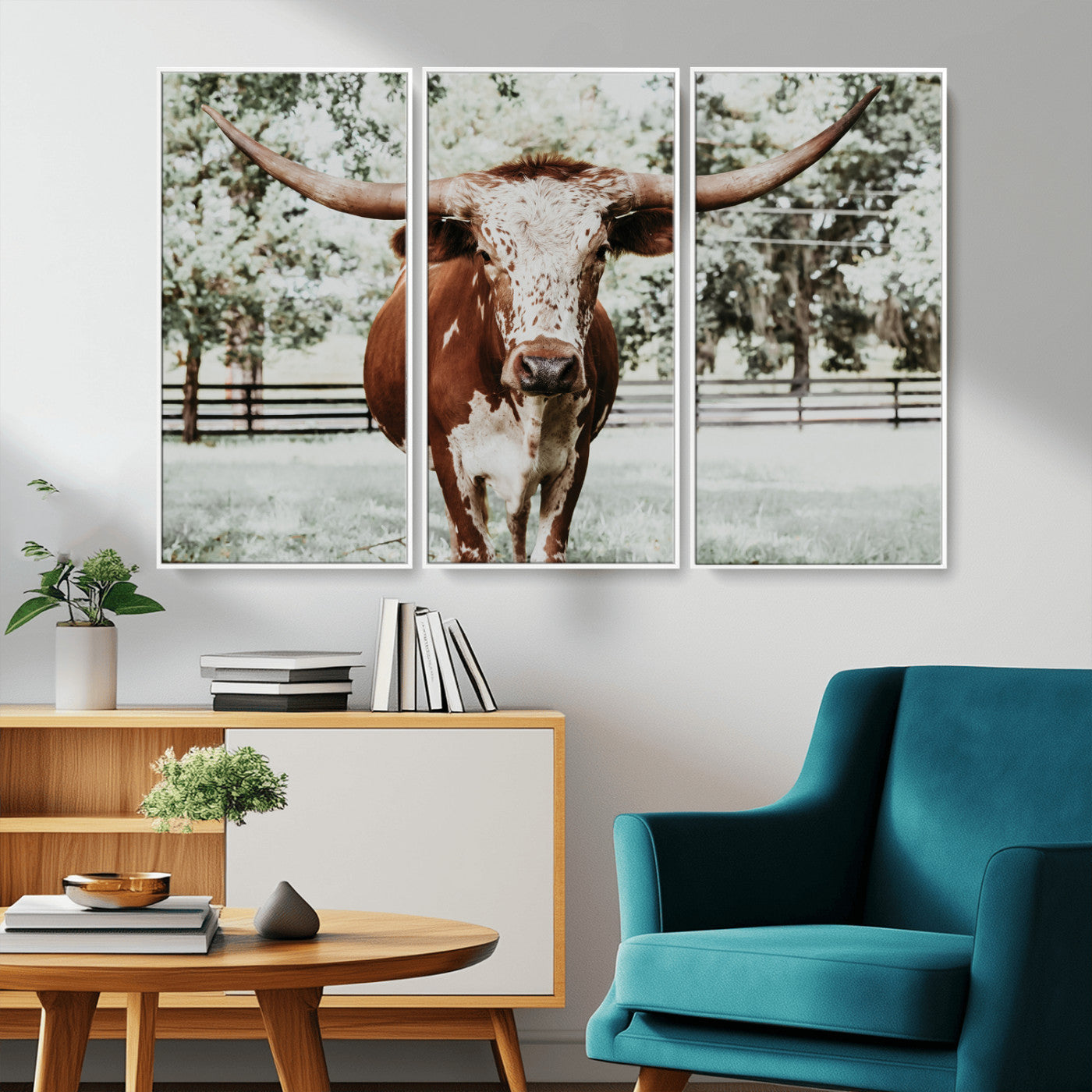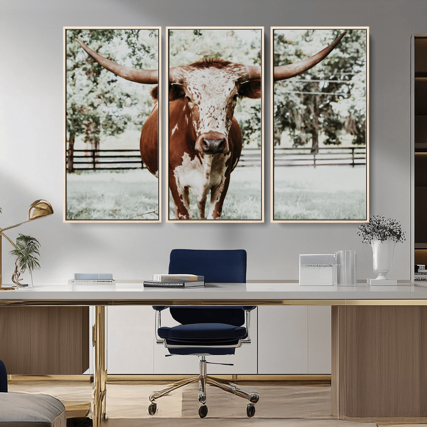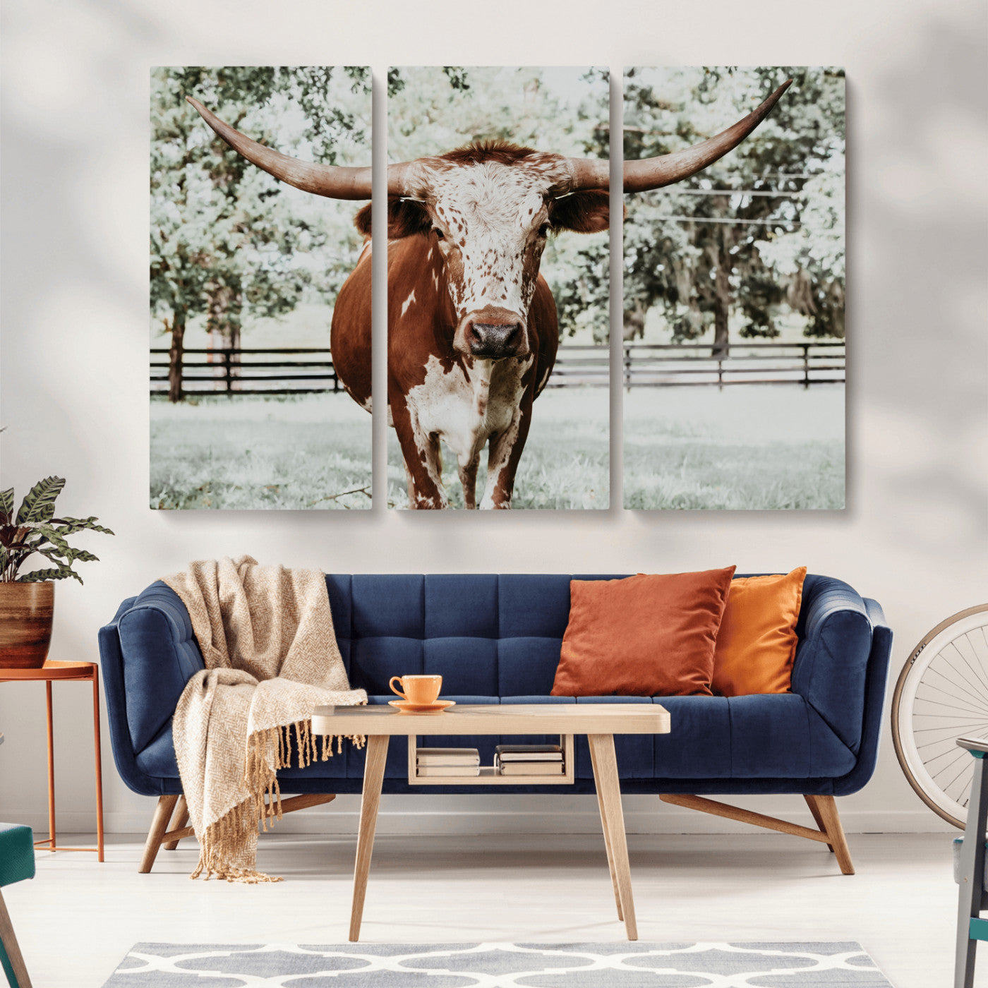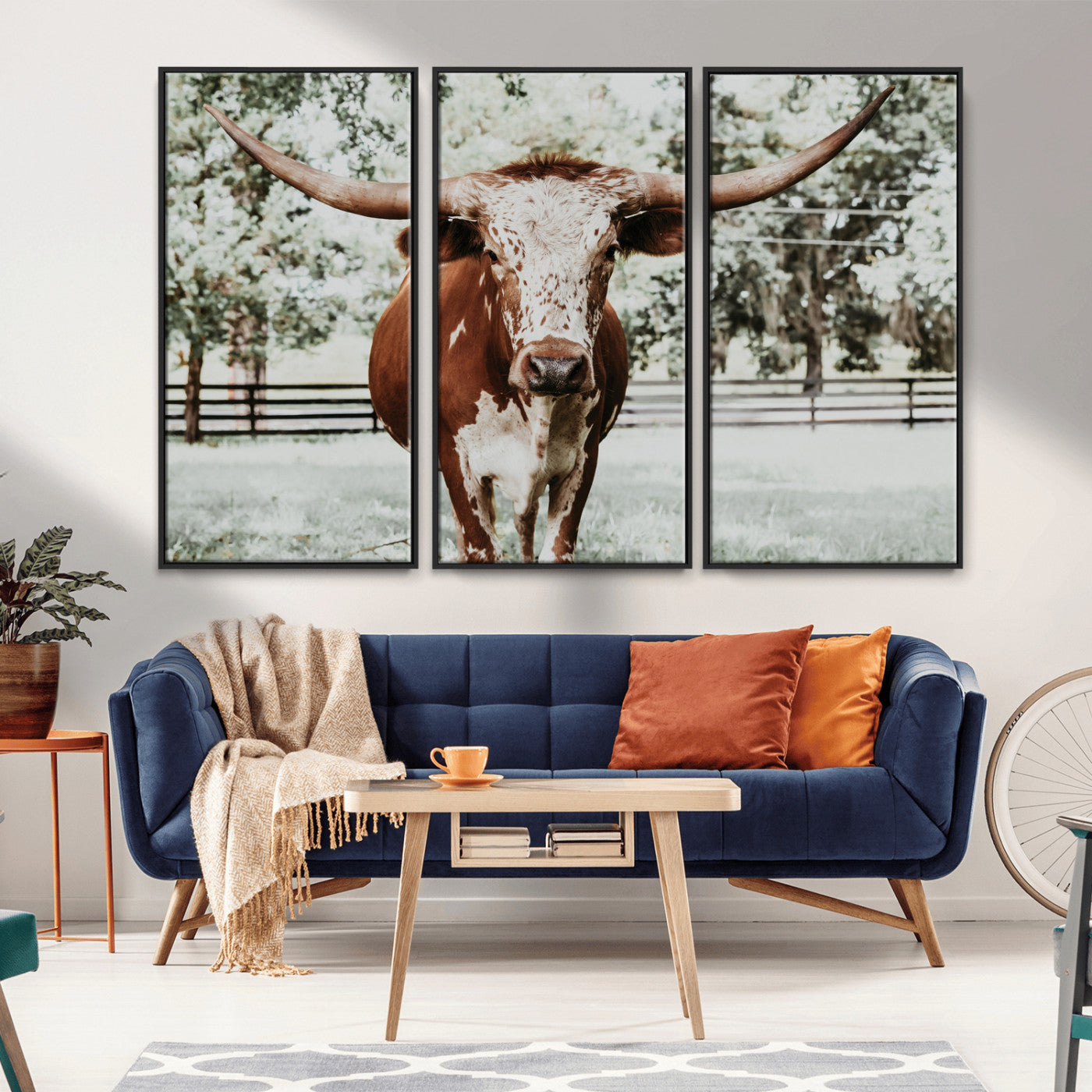 Texas Longhorn Wall Art Canvas Print – Framed Spotted Bull Rustic Western Horned Cattle Artwork for Home Office