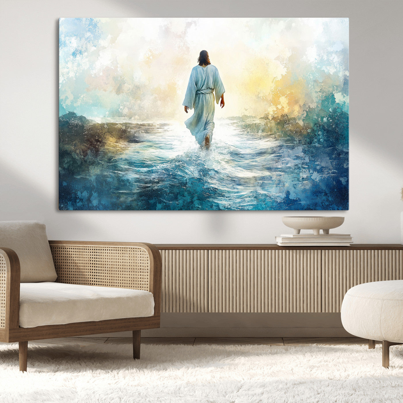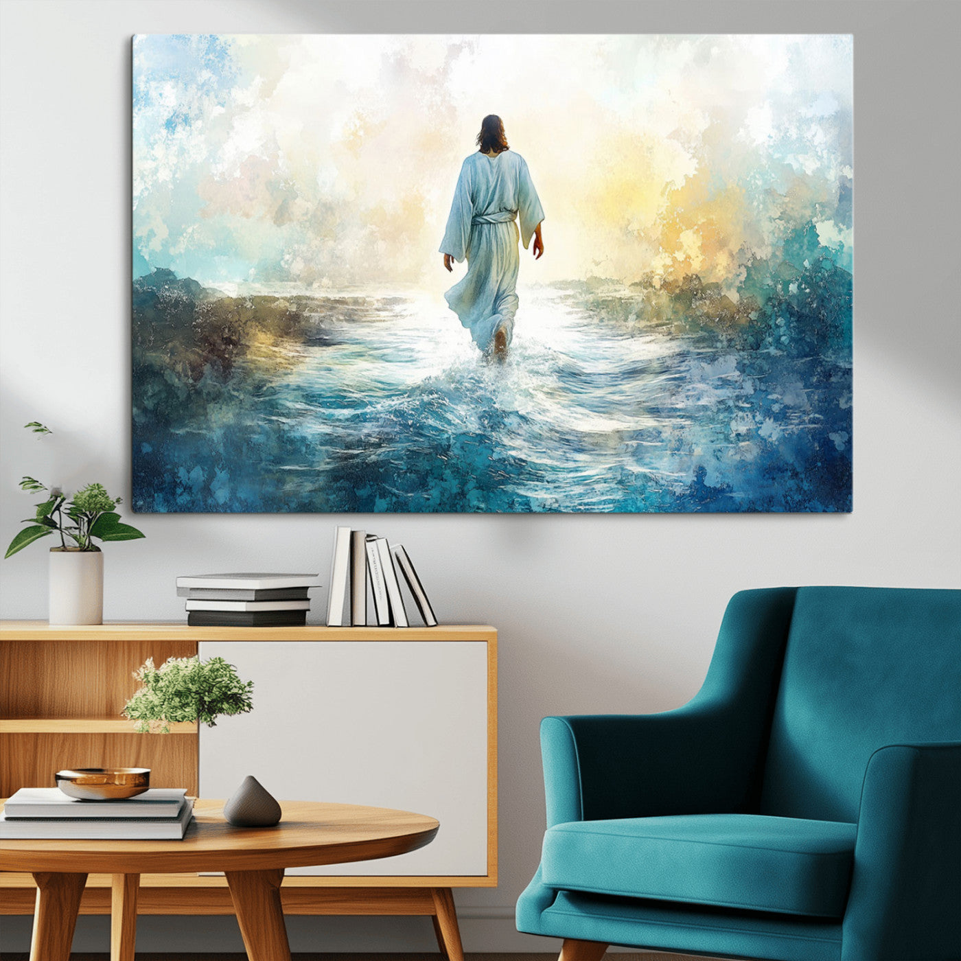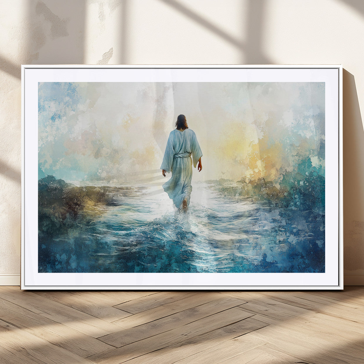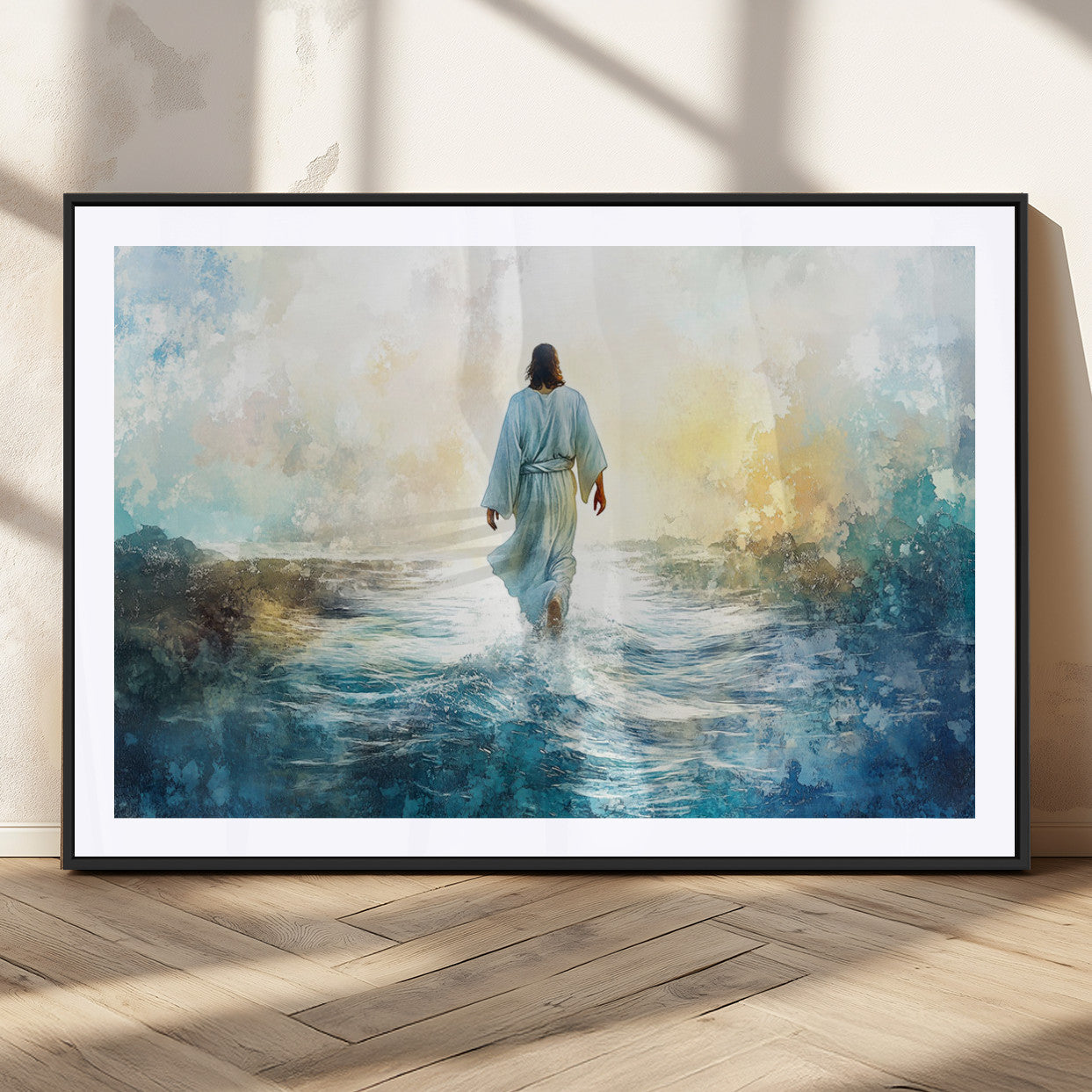 Watercolor Jesus Walking on Water Canvas Print, Christian Wall Art, Jesus Christ Walking